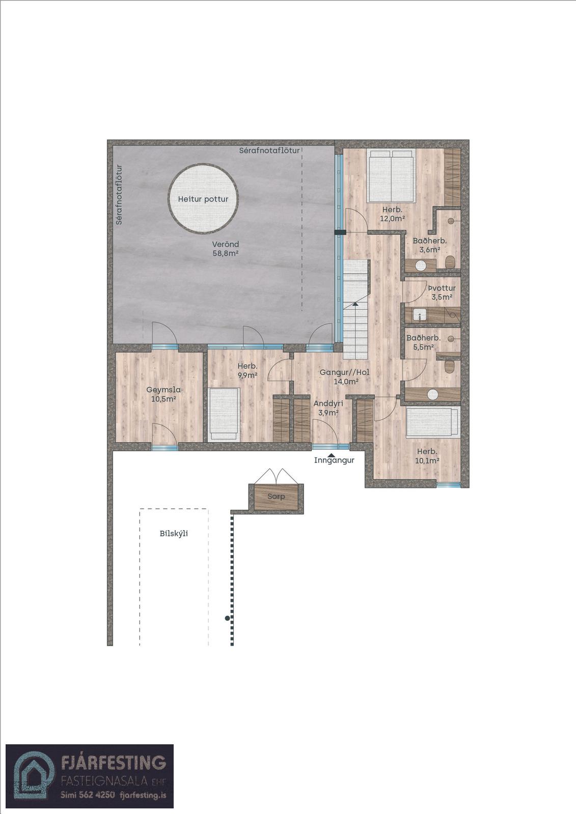Nánari lýsing: Neðri hæð: Komið er inn í forstofu með góðum fataskáp. Hjónaherbergi með fataherbergi/fataskápum og baðherbergi innaf með sturtu. Tvö góð barnaherbergi með fataskápum. Baðherbergi með flísum á gólfi og veggjum, sturtu með glerþili, innbyggðum vönduðum blöndunartækjum og fallegri innréttingu. Þvottahús með flísum á gólfi og innréttingu. Góð aflokuð verönd. Efri hæð: Eldhús með glæsilegri innréttingu og vönduðum eldhústækjum. Björt stofa og borðstofa, gengið út á stórar svalir. Mjög mikið og fallegt útsýni er af efri hæð. Gestasnyrting og búr.