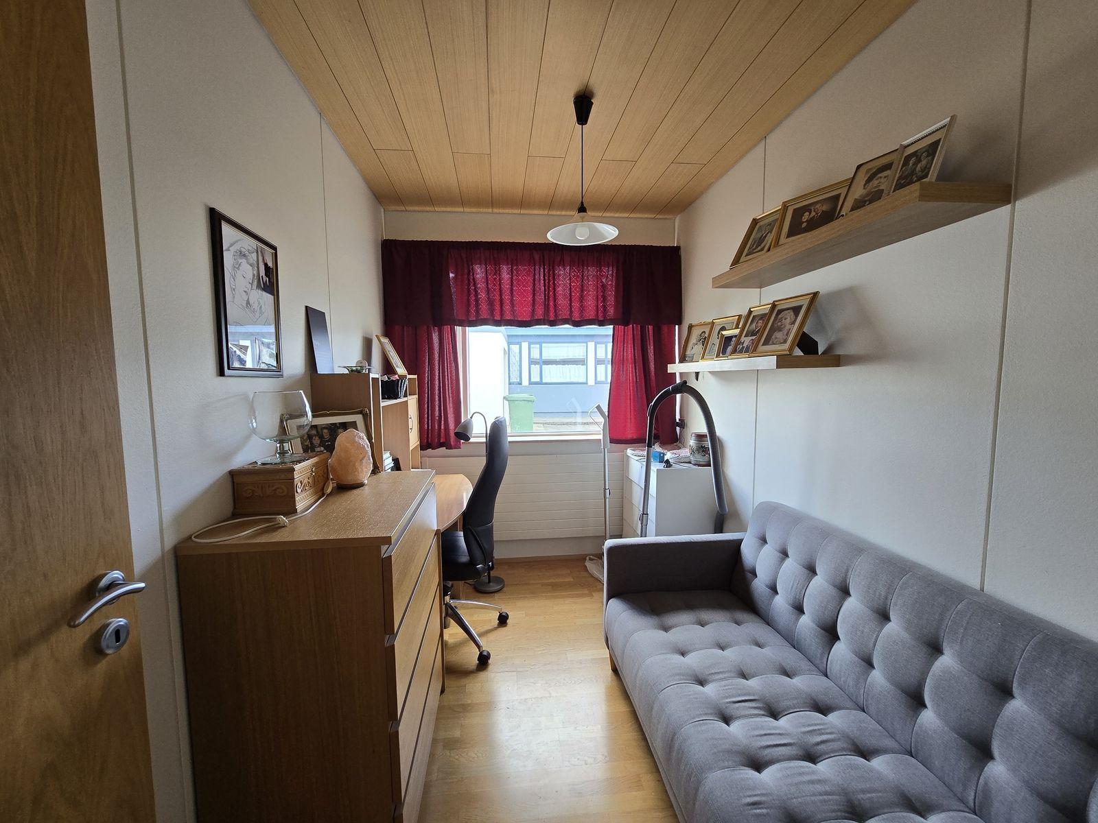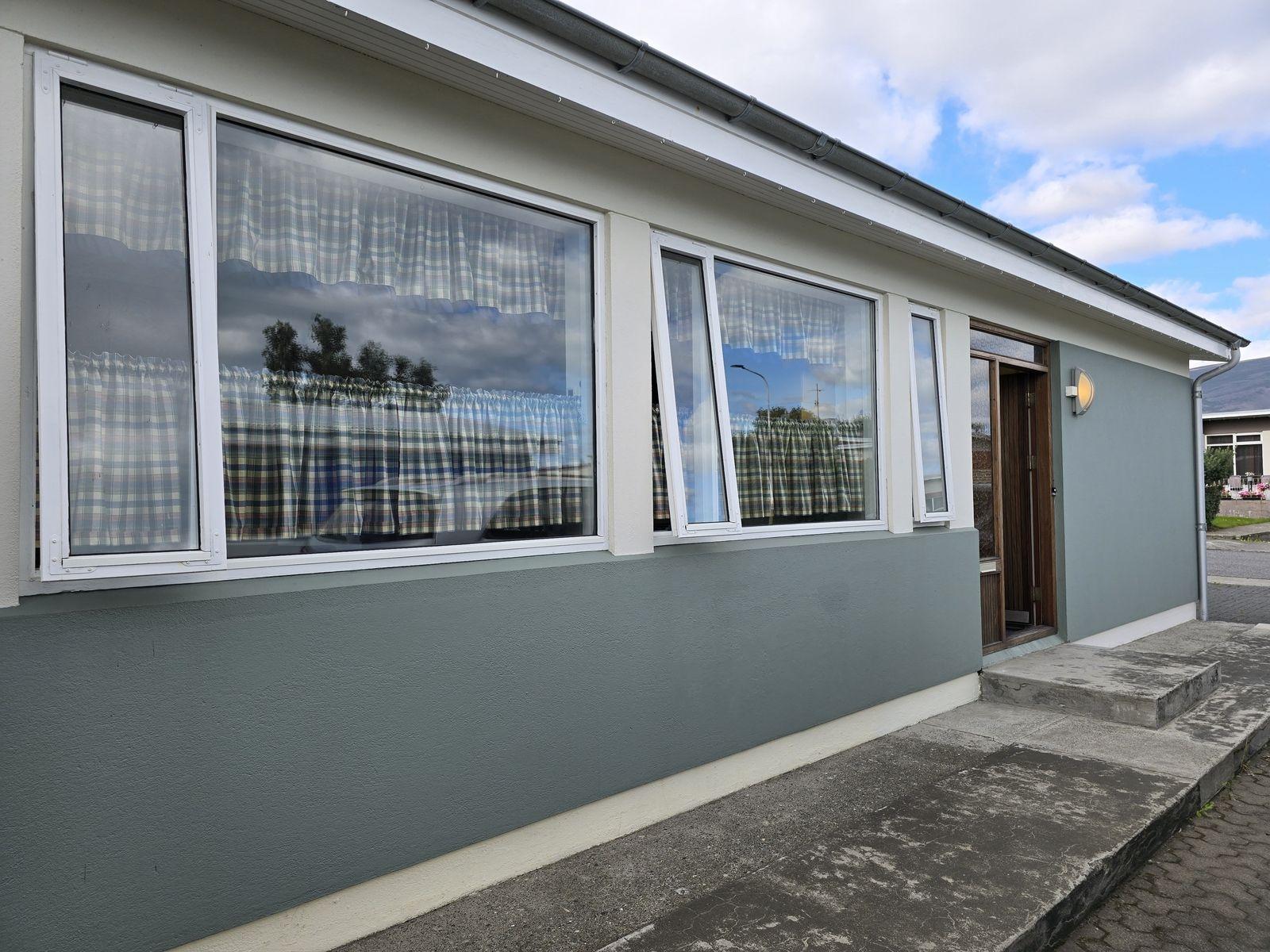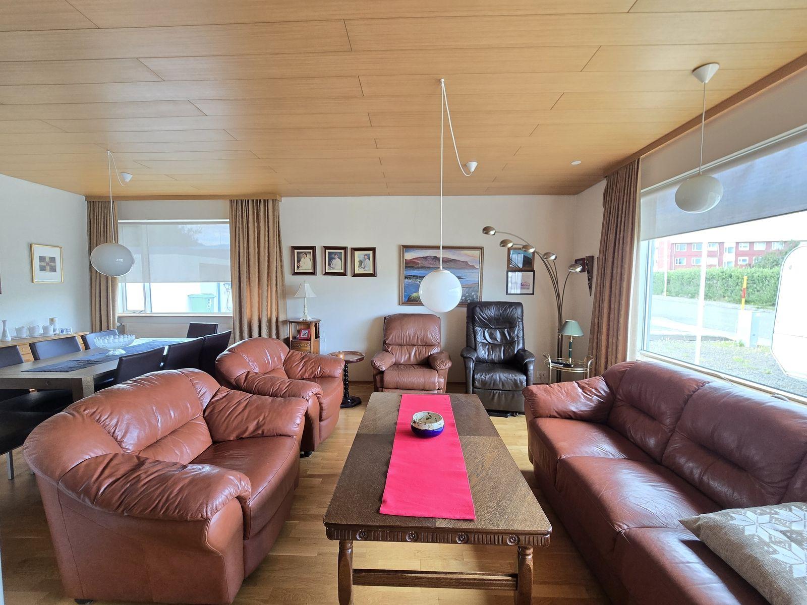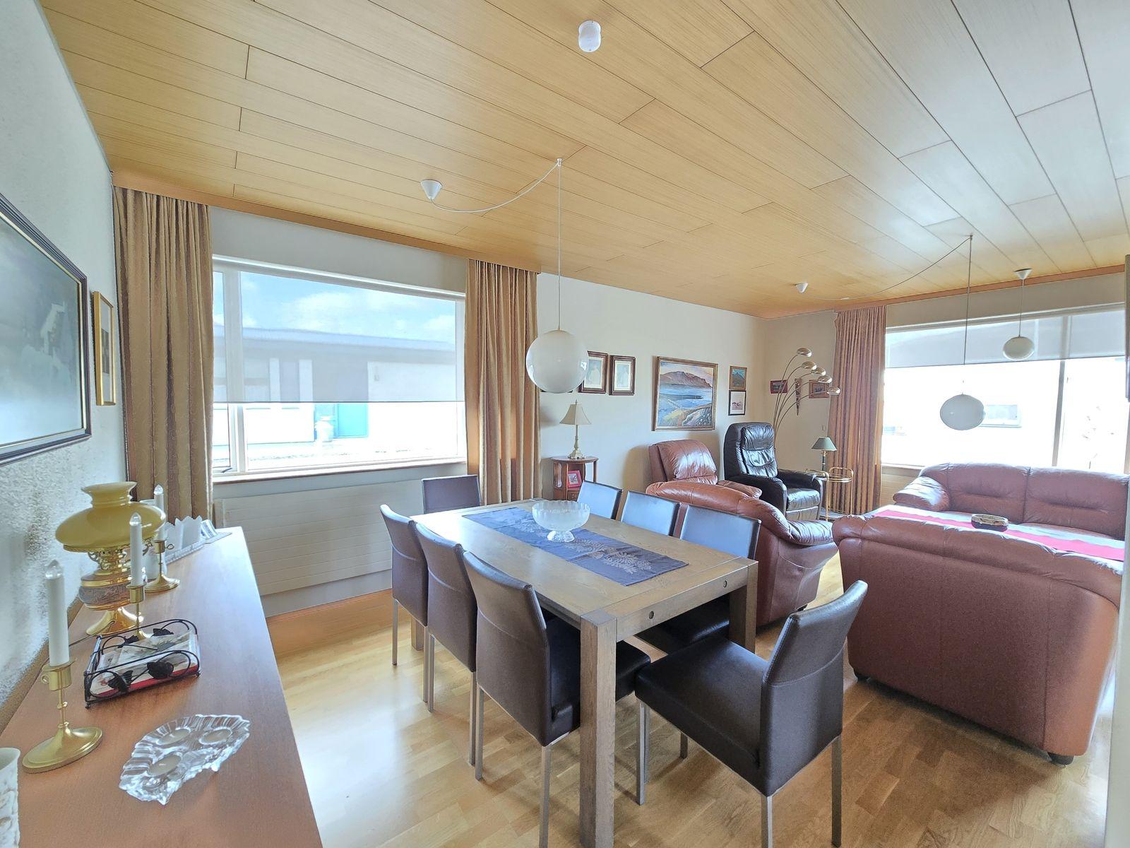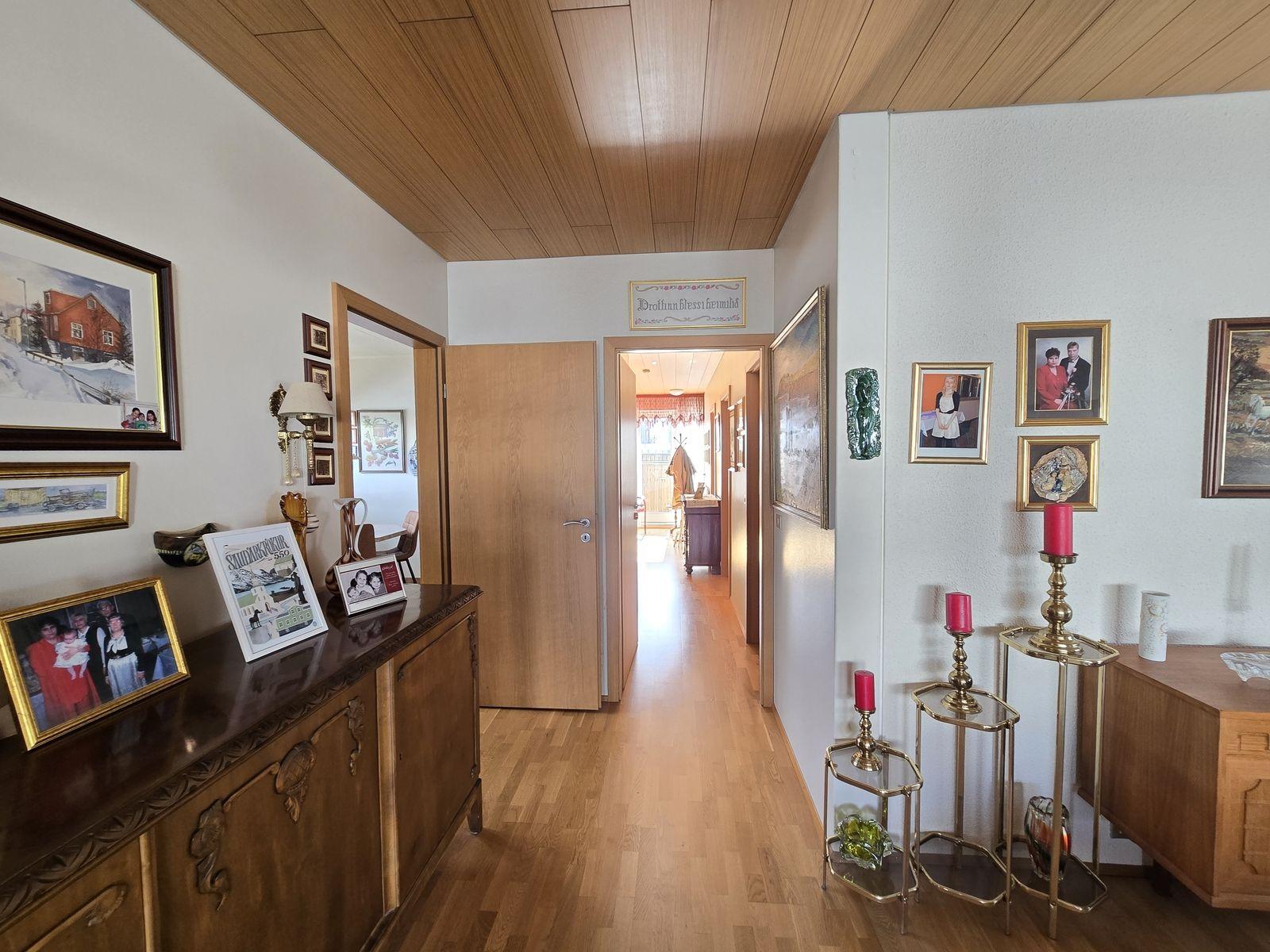 Íbúðarhúsið skiptist í 4 herbergi, stofu, eldhús, baðherbergi, gestasnyrtingu, forstofu og þvottahús. Gengið inn í flísalagða forstofu með fatahengi. Við forstofu er gestasnyrting og parketlagt herbergi með skápum. Frá forstofu er komið í parketlagt hol og þar við er stofa, eldhús og herbergisgangur. Stofa er parketlögð. Gluggar snúa til norður og vesturs. Eldhús er flísalagt og með upprunalegri innréttingu. Gott skápapláss. Frá eldhúsi er komið í þvottahús. Í þvottahúsi er vaskur. Útihurð frá þvottahúsi út á bílastæði. Hægt er að komast inn á herbergisgang frá þvottahúsi. Herbergisgangur parketlagður. Við ganginn eru 3 svefnherbergi og baðherbergi. Við enda gangsins er gengið út á pall sunnan við húsið. Herbergi eru öll parketlögð og skápar í hjónaherbergi. Á baðherbergi eru flísar á gólfi og veggjum, viðarinnrétting með ljósri borðplötu, stór sturta og baðkar.