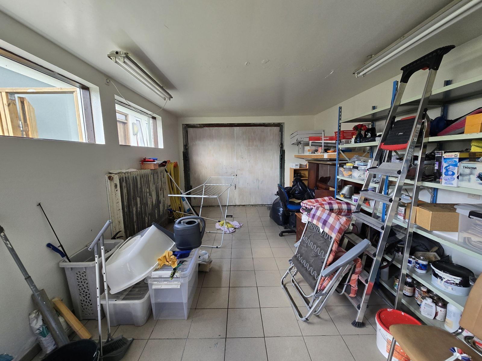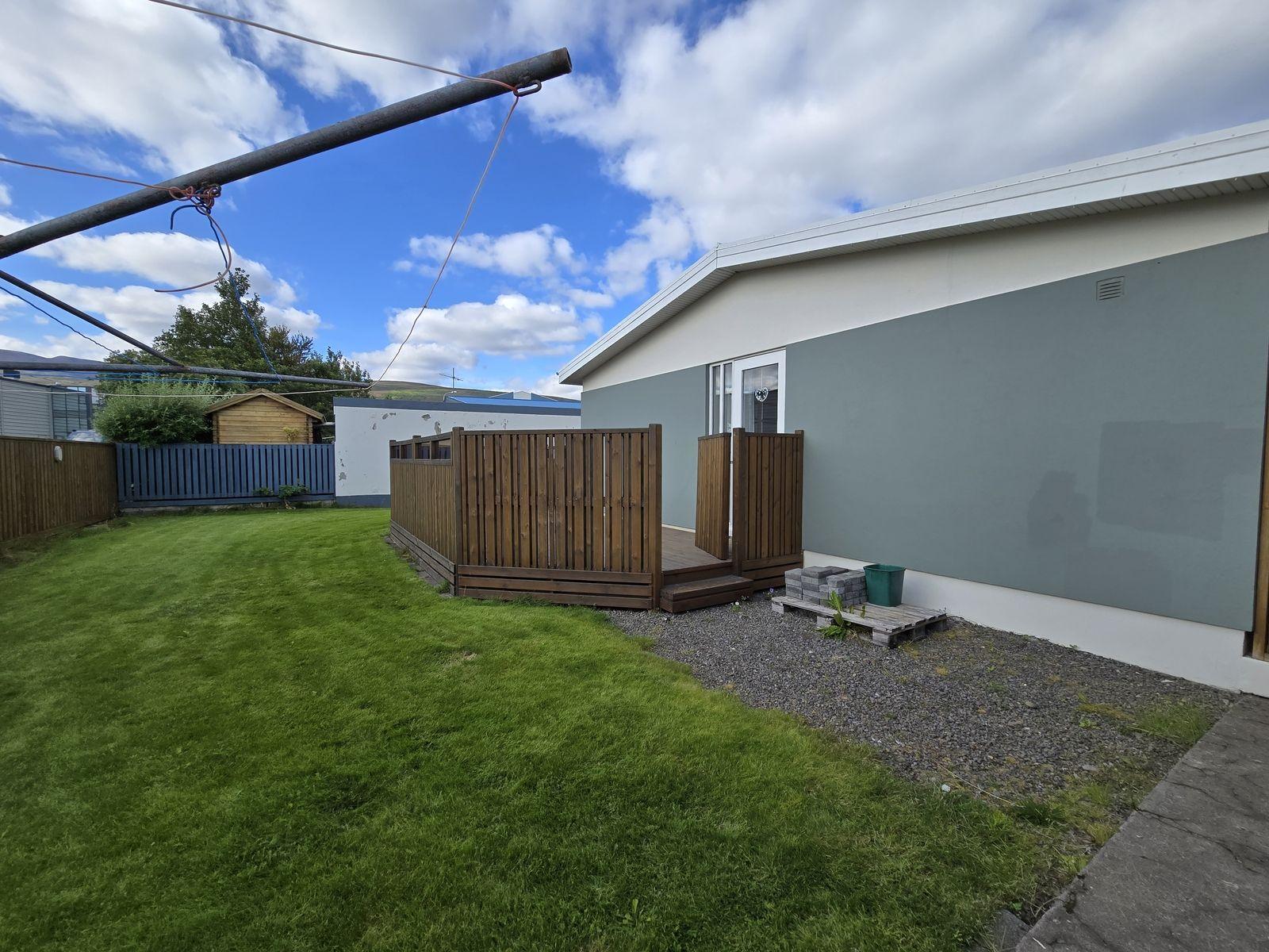 Að utan er húsið almennt í góðu ástandi. Það var nýlega málað. Bílskúr er staðsettur austan við húsið. Bílskúrshurð er upprunaleg. Í garði er góður pallur sunnan við húsið. Geymsla er byggð við bílskúrinn. Plan er hellulagt og hluti lóðar er malarborinn.
