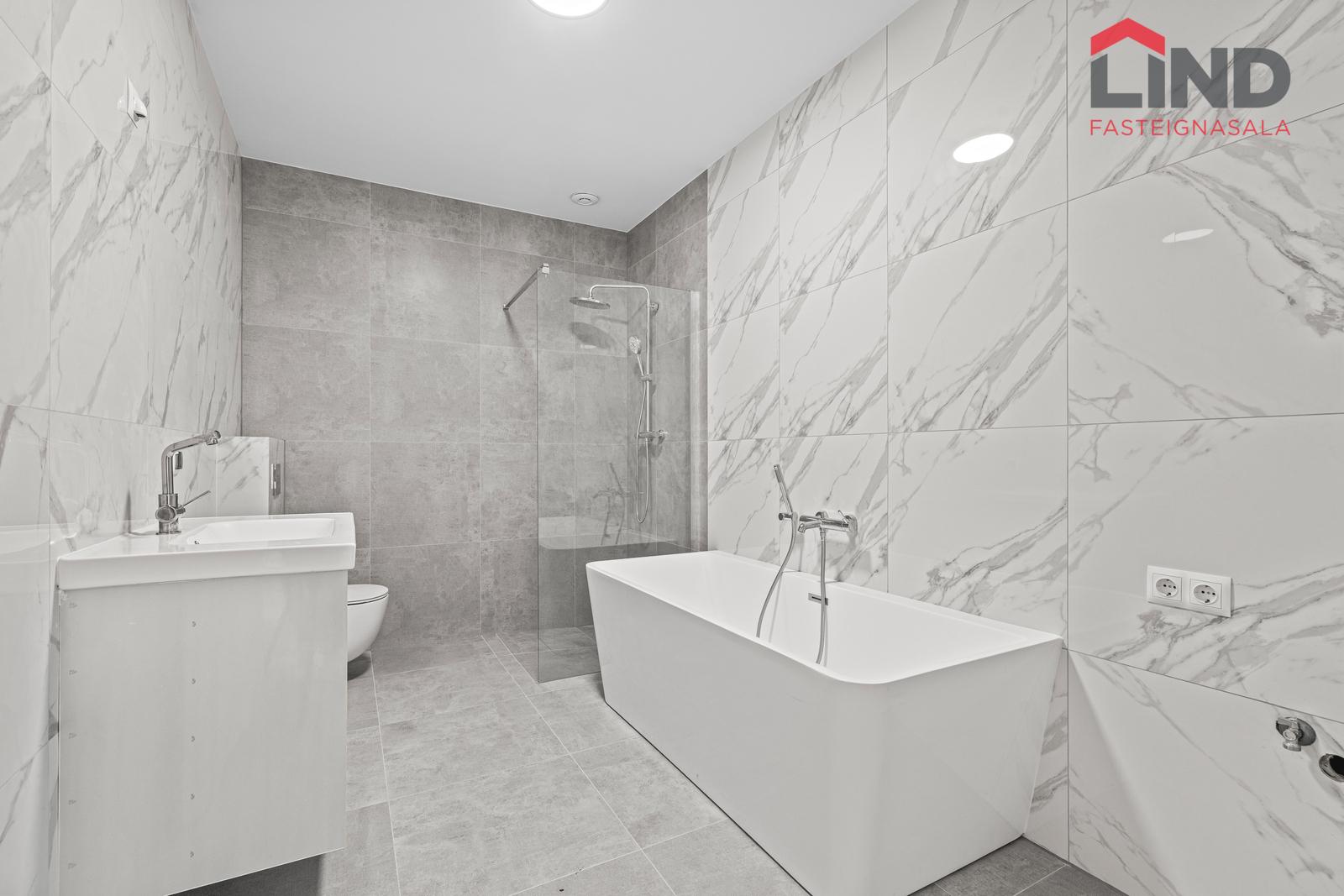 Innbyggðum ísskáp, uppþvottavél, bakaraofni í vinnuhæð og örbylgjuofni. Spanhelluborð með veggháf fyrir ofan. Baðherbergi 1: er flísalagt hólf í gólf. Hvít, upphengd innrétting með vaski.