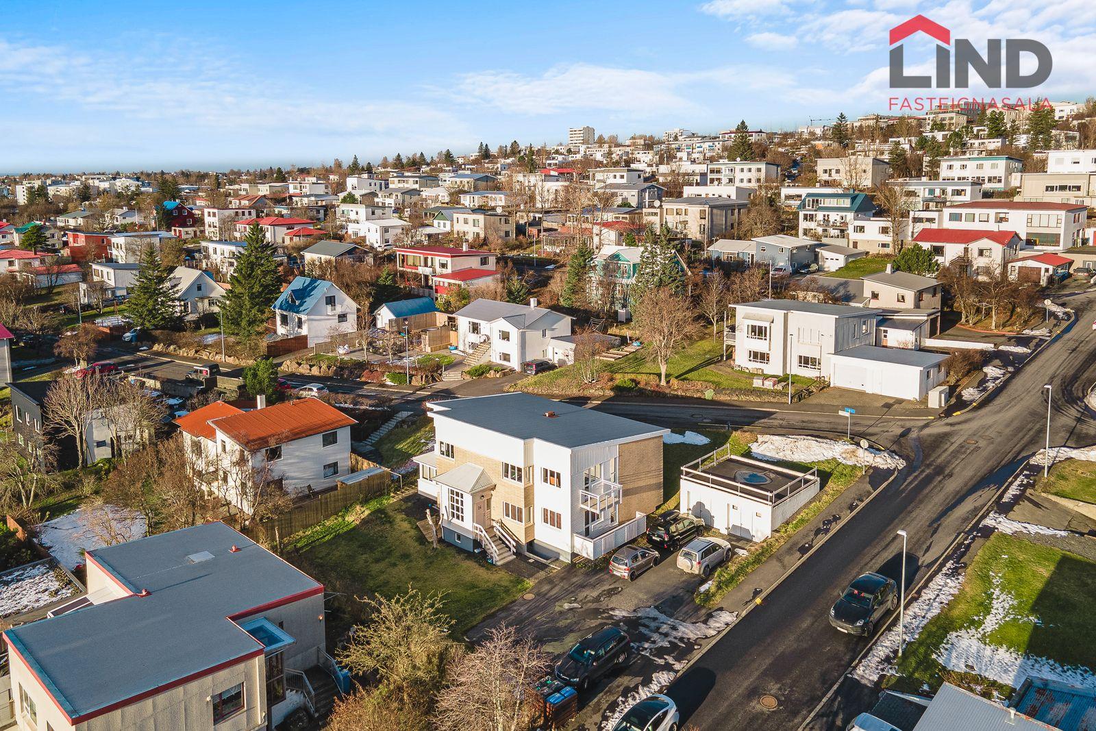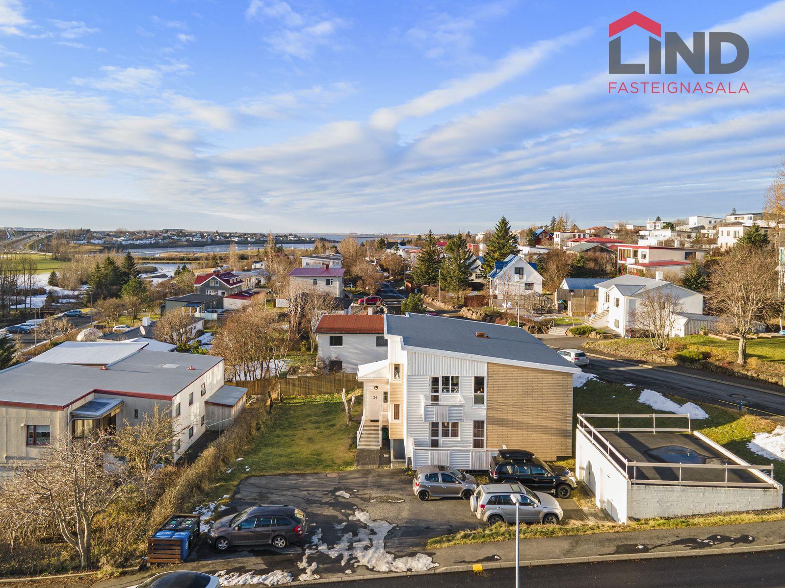 Lóðin er 900 fermetrar að stærð, snyrtileg með malbikuðum bílastæðum. Tyrfð lóð beggja vegna við húsið og hekk á lóðarmörkum til suðurs.