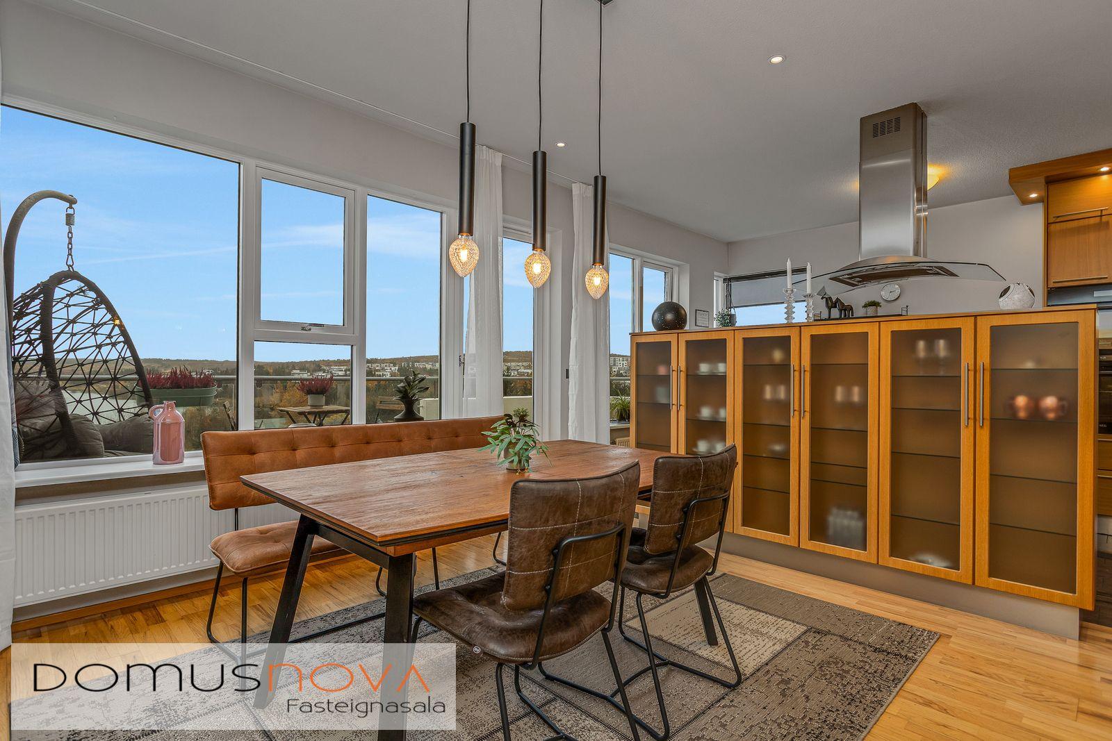 Domusnova fasteignasala hefur fengð glæsilega og bjarta 135,8fm íbúð með stórfenglegu útsýni í einkasölu, íbúðin er efri hæð í fjórbýlishúsi og er við Fellhvarf 10 með útsýni yfir Elliðavatn, útá Reykjanes og uppí Bláfjöll. Göngu- og reiðleiðir skammt undan og útivistarparadísin við Elliðavatn steinsnar í burtu. Róleg gata og skóli og leikskóli skammt undan og stutt í aðra þjónustu og leiðir útúr bænum. Íbúðin er 4-5 herbergja skv. teikningu en hluti stofu hefur verið gerður að herbergi (með afturkræfum hætti) og eru því 4 svefnherbergi í íbúðinni auk borðstofu og stofu/sjónvarprýmis, tveggja baðherbergja, geymslu og þvottahúss. Lofthæð er 2,7m. Örstutt er í alla þjónustu, skóla, leikskóla og frábærar göngu- og reiðleiðir allt í kring. Góð eign á þessum eftirsótta og frábæra stað. Fasteignamat næsta árs er kr. 91.350.000.Íbúðin er á efri hæð og gengið upp tröppur vestan á húsinu. Húsið er tveggja hæða og eru 4 íbúðir í því, tvær á jarðhæð og tvær á 2. hæð. Þegar inn er komið er komið í´rúmgott anddyri með skáp. Svefnherbergi með skáp til vinstri og þvottahús með góðri innréttingu til hægri. Inn úr anddyri er gengið inn í alrými sem er gangur, stofa/sjónvarpsstofa, borðstofa og eldhús á hægri hönd. Beint af augum er gangur en úr honum aðgengi í tvö svefnherbergi, gestasalerni og baðherbergi. Hluti stofunnar er nýttur sem svefnherbergi og er frábært útsýni úr því rými, auðvelt er að bæta því við stofuna aftur. Suðurvalir eru 11,6fm og er útsýni þar afar fallegt og útgengi er úr rýminu á svalirnar. Sama fljótandi eikarparketið er á öllum gólfum nema votrýmum, eldhúsi og anddyri.