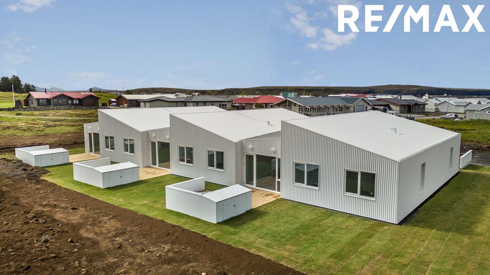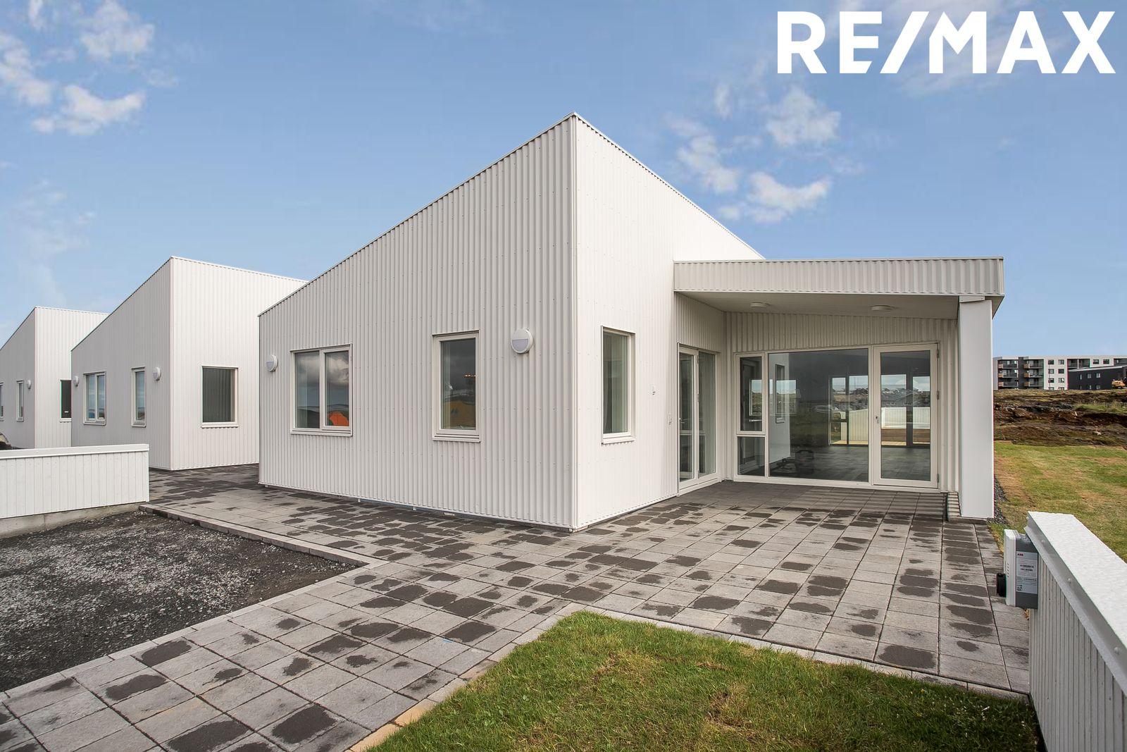 Nánari lýsing eignar: Forstofa: Er með flísum á gólfum og rúmgóðum fataskápum. Stofa og borðstofa er í opnu alrými með eldhúsi, rúmgóð stofa með útgengi á sólpall sem klæddur er með fallegu lerki, búið er að koma fyrir heitum pott, lofthæð innan eignarinnar á hæsta punkt eru um fjórir metrar og setur það mikinn svip á stofuna. Innfelld lýsing þar sem á við. Eldhús: er opið við stofu. Eldhúsinnrétting er hvít melamine með ljósri Quartz borðplötu. Með hverri íbúð fylgir span helluborð með gufugleypi, bakarofn, örbylguofn, innbyggð uppþvottavél og ísskápur með frysti. Svefnherbergi eru fjögur talsins þeim fylgja fataskápar í sama lit og efni og er á eldhúsinnréttingu. Parket á gólfum. Baðherbergi: Er flísalagt í hólf og gólf með 60x60 flísum, upphengt salerni, sturtuklefi og innrétting við vask með ljúflokun á skúffum, tengi fyrir þvottavél og þurrkara. Þvottahús / Geymsla er með flísum á gólfi, innrétting með tengi fyrir þvottavél og þurrkara.