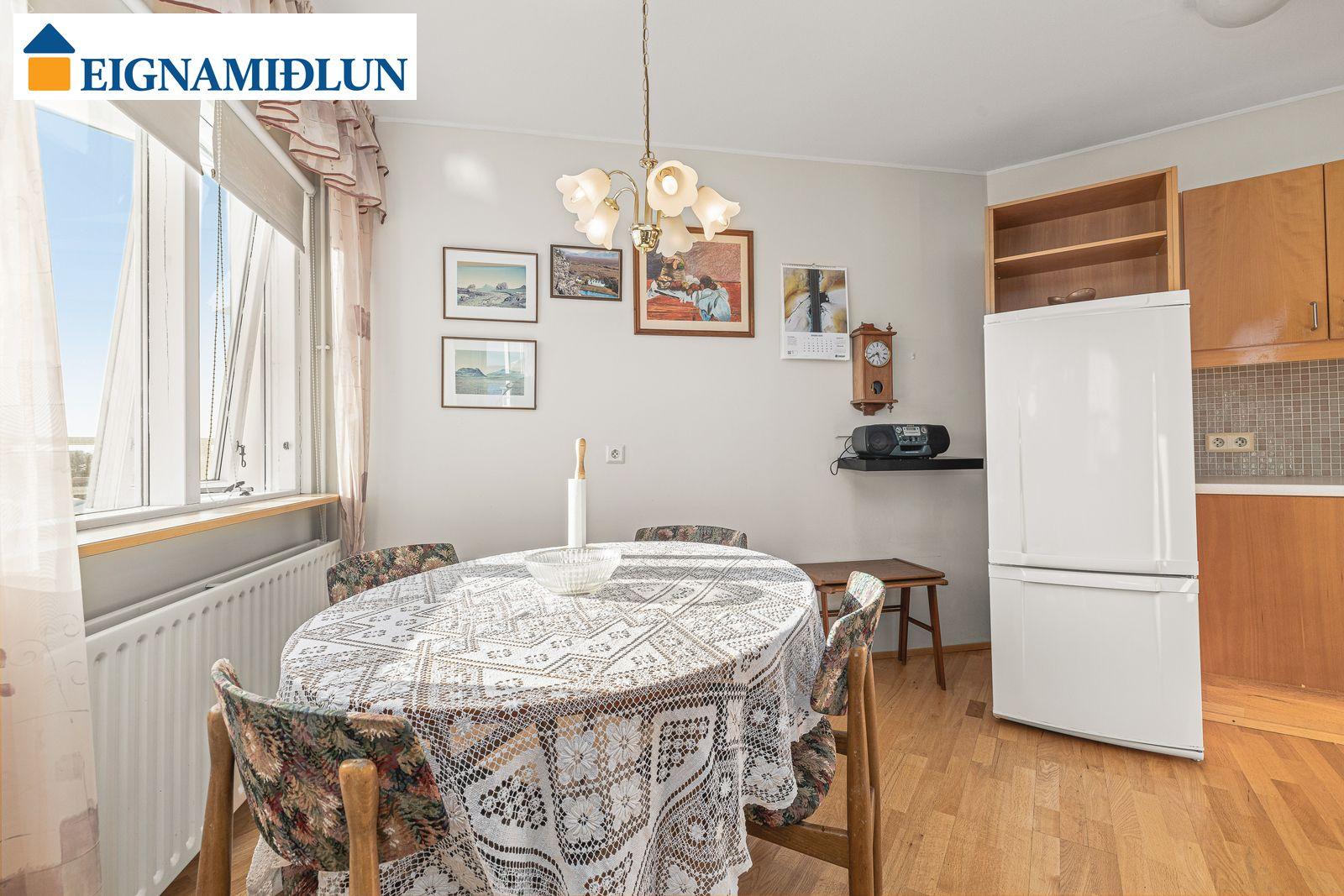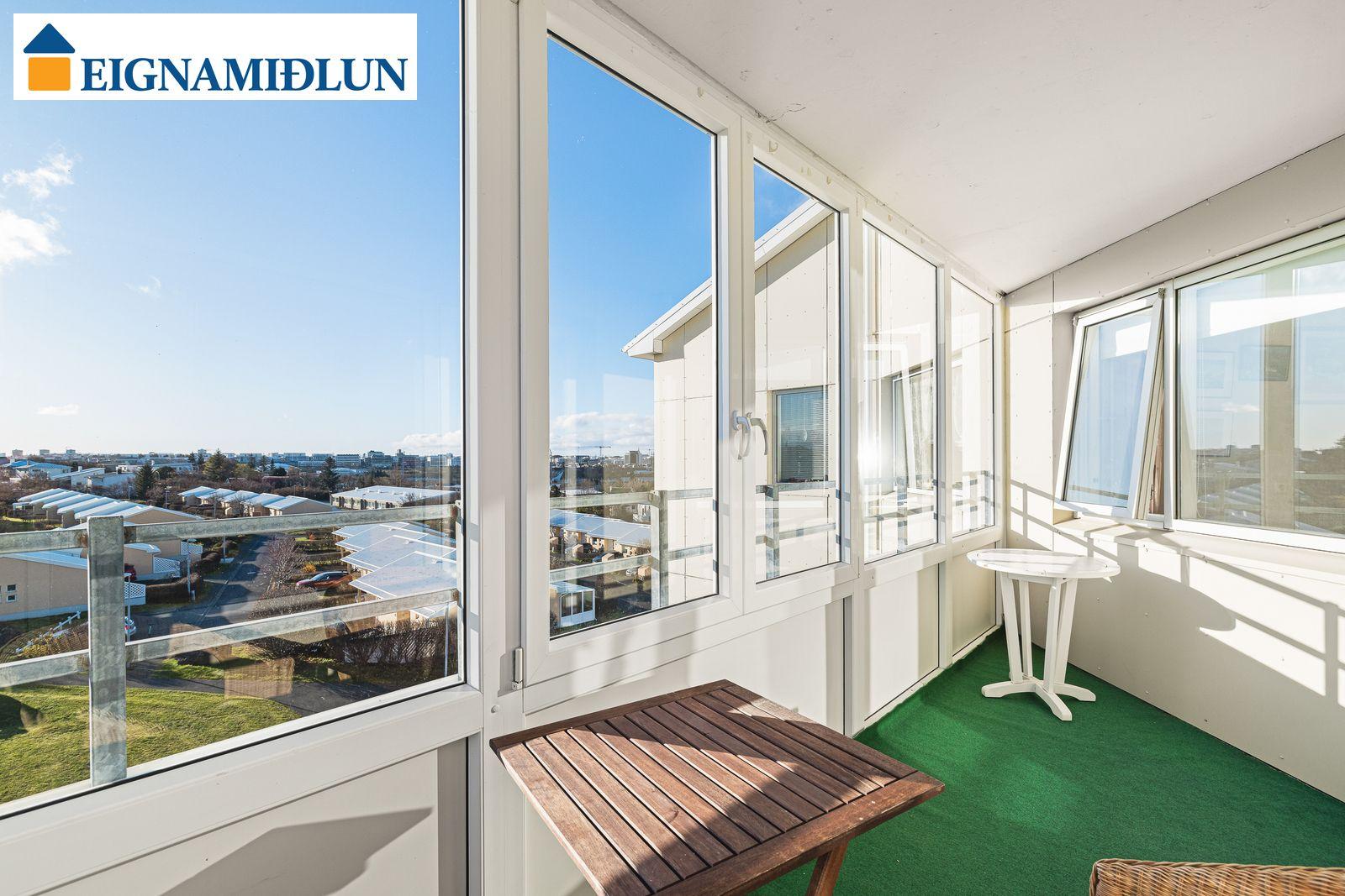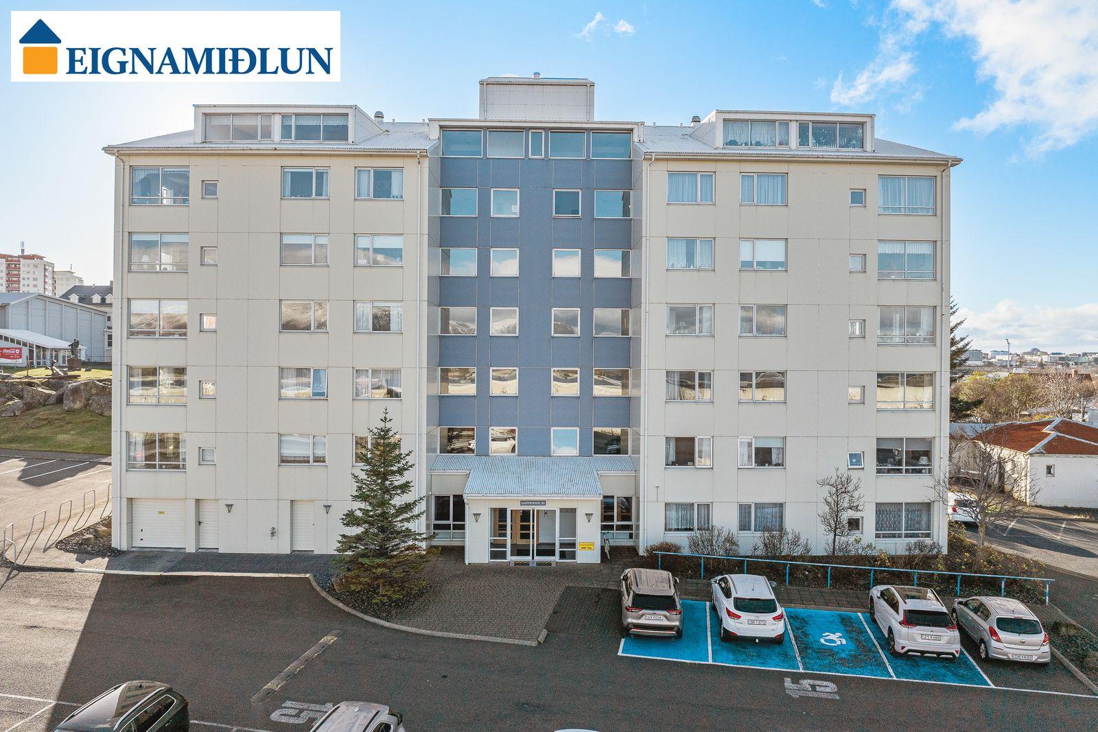 Smelltu hér til að sækja söluyfirlit: Nánari lýsing: Forstofa: Komið er inn í parketlagða forstofu með skápum. Stofa: Stofan er parketlögð. Yfirbyggðar suðursvalir eru út af stofu. Glæsilegt útsýni. Eldhús: Ljós innrétting er í eldhúsi. Stór borðkrókur. Gólf er parketlagt. Herbergi : Rúmgott hjónaherbergi með skápum og dúk á gólfi. Baðherbergi: Sturta er á baðherbergi. Ljós innrétting við vask. Veggir eru flísalagðir en gólf dúklagt. Geymsla/þvottahús: Frá forstofu er gengið í geymslu/þvottahús. Geymsla: Sér geymsla frá sameign á 1. hæð.