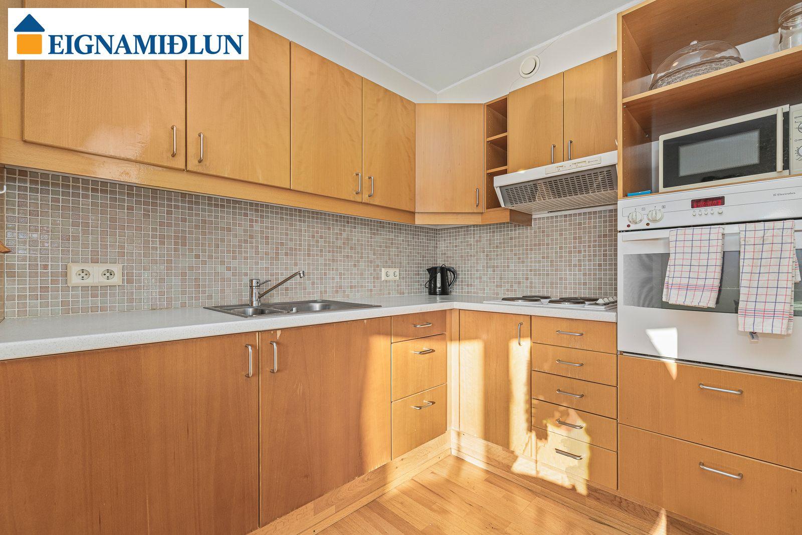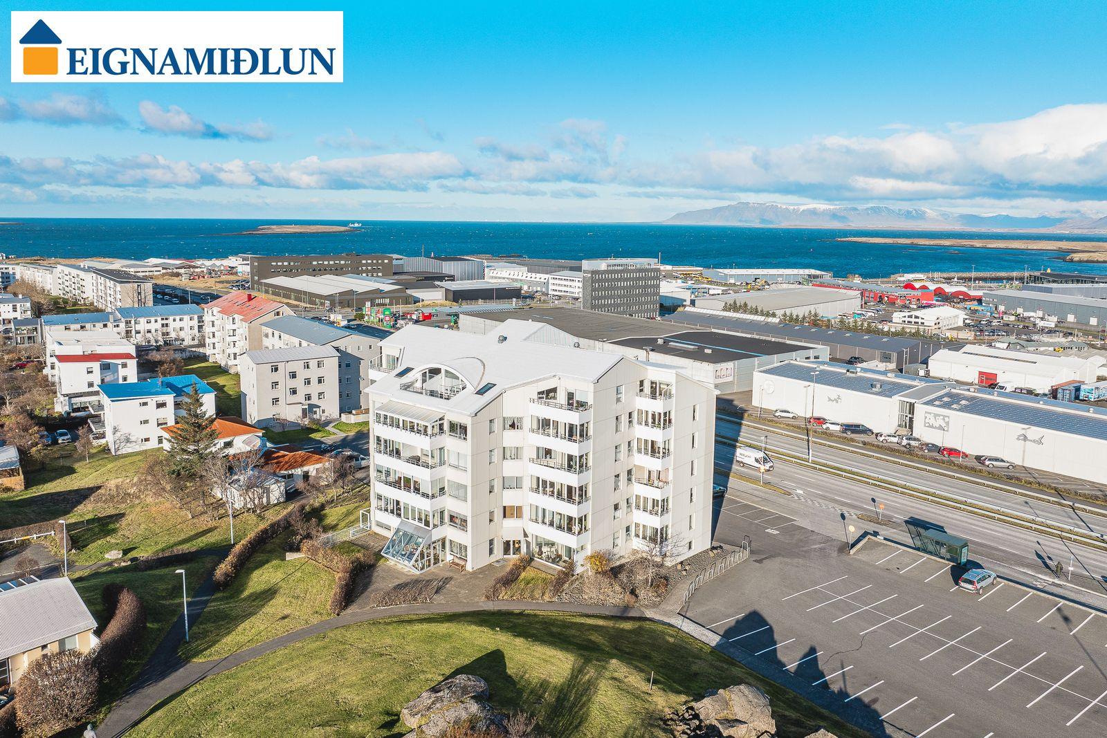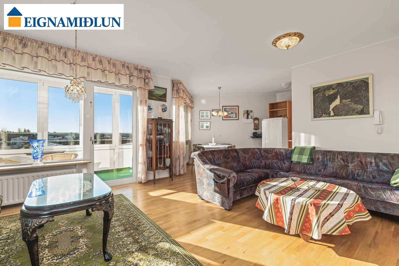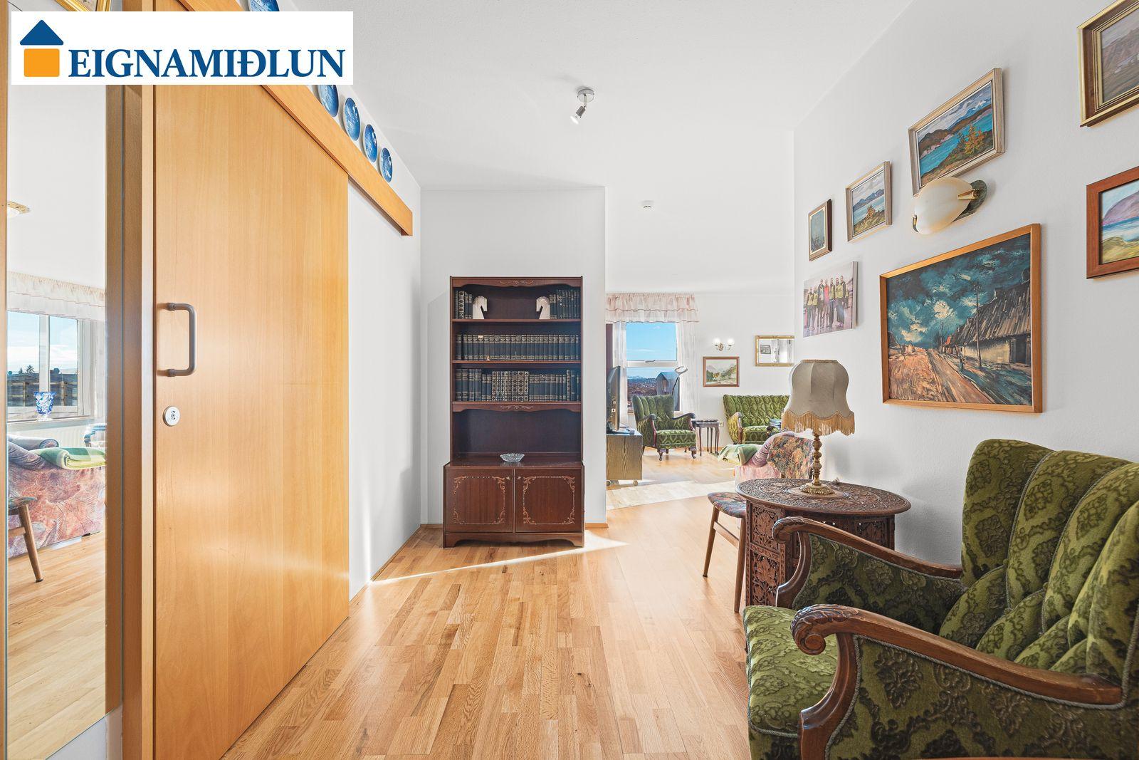 Smelltu hér til að sækja söluyfirlit: Nánari lýsing: Forstofa: Komið er inn í parketlagða forstofu með skápum. Stofa: Stofan er parketlögð. Yfirbyggðar suðursvalir eru út af stofu. Glæsilegt útsýni. Eldhús: Ljós innrétting er í eldhúsi. Stór borðkrókur. Gólf er parketlagt. Herbergi : Rúmgott hjónaherbergi með skápum og dúk á gólfi. Baðherbergi: Sturta er á baðherbergi. Ljós innrétting við vask. Veggir eru flísalagðir en gólf dúklagt. Geymsla/þvottahús: Frá forstofu er gengið í geymslu/þvottahús. Geymsla: Sér geymsla frá sameign á 1. hæð.