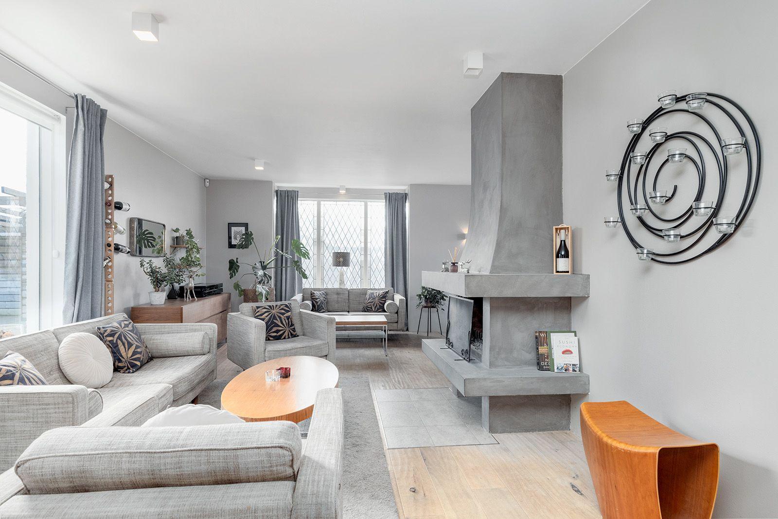 Stofa: Björt og rúmgóð stofa með glæsilegum arni. Parket á gólfi.