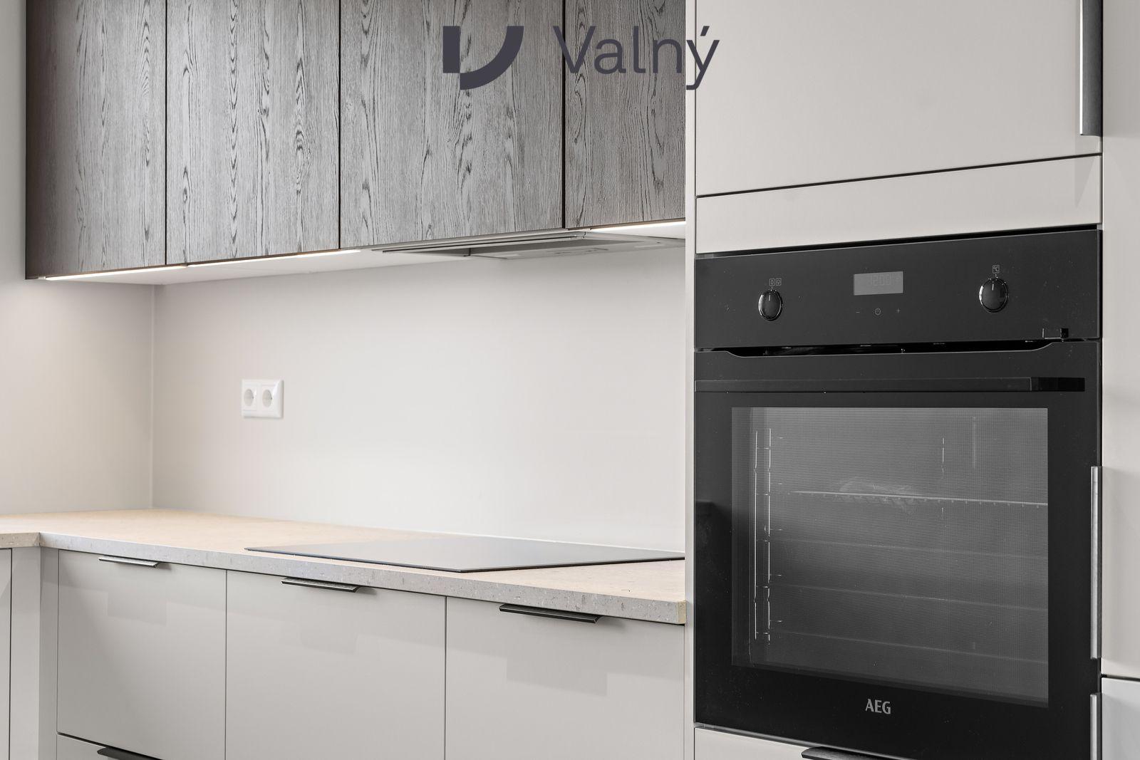 Eldhús með sérsmíðaðri innréttingu með innbyggðum ísskáp og uppþvottavél, bakaraofni í vinnuhæð og helluborði.