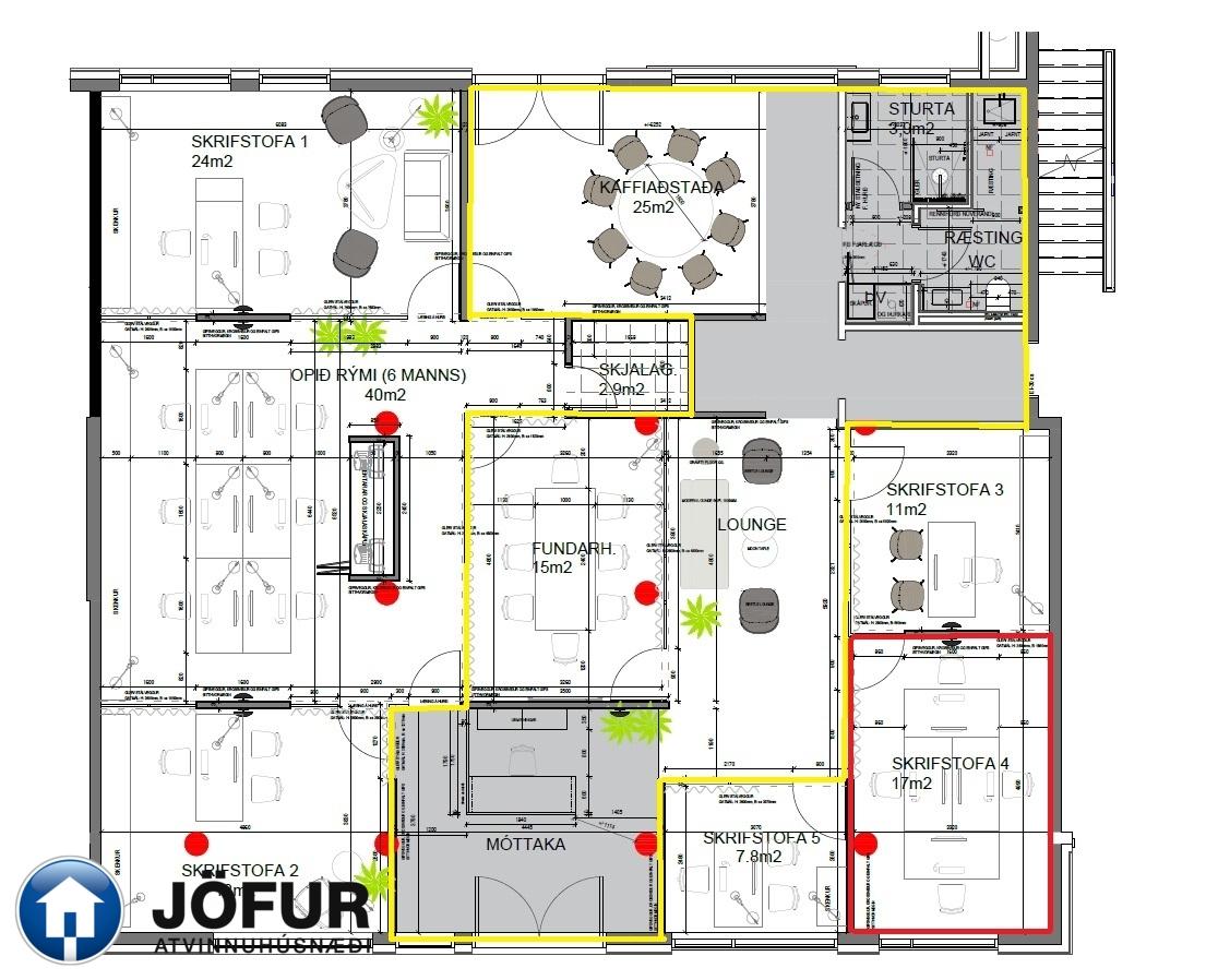 Sjá teikningu, gult er sameiginlegt rými sem leigjandi hefur aðgang og not af. Rautt er sérrými leigjanda.