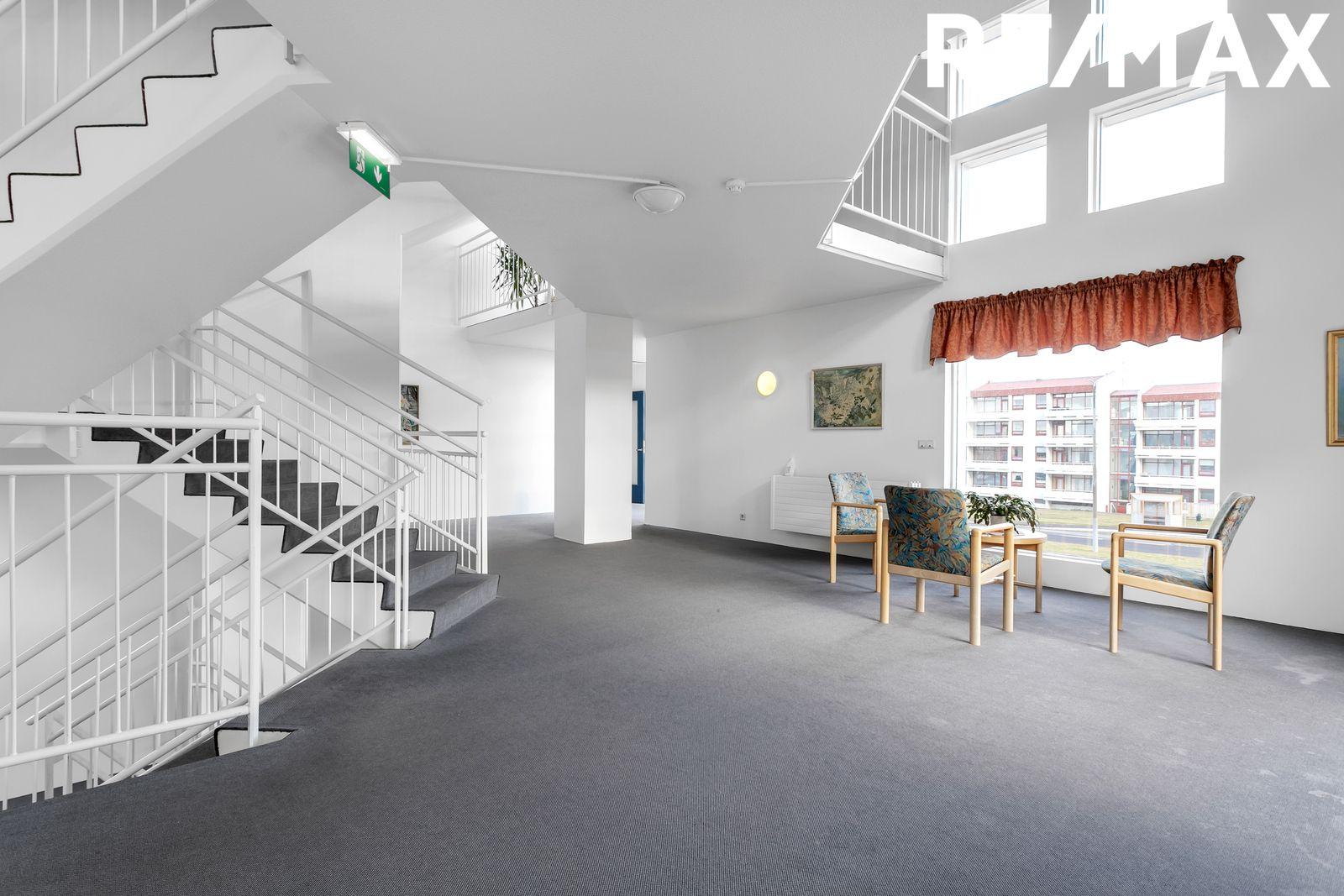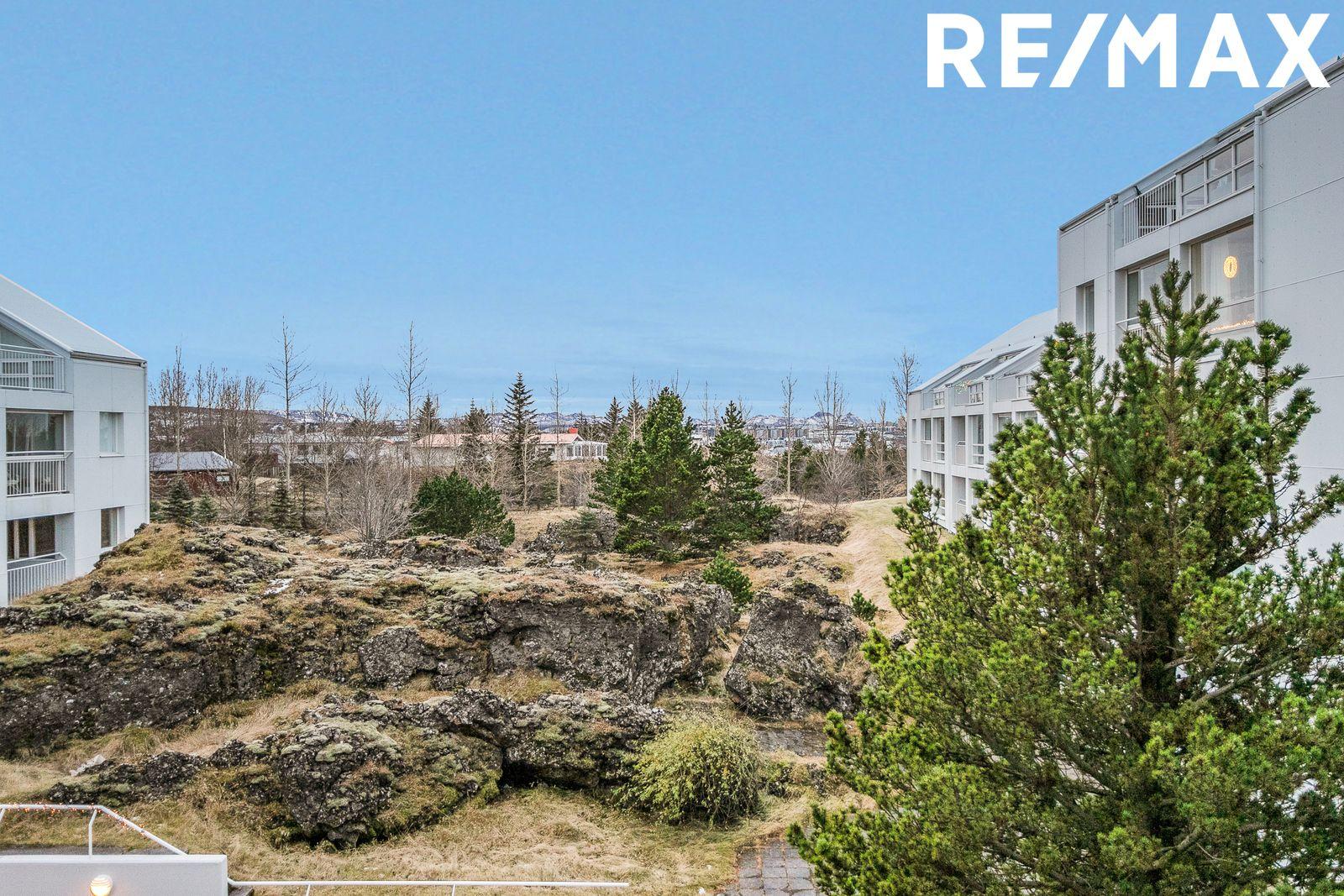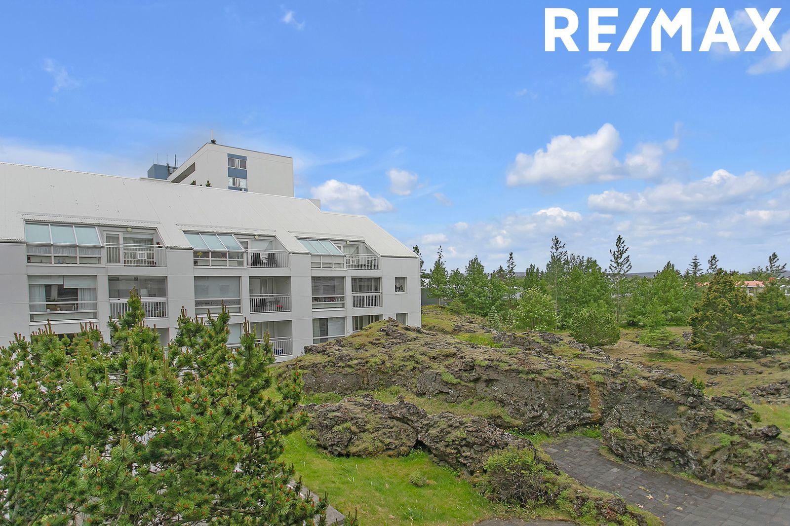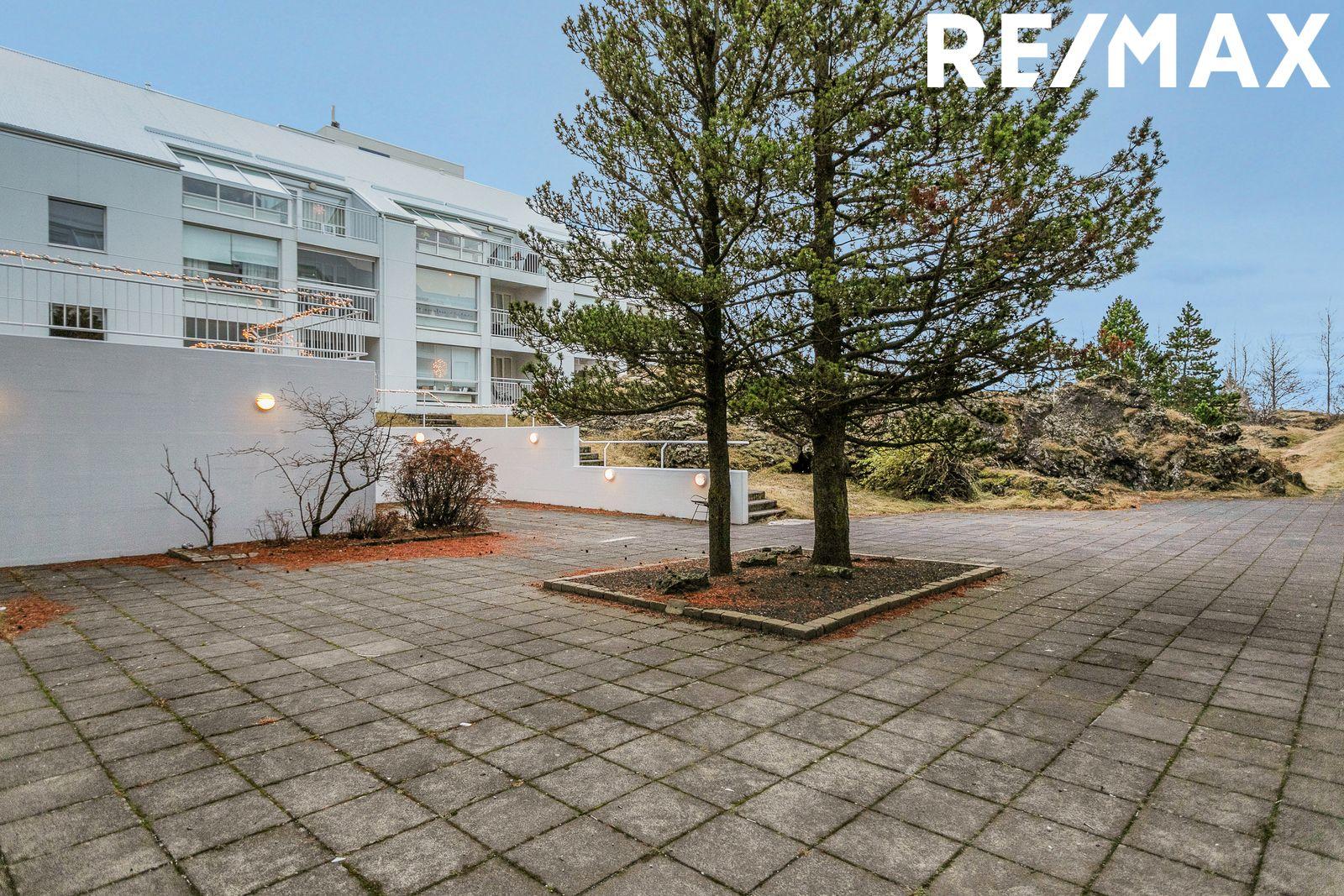 Komið er inn í anddyri með sjálfvirkum opnara á hurðum og nýlegu mynddyrasímakerfi sem tengt er upp í íbúðirnar. Lyfta gengur að öllum hæðum hússins en ef íbúðar kjósa að taka stigann þá er aðeins gengið upp eina hæð að íbúðinni. Íbúðin snýr sérlega skemmtilega þar sem allir gluggar hennar snúa út í áttina að sameiginlegum garði hússins sem er sérlega fallegur og vel hirtur.