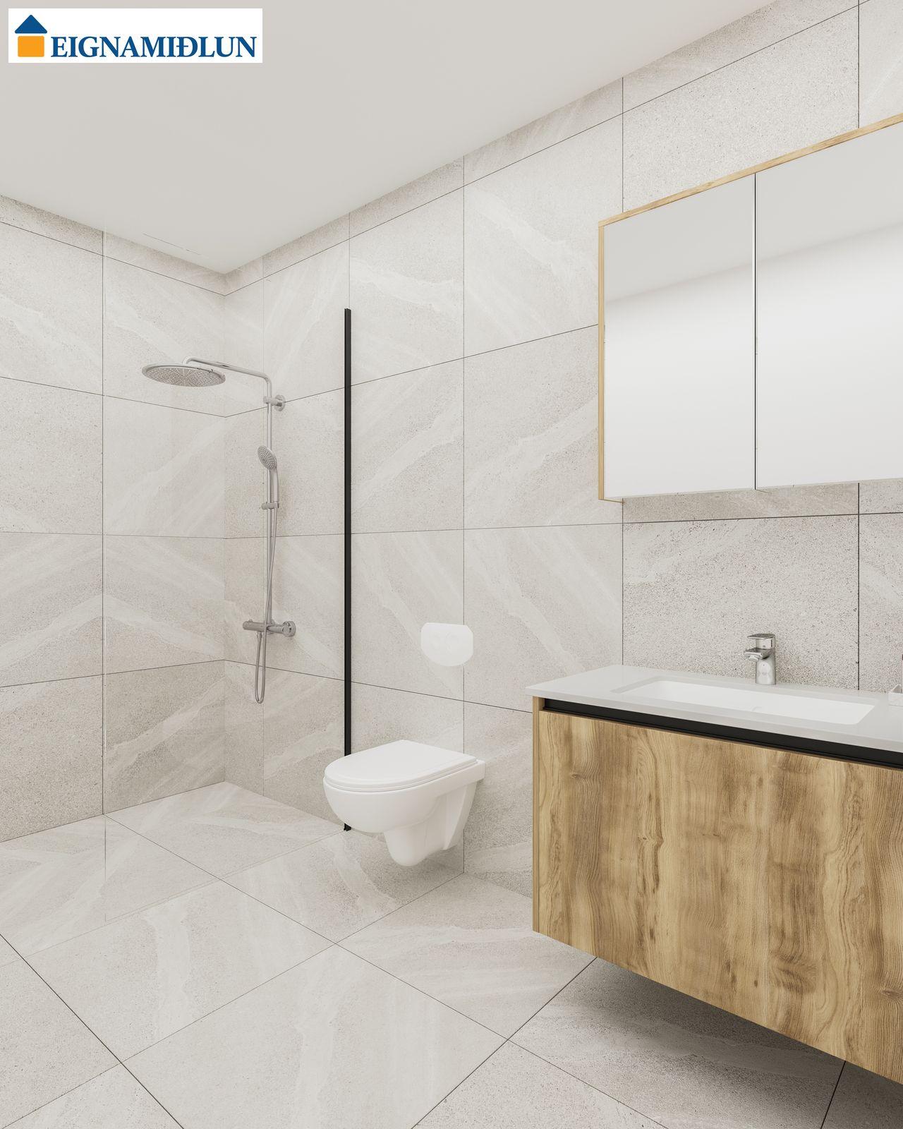 INNRÉTTINGAR: Eldhúsinnréttingar eru sérsmíðaðar frá Selós. Skápar eru úr vönduðu stitsterku melamin efni. Vönduð heimilistæki eru í íbúðum sem eru frá AEG. Kæli-/frystiskápur og uppþvottavél eru innbyggð í innréttinguna og spanhelluborð. Dekton – Rem steinborðplötur eru í öllum eldhúsum og Silestone – Nolita steinborðplötur eru á böðum. Gólfhiti er í gólfi baðherbergis auk handklæðaofns. Bílastæði í kjallara fylgja öllum íbúðum og möguleiki er á að kaupa viðbótarstæði.