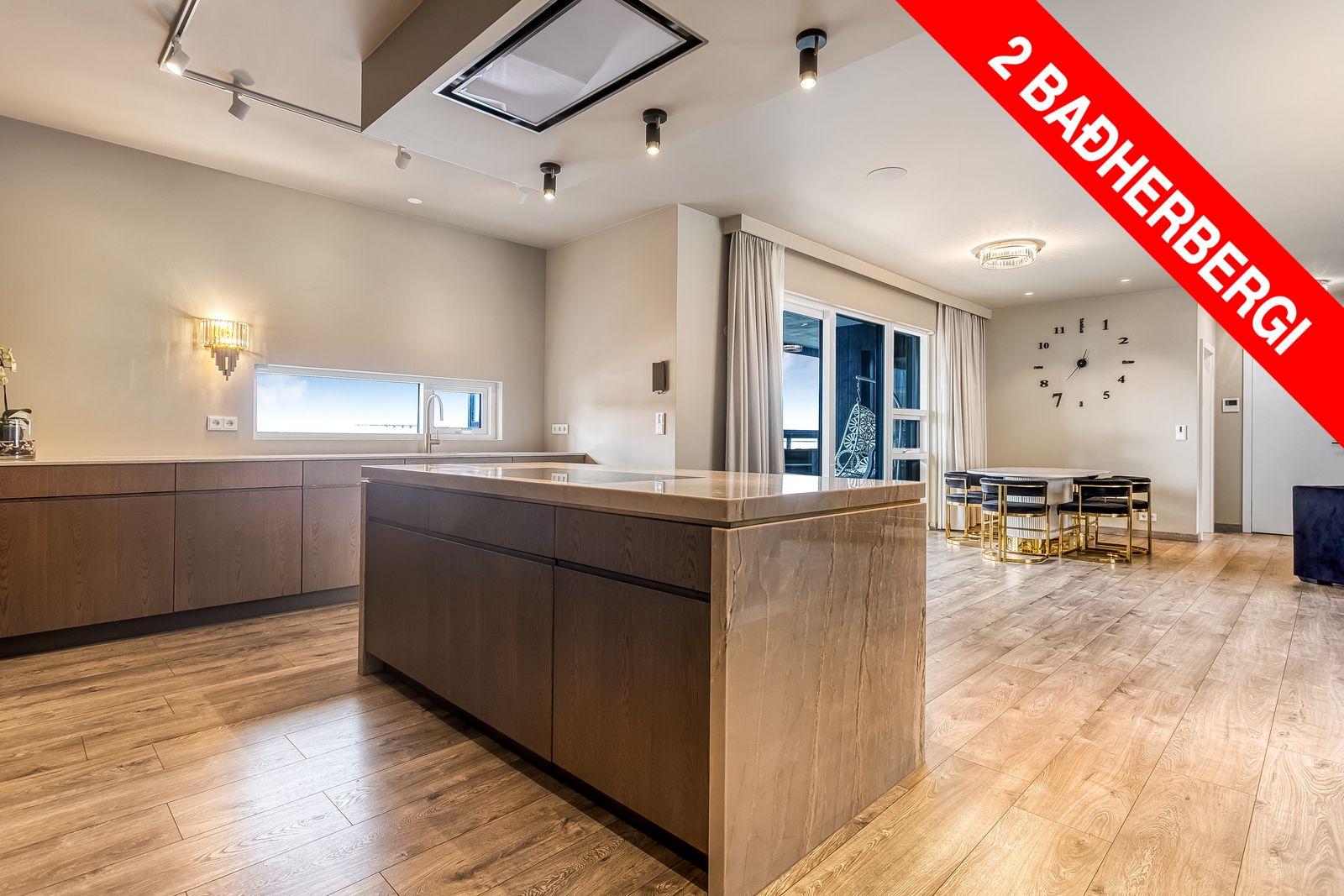 Eldhús: Gott skápa og borðpláss ásamt fallegri eyju, búr skápur með lýsingu. Innréttingin er frá Fagus. Borðplötur eru sérsmíðaðar úr gráæðóttum Quartzite náttúrustein. Undirlímdur gull-litaður vaskur af gerðinni Gessi frá Ebson, span helluborð á eyju og 2 innbyggðir ofnar frá Miele. innbyggður ísskápur, frystir og uppþvottavél.