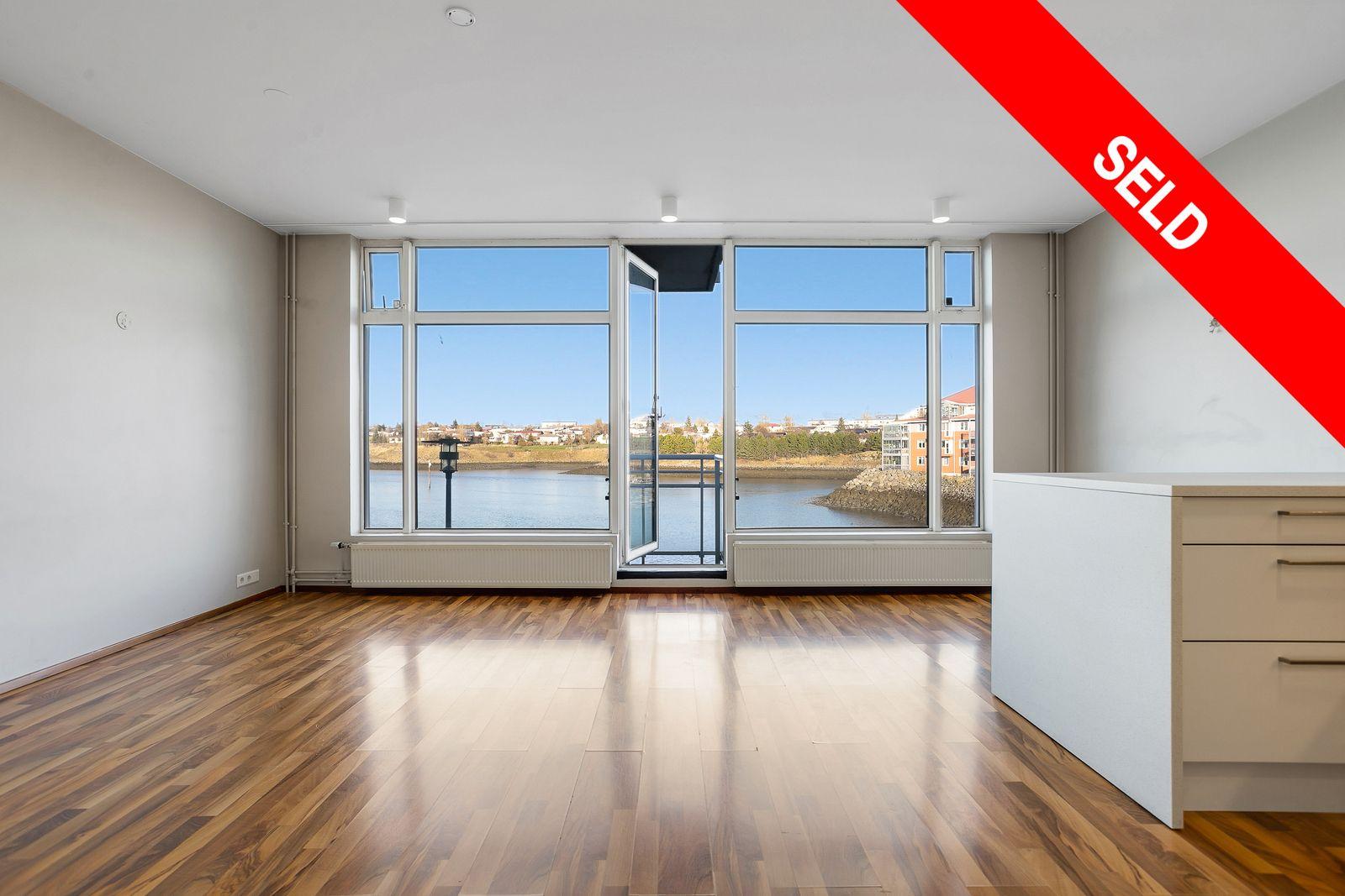 Stofa- og borðstofa: parket á gólfi, mjög fallegt sjávarútsýni, yfir bryggjuna og í átt til Esju, björt stofa með nettum útsýnis svölum sem snúa í norður.