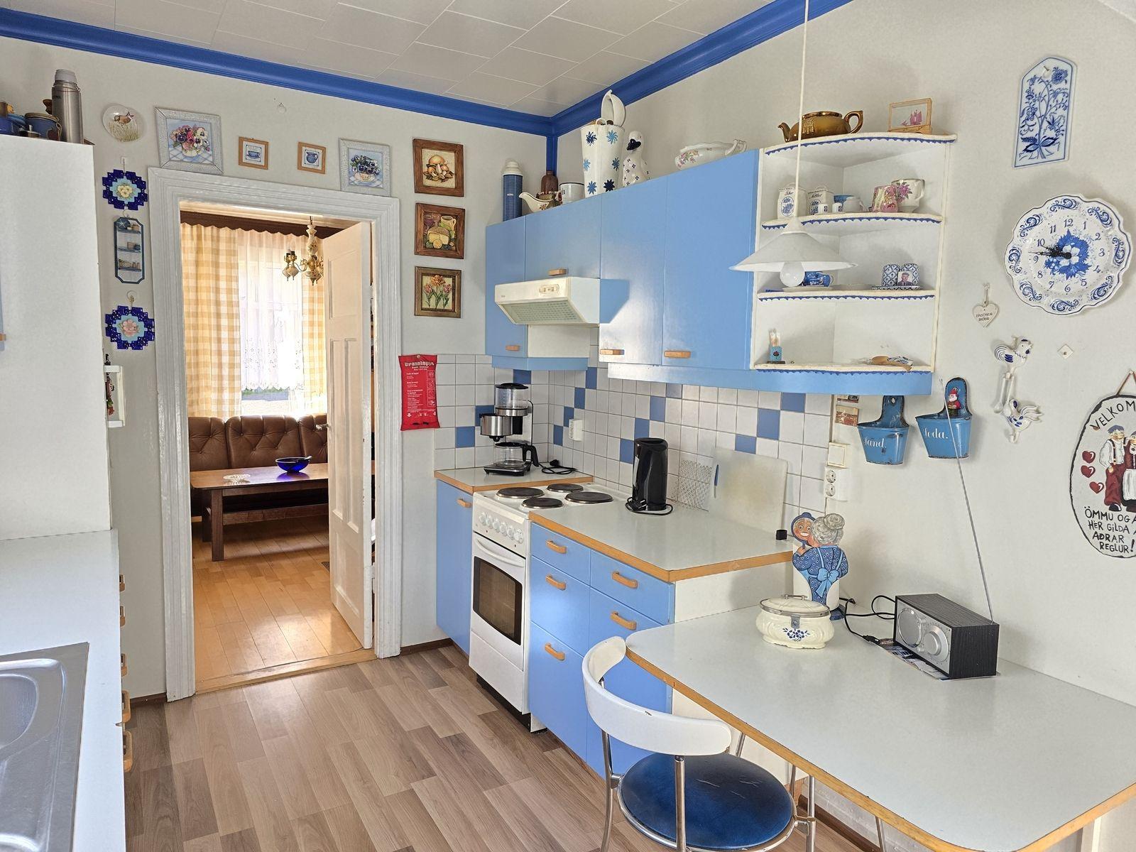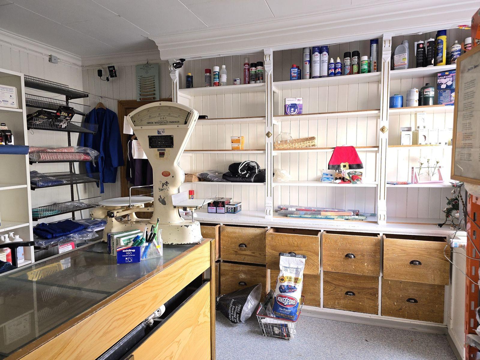 Íbúðin er á tveimur hæðum alls 137,6 fm. Á neðri hæð er tvískipt stofa, eldhús og tvær forstofur. Á efri hæðinni eru sex herbergi og baðherbergi. Verslunin er á sömu hæð og neðri hæð íbúðarinnar og er um 40,9 fm. Á milli íbúðar og verslunar er skrifstofa. Kjallari er undir húsinu sem hýsti lager verslunarinnar og erum 90,6 fm. Á austurhluta lóðarinnar standa svo geymsluhúsnæði sem eru alls 148 fm. Útsýni til austurs er frá eigninni. Húsin eru komin til ára sinna og þarfnast viðhalds og endurbóta. Íbúðar- og verslunarhúsnæðið var steypt árið 1930 en geymsluhúsnæðið var byggt úr timbri árið 1949 og 1911.