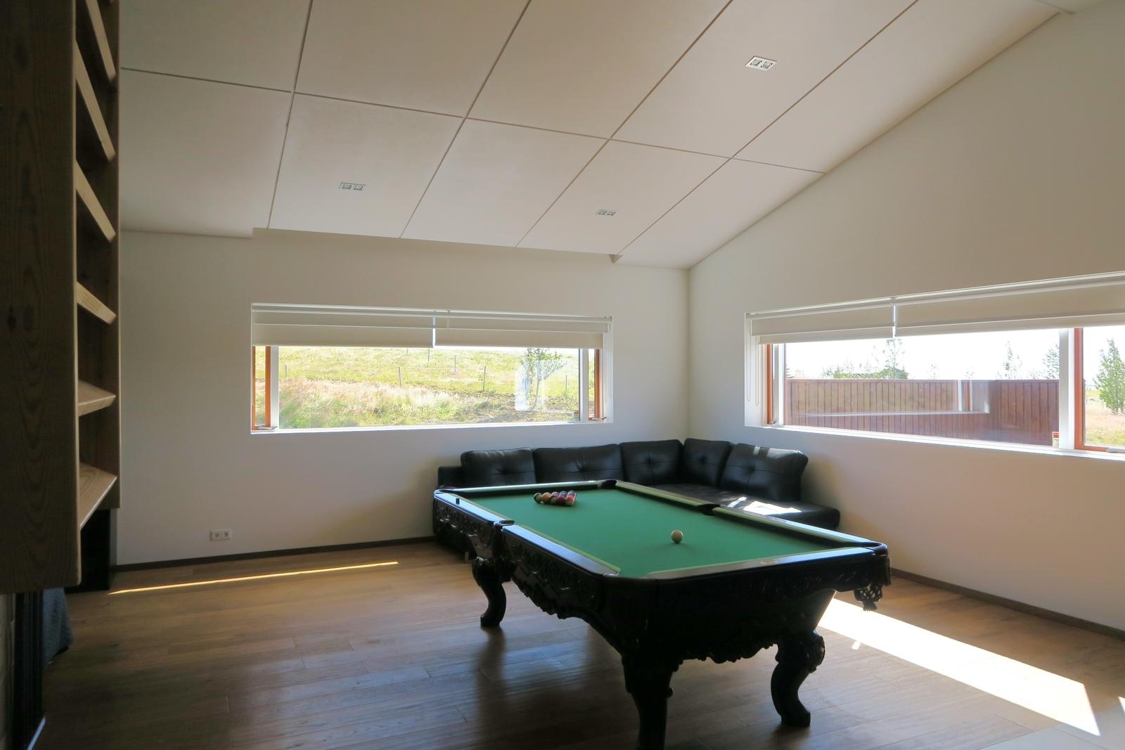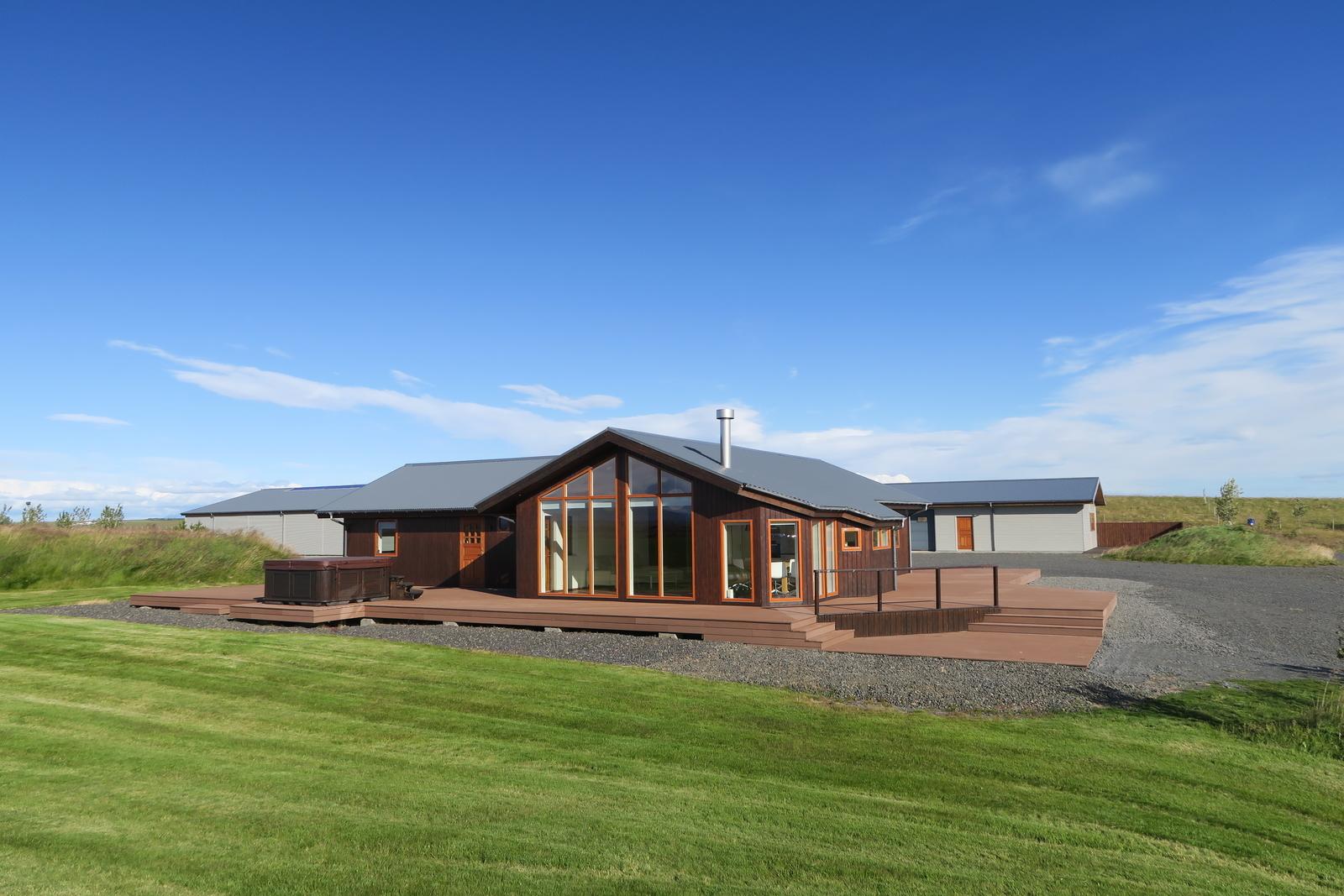 Single-story house 158.2 m2 built in 2010, divided into an entrance hall, living room, and kitchen in a shared open space, a TV room, and three bedrooms. Two tiled bathrooms have access to a hot tub on the deck. The house is clad with larch cladding. On the land, there is a 279 m2 building built in 2011, consisting of a 70,7 m2 horse stable, 68,6 m2 barn and sitting area, 68,6 m2 garage/storage, and 71,1 m2 apartment. A riding path surrounds the land. Beautiful riding hall, 700 m2 built in 2011. The property is located approximately a 10-minute drive from Selfoss and an hour's drive from Reykjavik and about 1.5 hour from the international airport in Keflavík.