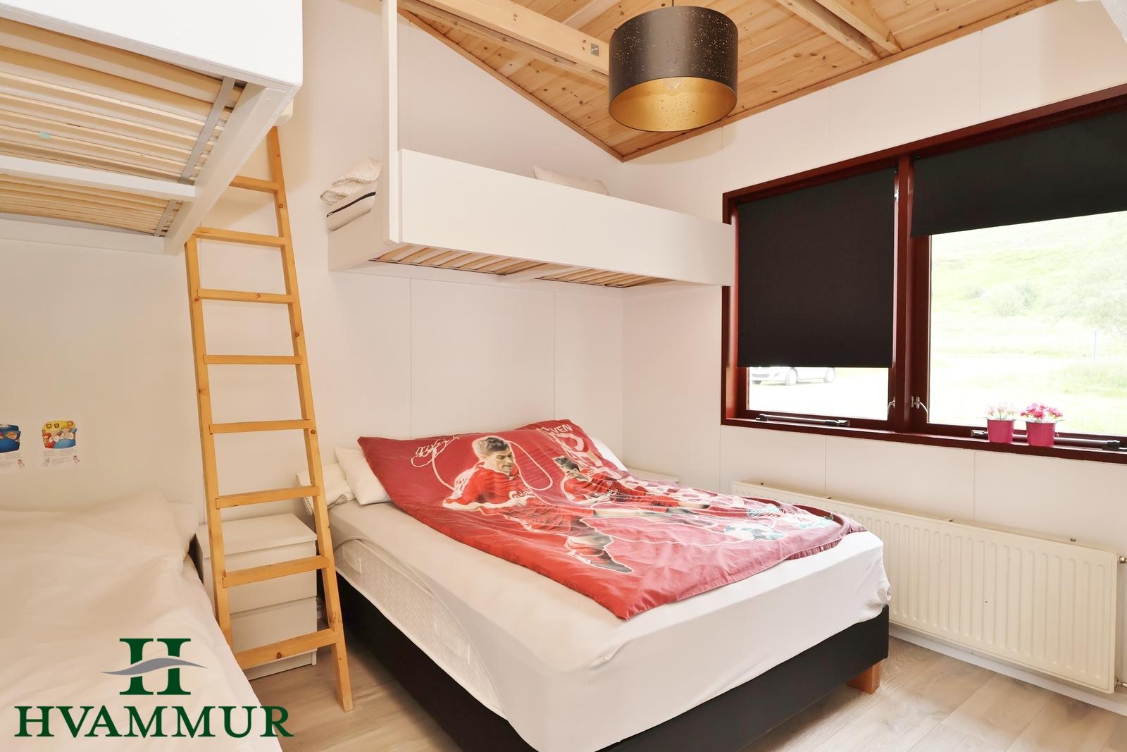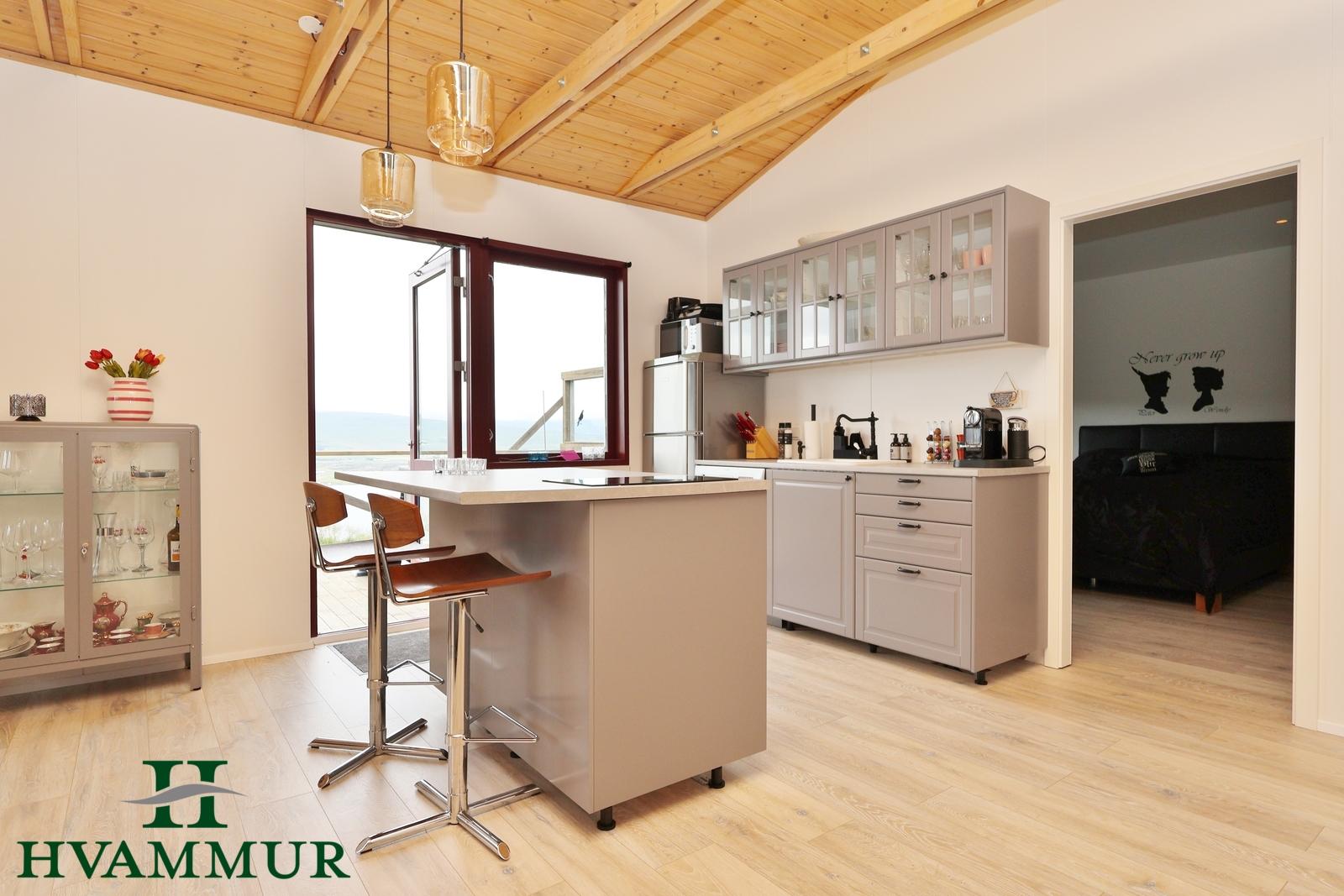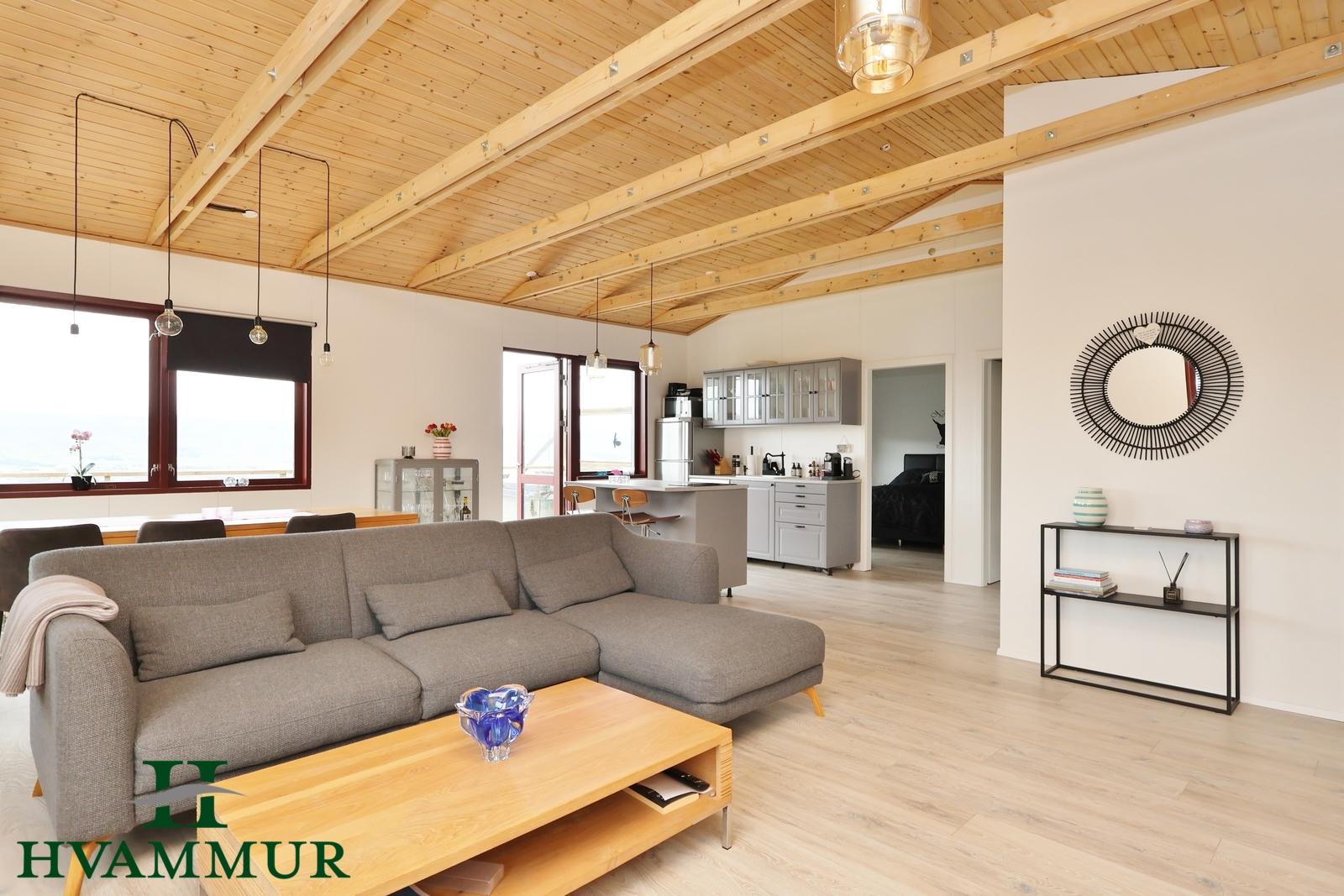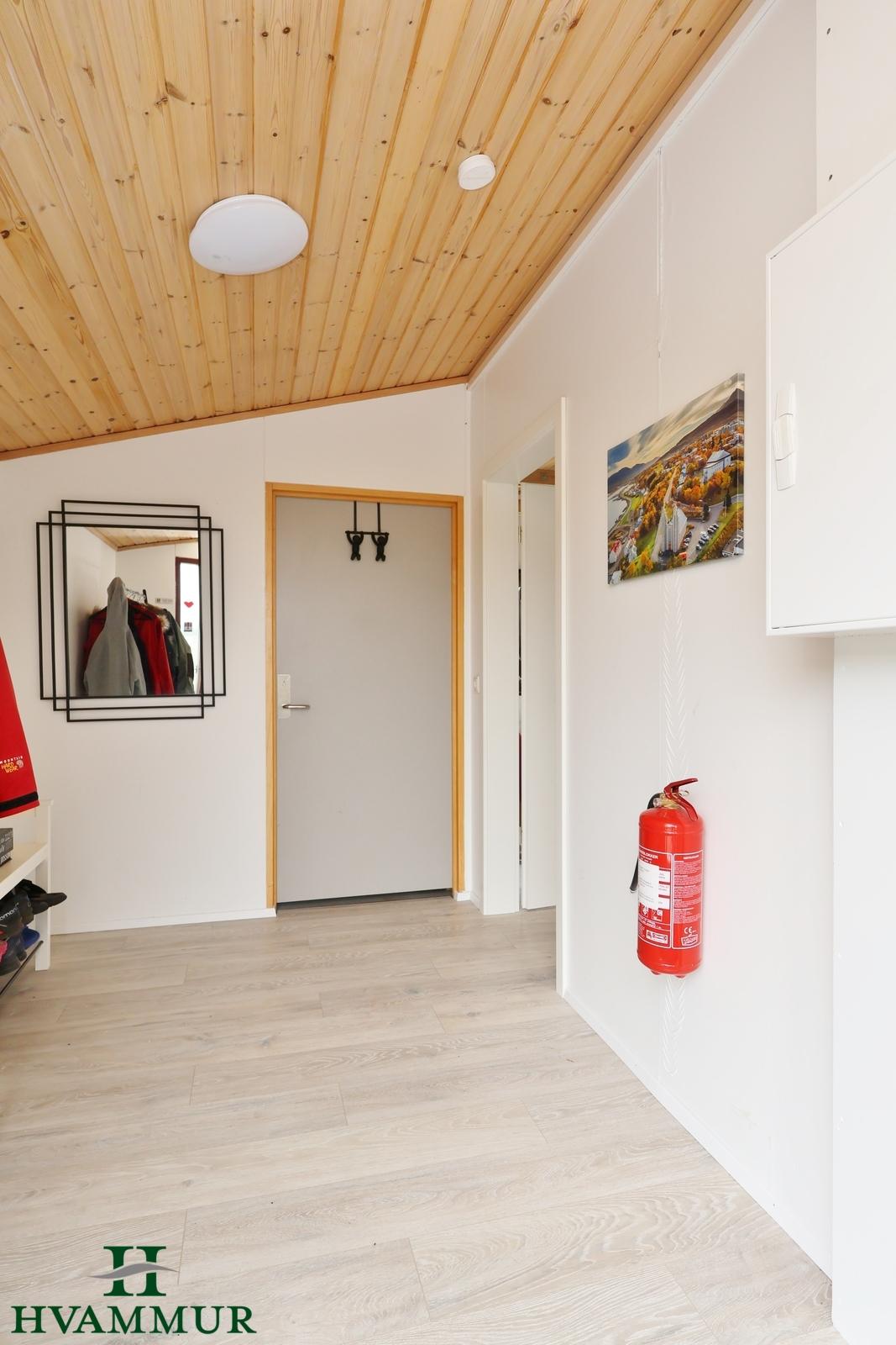 Forstofan er með ljósu harðparketi á gólfi Geymsla og tæknirými er innaf forstofu. Eldhús og stofa er í einu opnu rúmgóðu alrými hvar loft eru tekin upp. Nýleg sprautulökkuð eldhúsinnrétting með eldunareyju. Útgangur er á rúmgóða verönd úr eldhúsi. Svefnherbergin eru tvö og eru þau bæði rúmgóð. Í öðru herbergjanna hafa loft verið tekin niður þar er innfell lýsing. Hitt herbergið er með svefnplássi fyrir 5 - 6 manns og þar eru m.a. þrjú upphengd svefnpláss/rúm. Baðherbergið er flísalagt bæði gólf og veggir. Á baðherberginu er sturta, upphengt wc og handklæðaofn. Rúmgóð verönd er með suður og vesturhlið hússins og þar er heitur pottur.