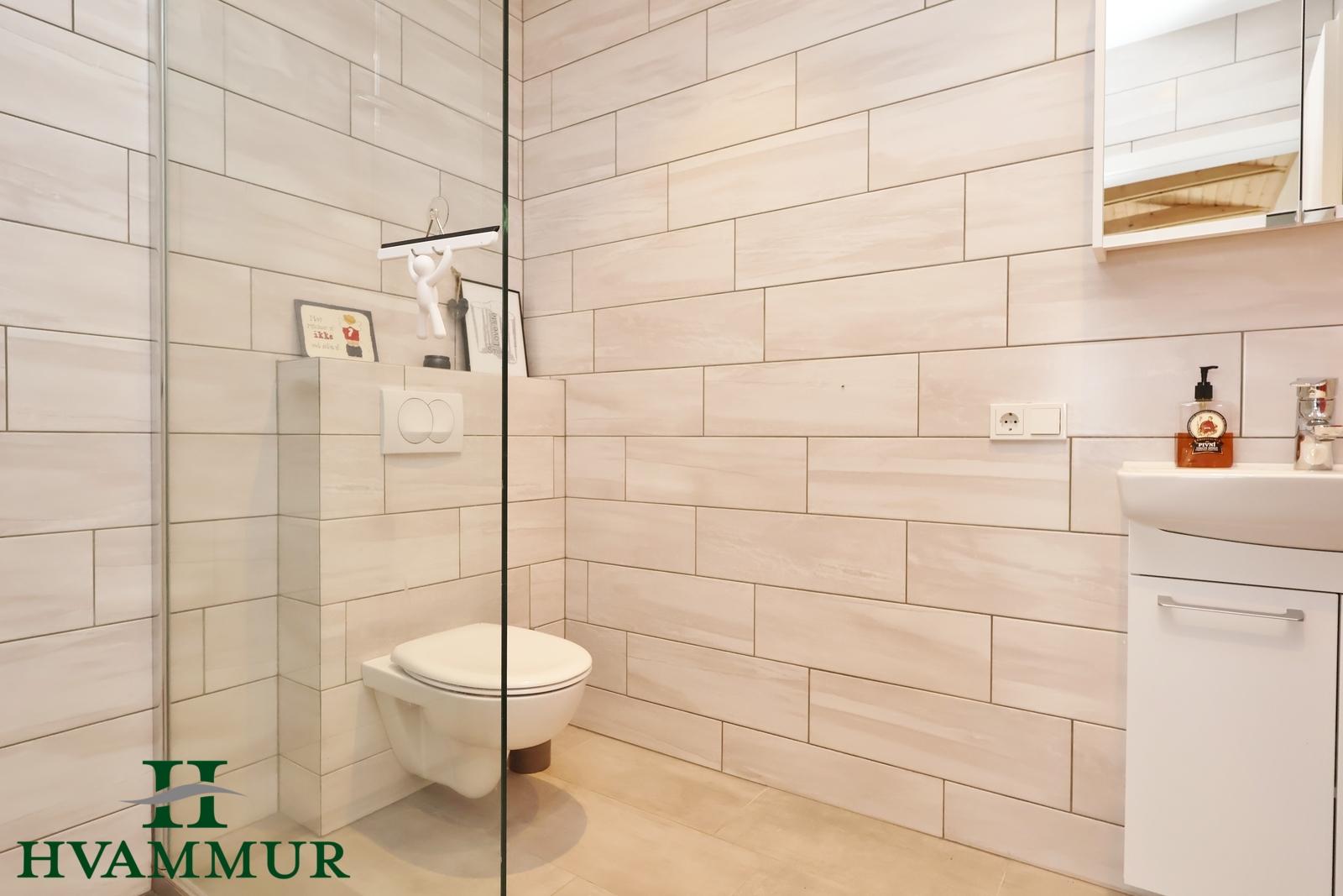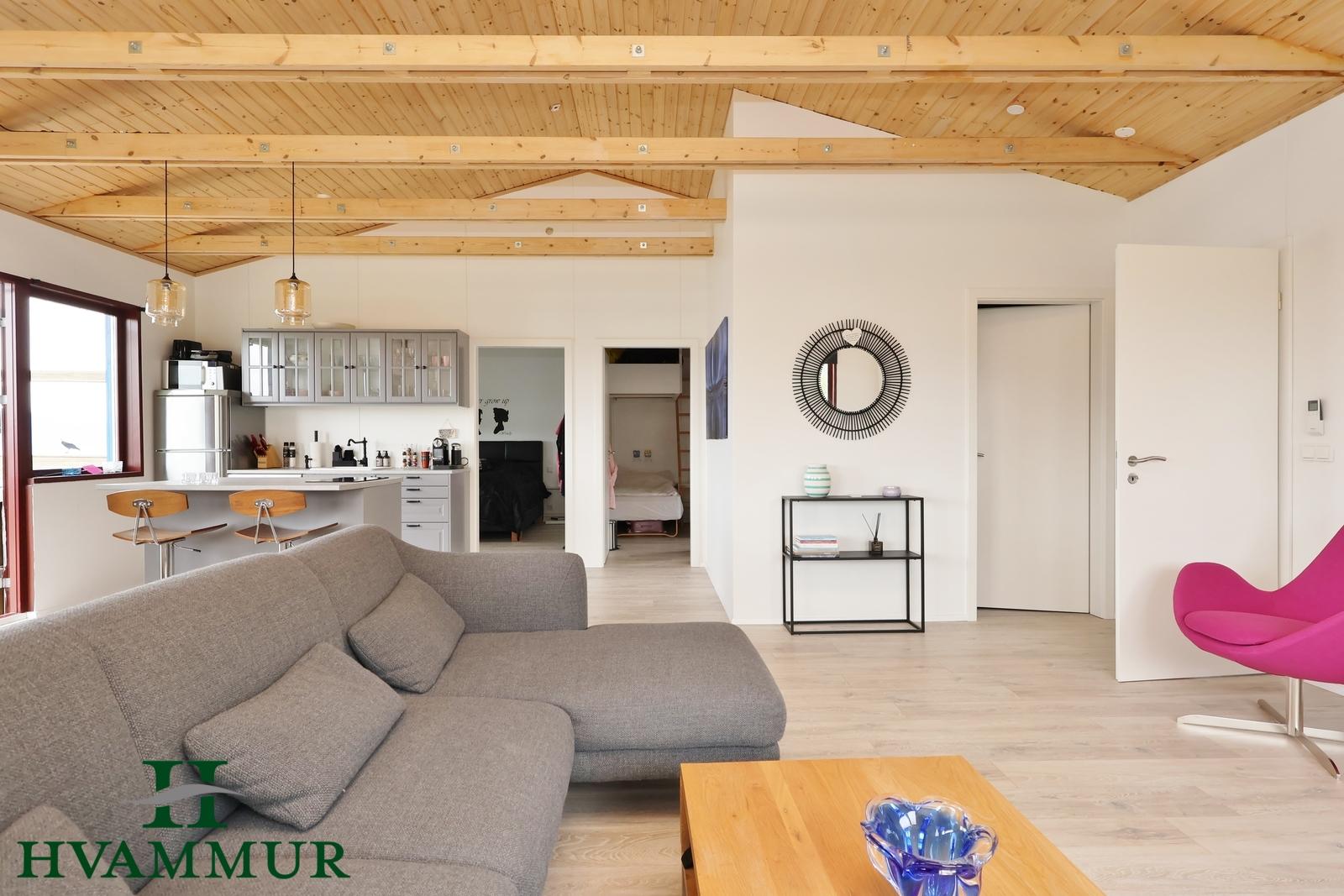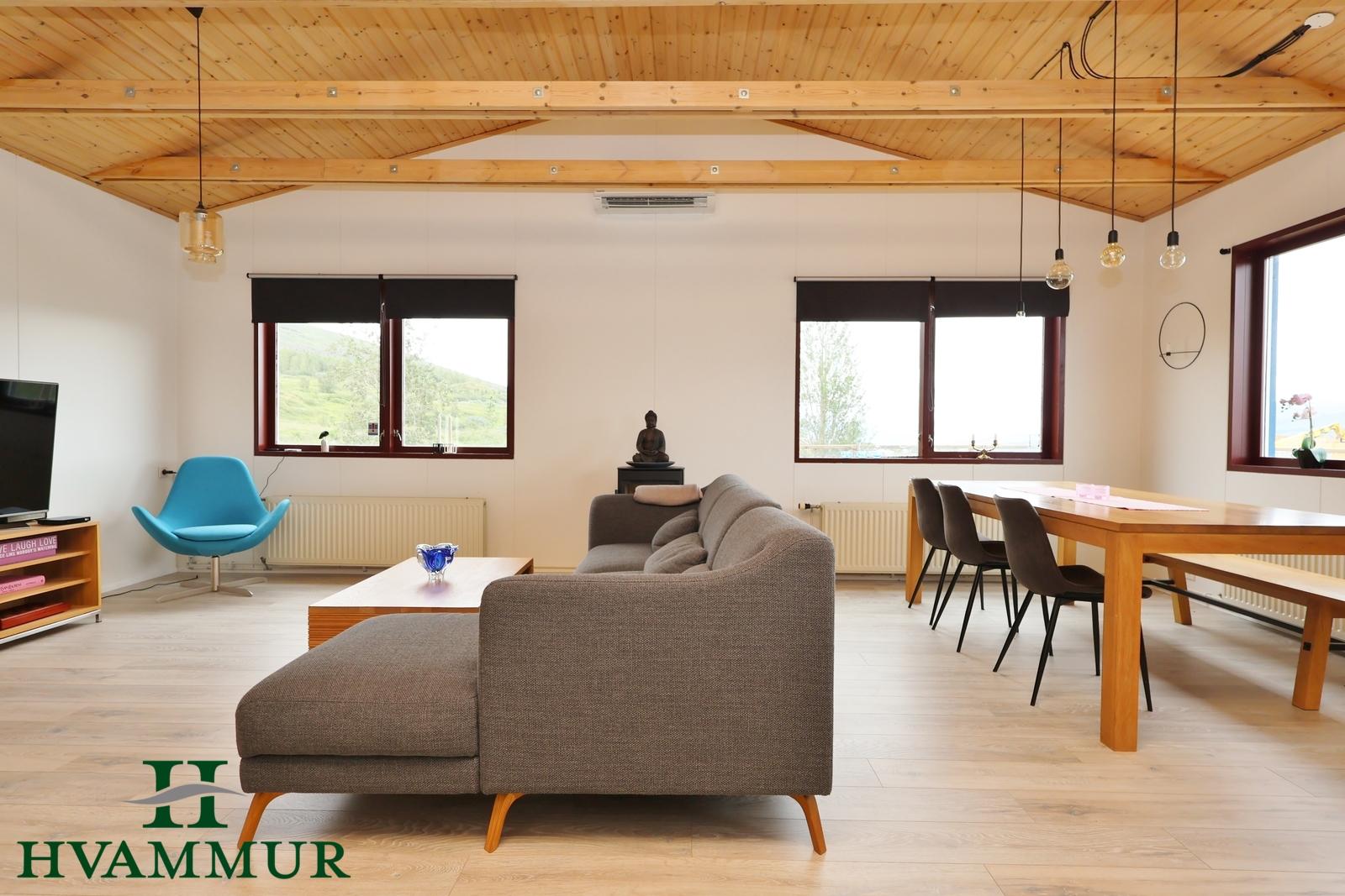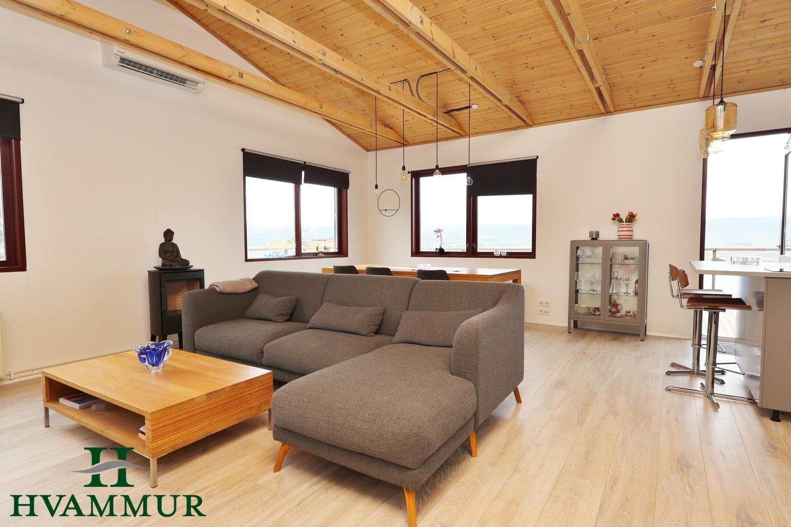 Forstofan er með ljósu harðparketi á gólfi Geymsla og tæknirými er innaf forstofu. Eldhús og stofa er í einu opnu rúmgóðu alrými hvar loft eru tekin upp. Nýleg sprautulökkuð eldhúsinnrétting með eldunareyju. Útgangur er á rúmgóða verönd úr eldhúsi. Svefnherbergin eru tvö og eru þau bæði rúmgóð. Í öðru herbergjanna hafa loft verið tekin niður þar er innfell lýsing. Hitt herbergið er með svefnplássi fyrir 5 - 6 manns og þar eru m.a. þrjú upphengd svefnpláss/rúm. Baðherbergið er flísalagt bæði gólf og veggir. Á baðherberginu er sturta, upphengt wc og handklæðaofn. Rúmgóð verönd er með suður og vesturhlið hússins og þar er heitur pottur.