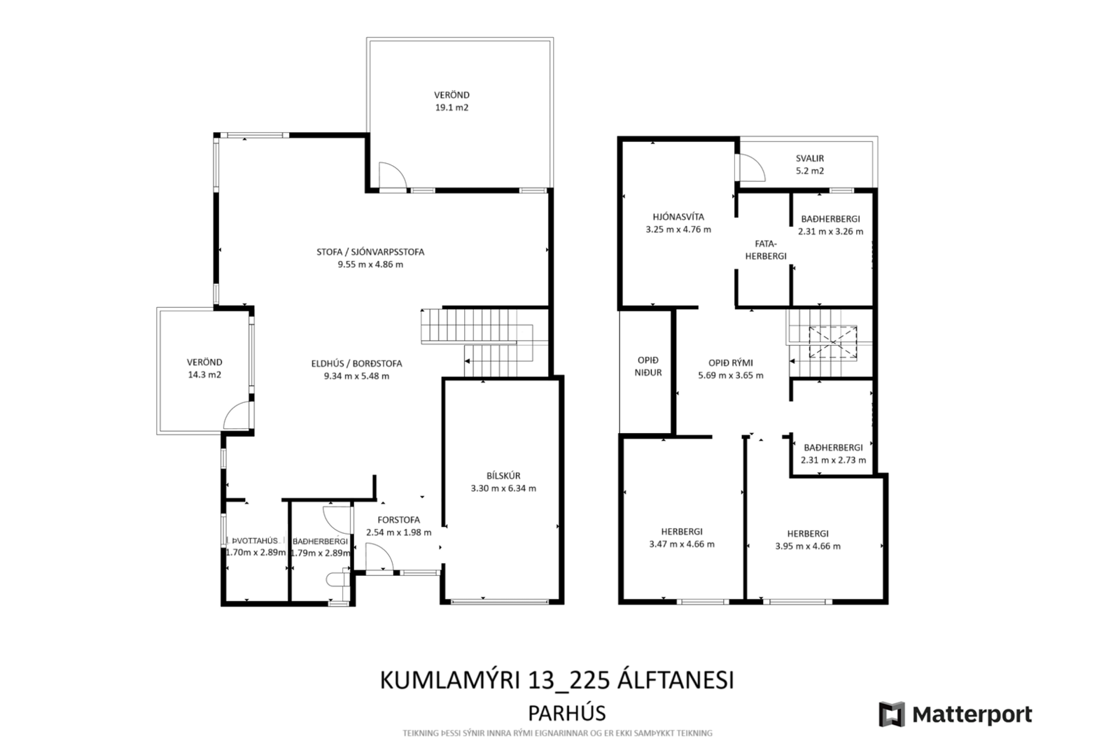 79,8 fm, gólfflötur stærri en uppgefnir fermetrar vegna súðar.Staðsteyptur stigi er á milli hæða með glerhandriði.