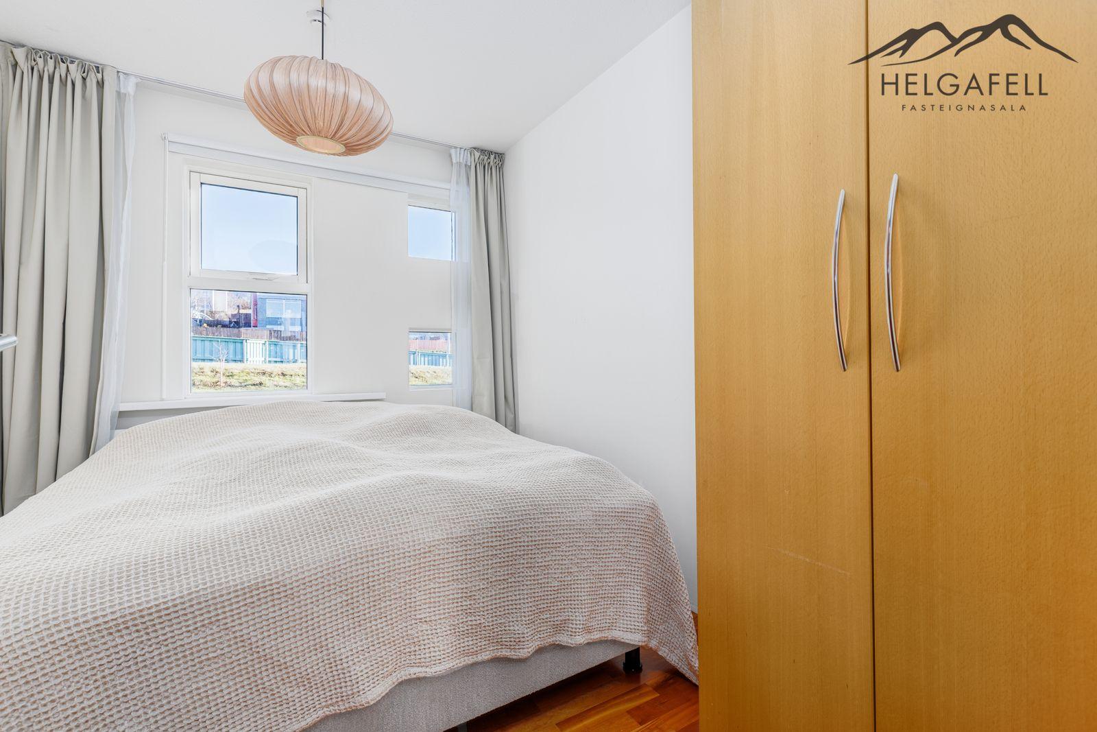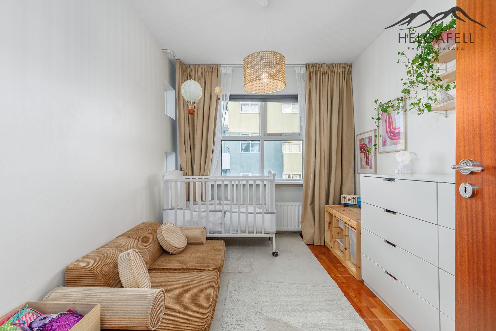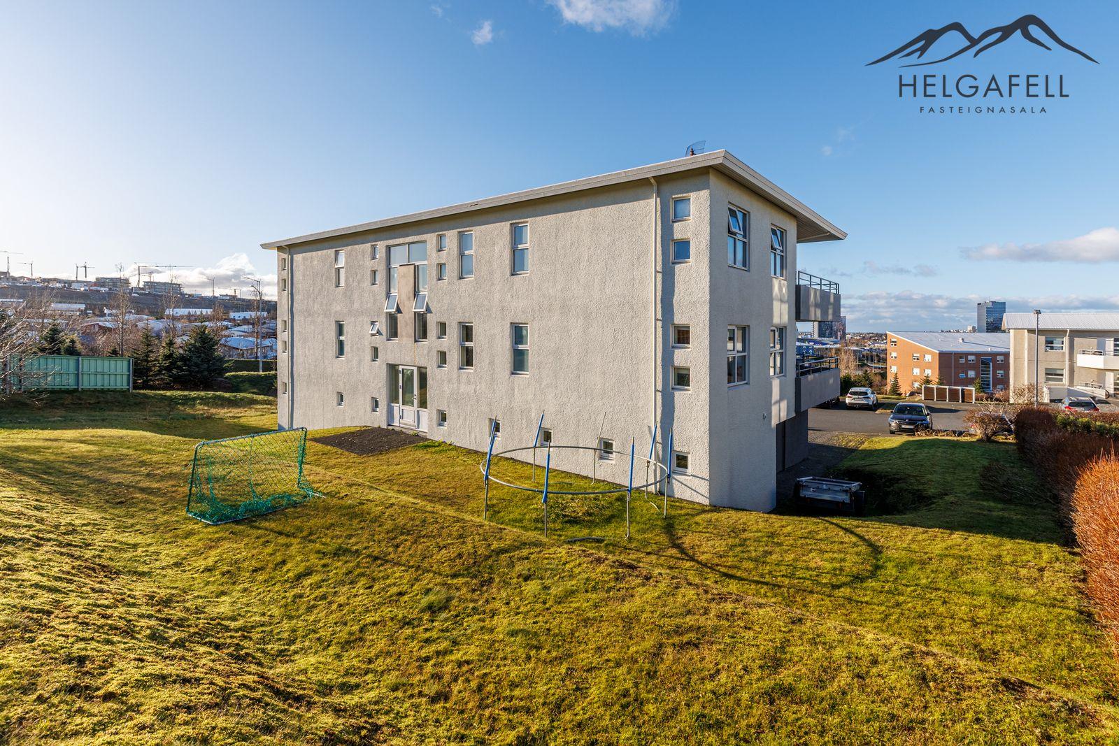 Sameign: Á fyrstu hæð er sameiginleg vagna- og hjólageymsla. Á baklóð er trampólín og garðhúsgögn í sameign.