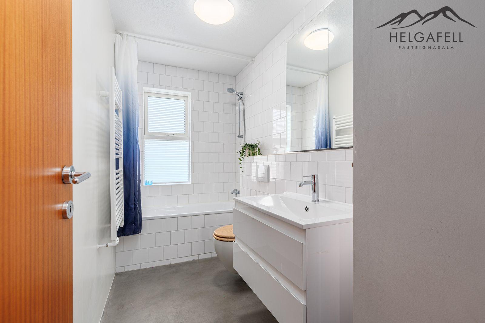 Baðherbergið: Endurnýjað 2021. Hvít innrétting með ljúflokum á skúffum, speglaskápur, baðkar með sturtu, handklæðaofn, upphengt salerni, flísar í kringum baðkar og að hluta á veggjum, flotað gólf.