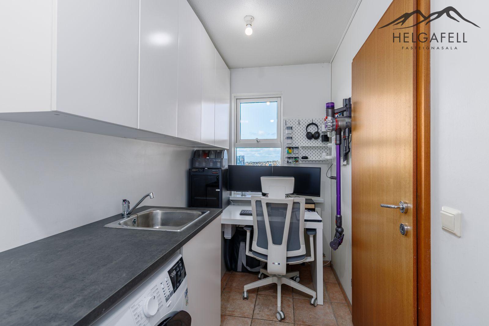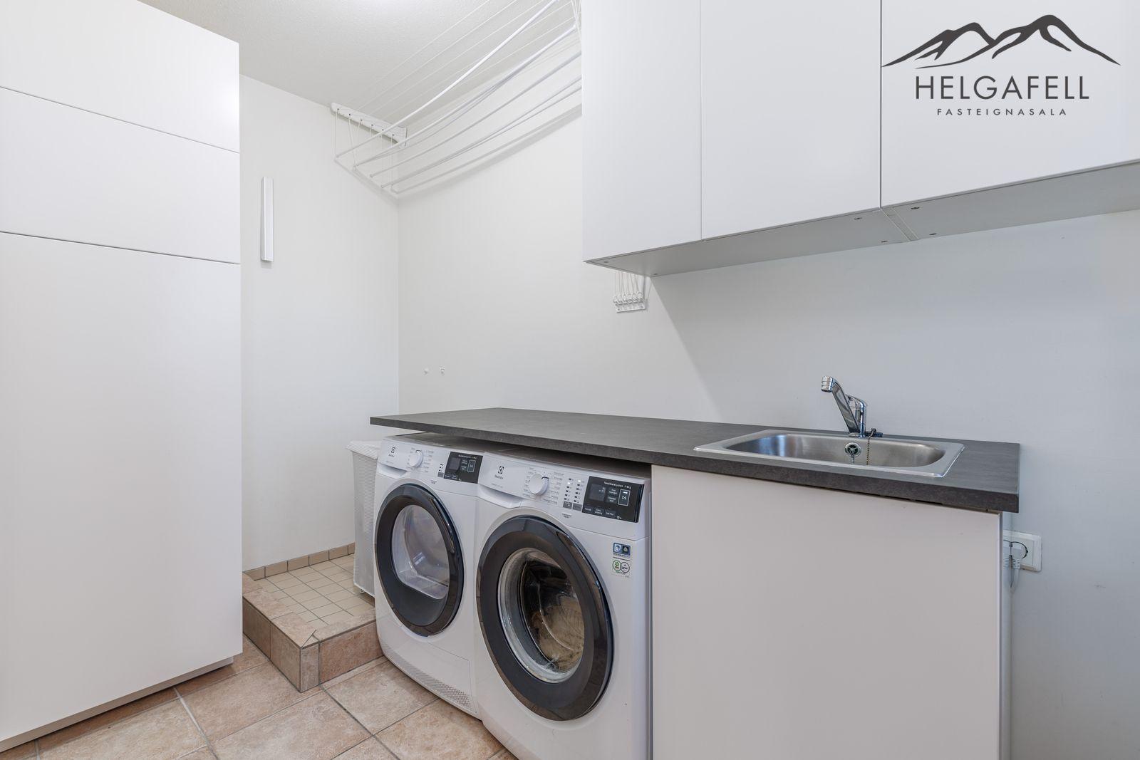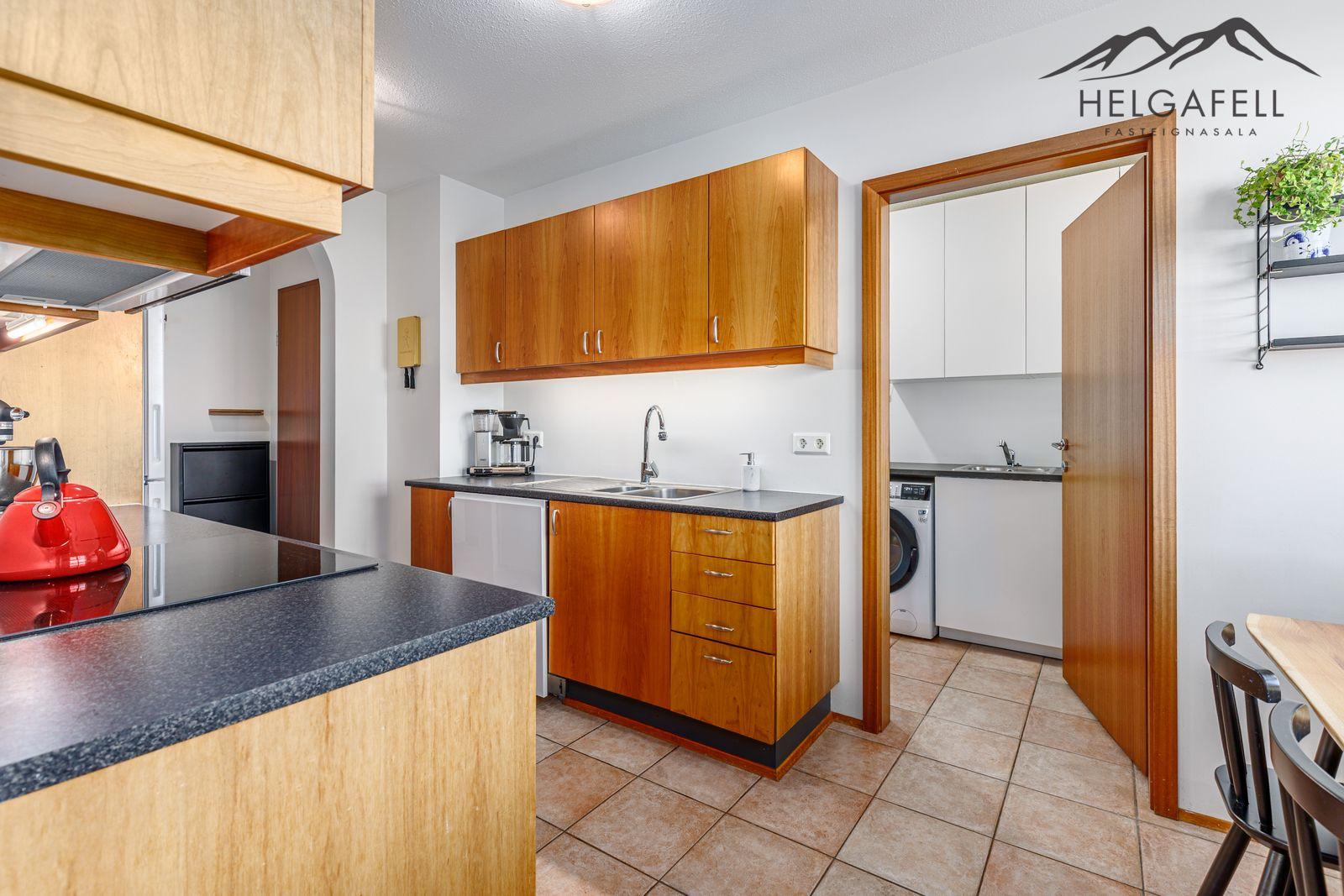 Þvottahús: Er inn af eldhúsi, ný hvít innrétting með vinnuborði, skolvask og skápar, sturtubotn, tengi fyrir þvottavél og þurrkara, þvottasnúrur, opnanlegur gluggi, físar á gólfi. Notað að hluta sem skrifstofurými í dag.