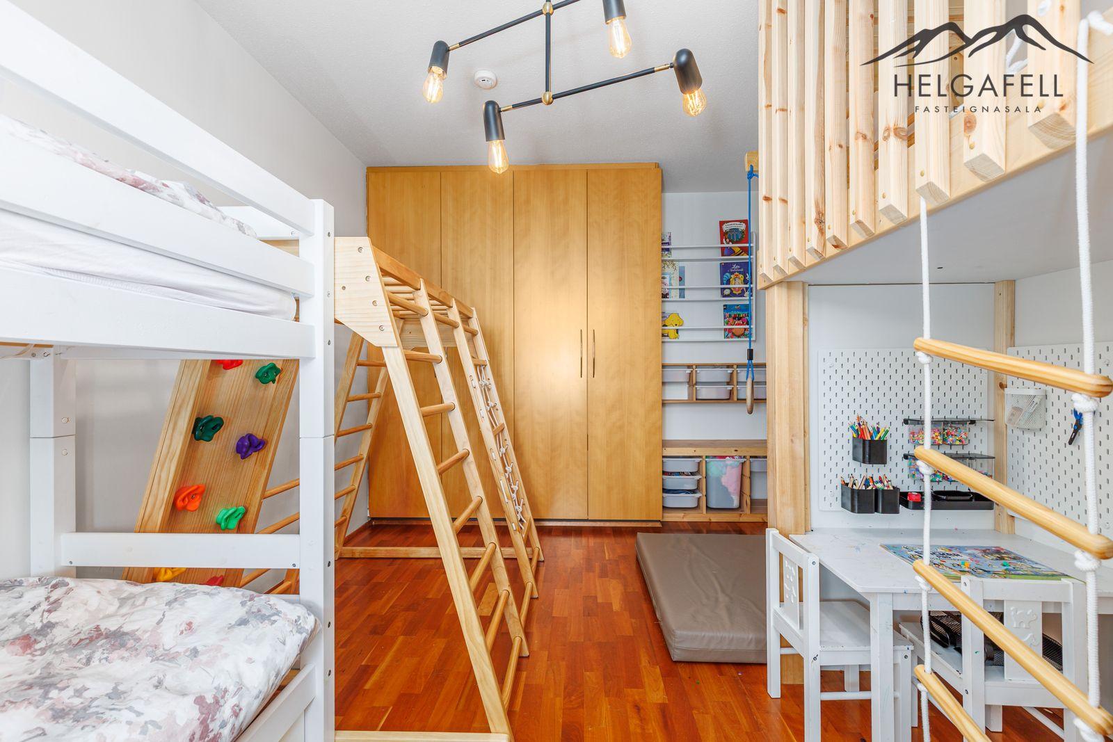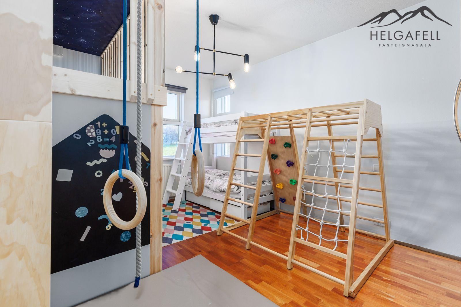 Hjónaherbergi: Rúmgott, leikloft, rimlar og dýna sem fylgja með, tvöfaldur fataskápur, parketi á gólfi.