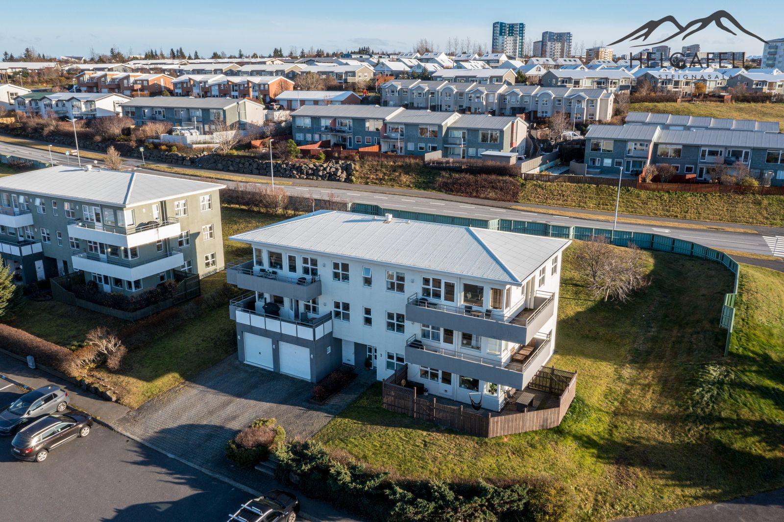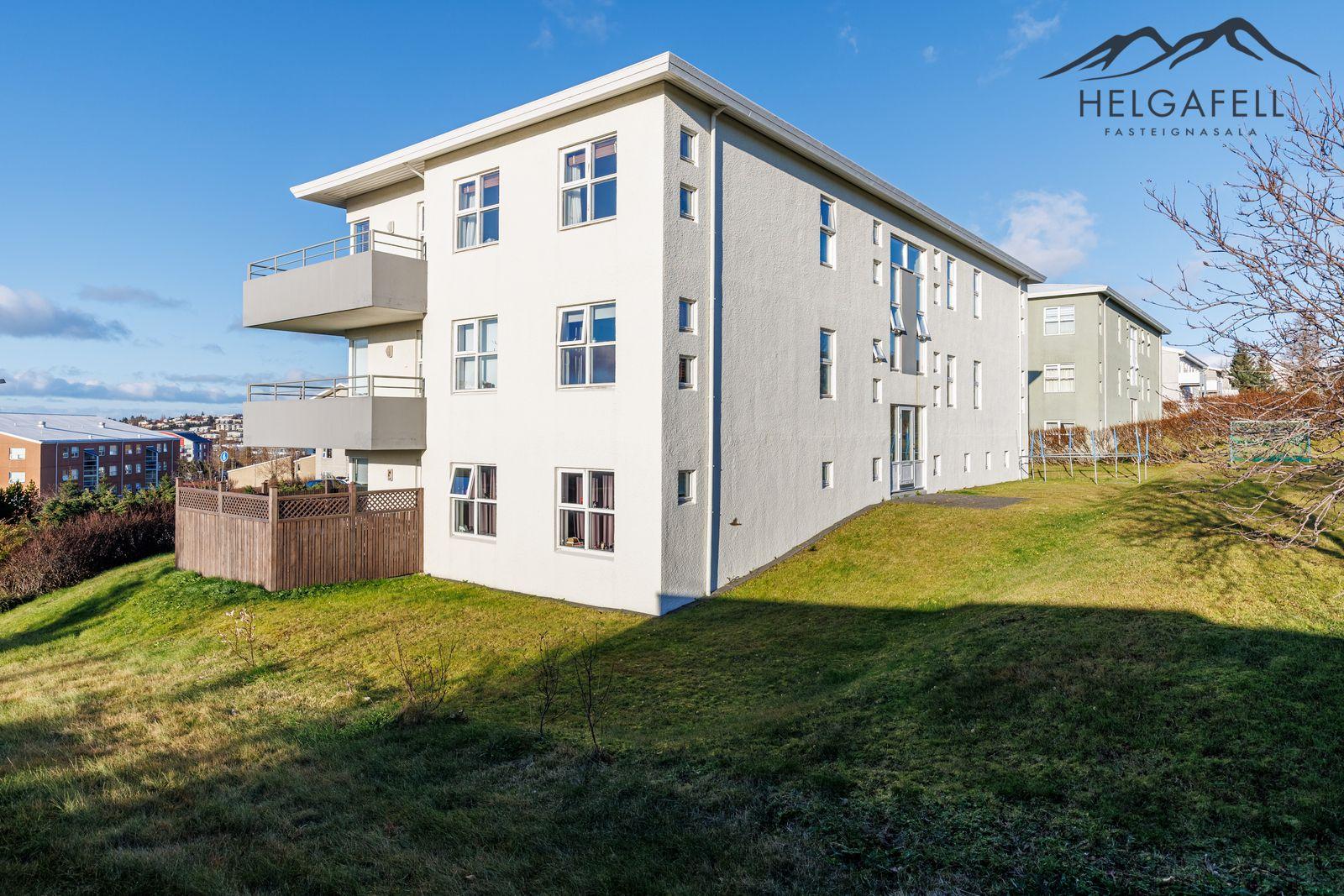 Húsið: Sameiginleg gróin lóð, stærð 1264 fm. Á baklóð er trampólín og garðhúsgögn í sameign. Skjólsæll baklóð í hásuður.