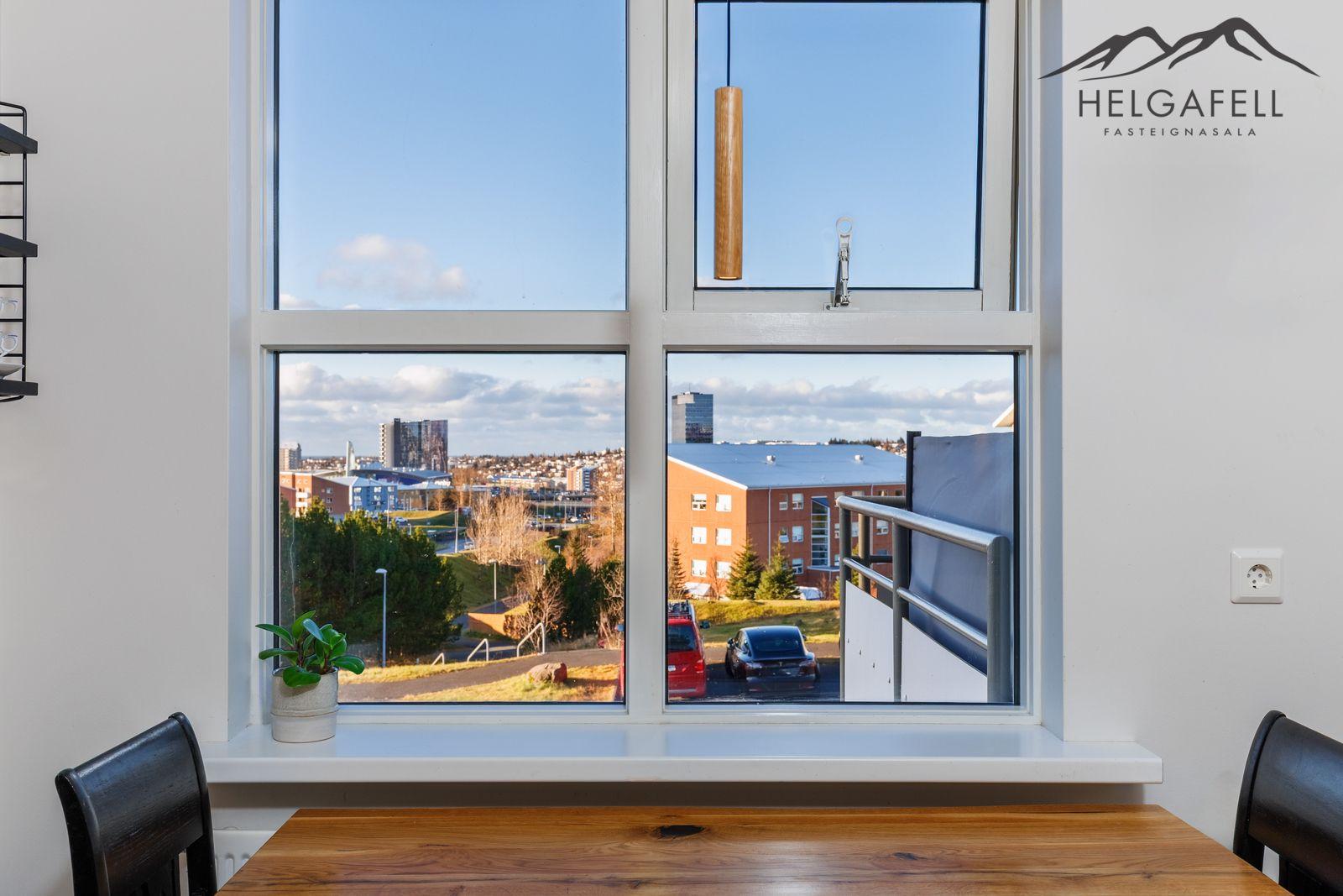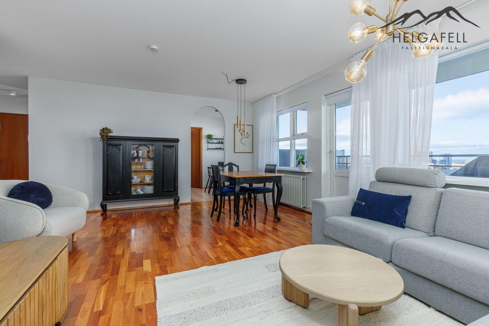Stofan / borðstofa: Björt og rúmgóð, útgengi út á rúmgóðar svalir til tveggja átta með einstaklega fallegu útsýni, gardínur í stofu fylgja með, parket á gólfi.
