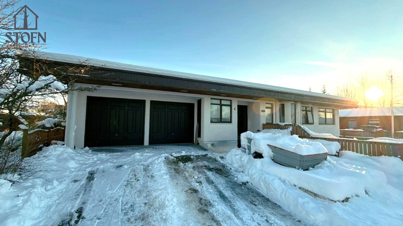 Hellulagt bílaplan og steypt gönguleið að inngangi. Tvöfaldur bílskúr með innangengi og nægilegt pláss fyrir geymslur og vinnuaðstöðu.