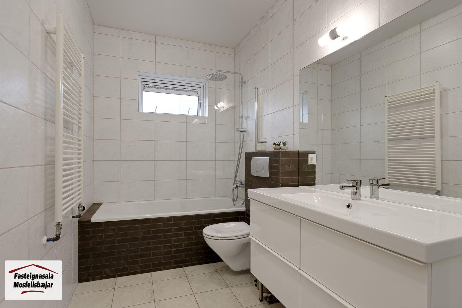 Baðherbergi er flísalagt í hólf og gólf, með innréttingu, handlaug, sturtuklefa, baðkari með sturtuaðstöðu, upphengdu salerni og handklæðaofni. Opnanlegur gluggi er á baðherberginu.