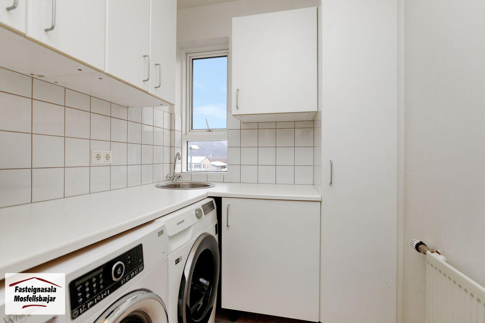 Þvottahús er með flísum á gólfi, góðri innréttingu, skolvaski og tengi fyrir þvottavél og þurrkara.