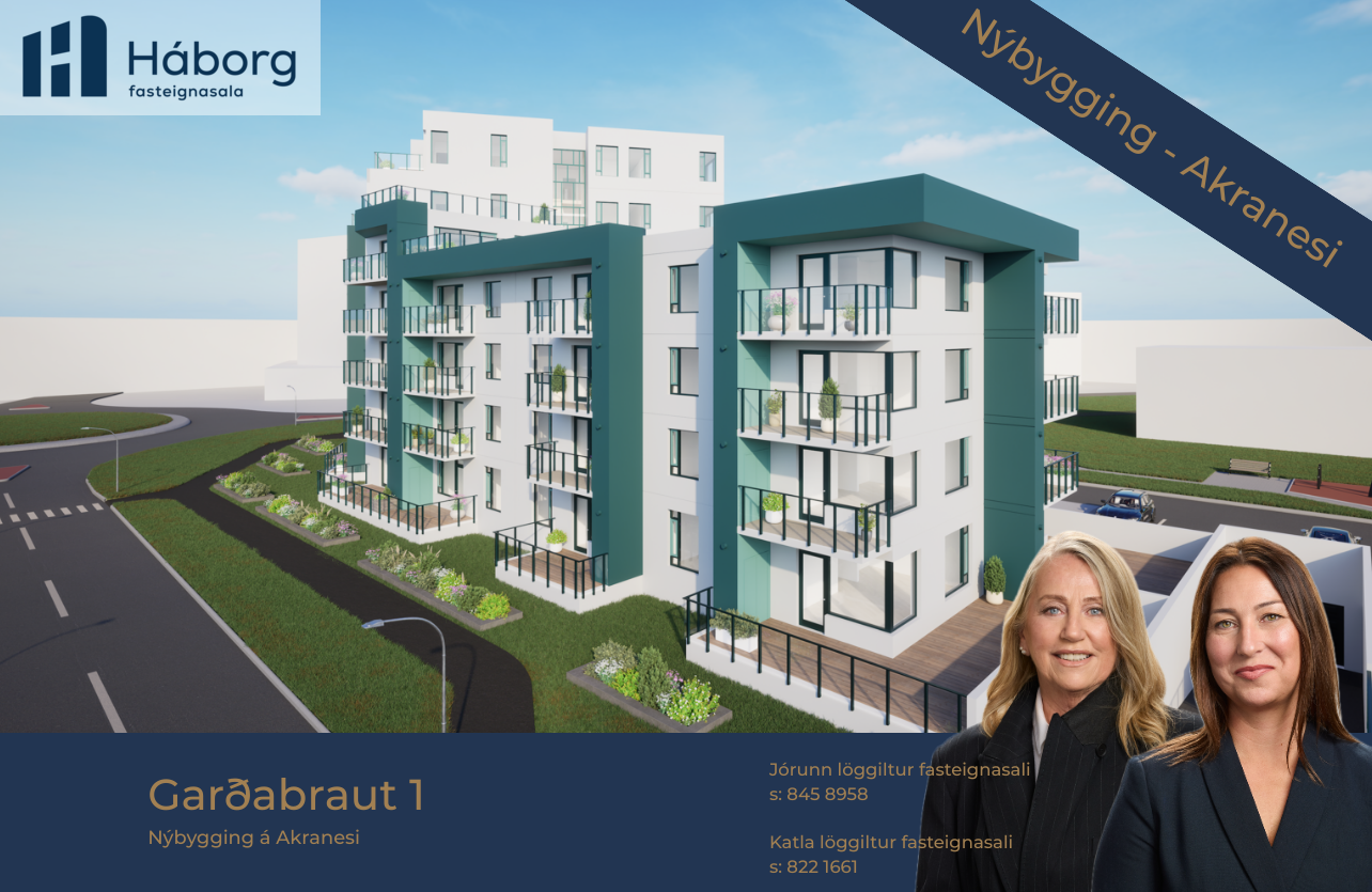 Heimasíða Garðabraut 1Allar upplýsingar um eignina veita: Katla Hanna Steed löggiltur fasteignasali í síma 822 1661 eða katla@haborg.is, Jórunn Skúladóttir löggiltur fasteignasali í síma 845 8958 eða jorunn@haborg.is og Kristín Rós Magnadóttir löggiltur fasteignasali í síma 860-2078 eða kristin@haborg.is. Almennt Fjölbýlishúsið að Garðabraut er staðsett í nýju og glæsilegu íbúðarhverfi á Akranesi. Tvö stigahús eru í byggingunni, hvort með lyftu og kjallara. Byggingin er 4 og 7 hæðir með samtals 50 íbúðum af mismunandi stærðum – tveggja, þriggja og fjögurra herbergja. Í kjallara er bílageymsla með merktum stæðum fyrir flestar íbúðir. Aðgengi að sérgeymslum, hjóla- og vagnageymslu, ásamt tæknirýmum. Aðalinngangur hússins er á 1. hæð. Flestar íbúðir eru með aukinni lofthæð og allar með svölum eða sérafnotareit. Úr mörgum íbúðum er fallegt útsýni og þakíbúðir bjóða upp á stórar þaksvalir með möguleika á rafmagnspotti. Flestum íbúðum fylgir stæði í bílakjallara og stærri íbúðum fylgja tvö stæði.