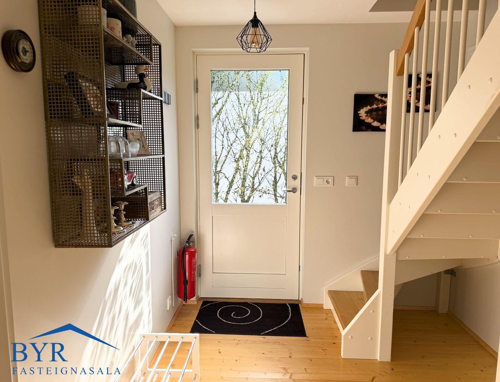 Nánari lýsing:Forstofa/hol með fatahengi, þaðan liggur stigi upp á svefnloft. Búrskápur er aftan við stiga, hitakútur (200L) er undir stiga.