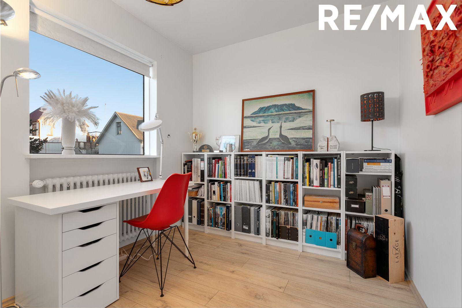 Geymsla/vinnuherbergi: stigi niður liggur frá forstofu þar sem er sér geymsla (9,8 m²), einnig nýtt sem vinnuherbergi.