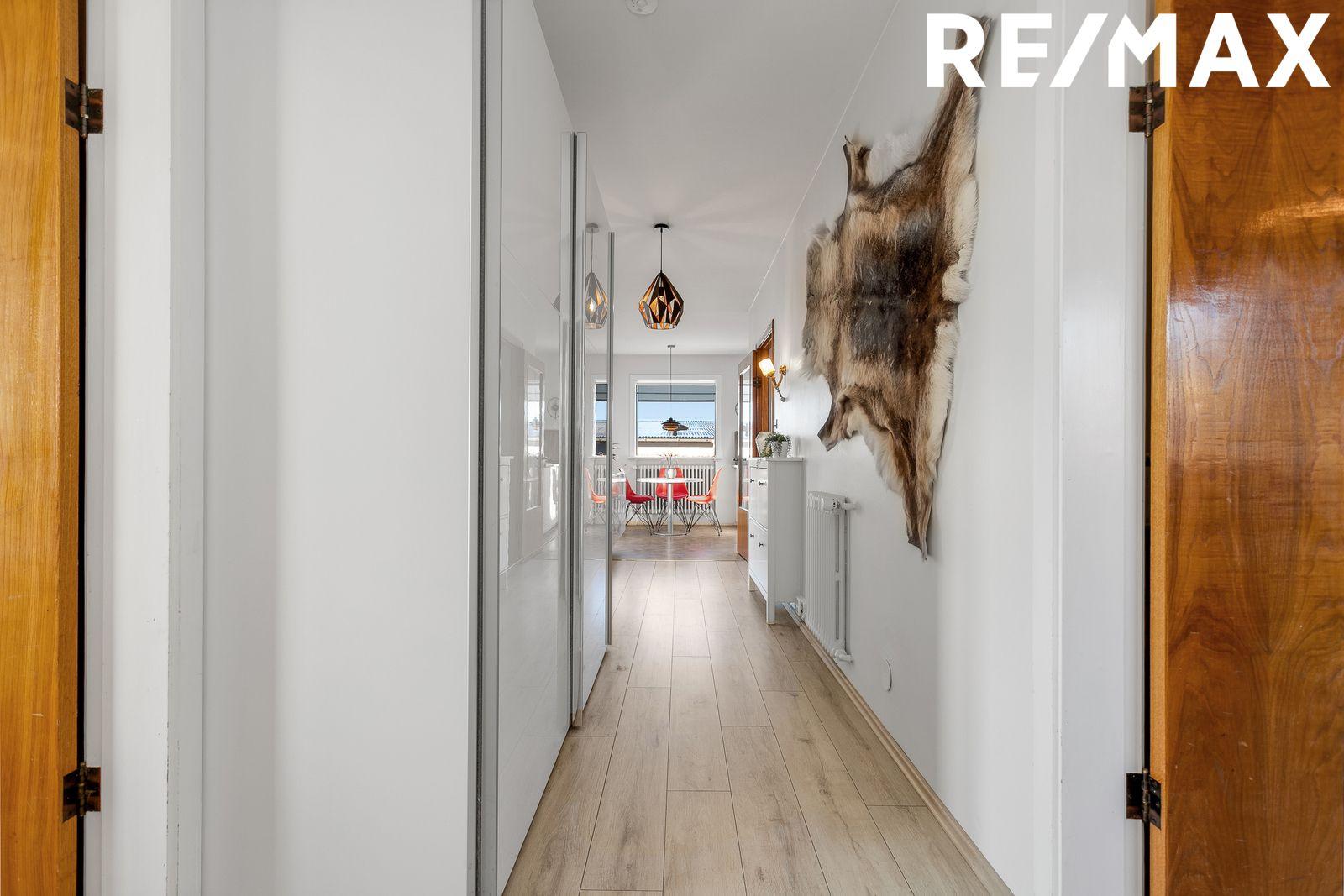 Gangur: er bjartur og rúmgóður með stórum fataskáp. Á gangi eru tvö svefnherbergi, hjóna- og barnaherbergi, og baðherbergi.