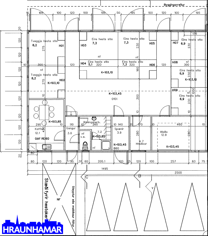 Eignin skiptist m.a. þannig: Rúmgott hesthúsið innréttað í dag fyrir 16 hesta í rúmgóðum eins og tveggja hesta stíum. Rúmgóð hlaða með innk.dyrum. Góð hnakka og reyðtygjageymsla, góð búningsaðstaða sem og góð snyrting, björt og rúmgóð kaffistofa. Gerðið er afar rúmgott, fínt aðgengi er að húsinu. Húsið er velmokað. (4 innk.dyr) Góð lofthæð er í húsinu, vandaðar stíur, plast og ryðfrítt efni í milligerðum og frontum. Hiti í gólfum og ofnar líka. Fín vifta er í hesthúsinu. Rúmgóðir fóðurgangar, gott pláss til að leggja á og járna. Stórt sérgerði. Allt sér.
