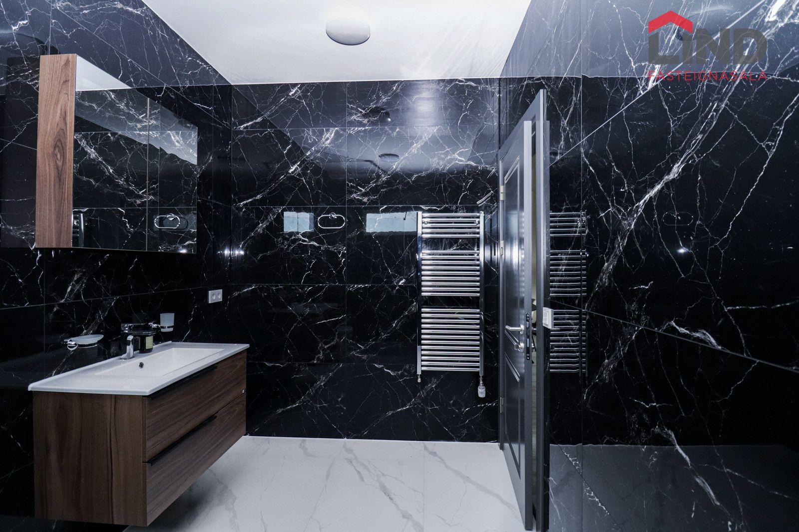 Baðherbergi: Rúmgóð, svartar 120x60 flísar í marmaraútliti, upphengt salerni, dökk viðarlituð innrétting með hvítri borðplötu, sturta með gleri, speglaskápur.