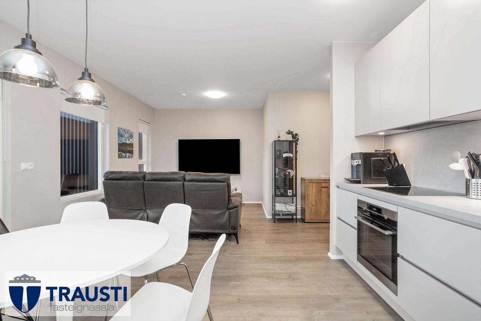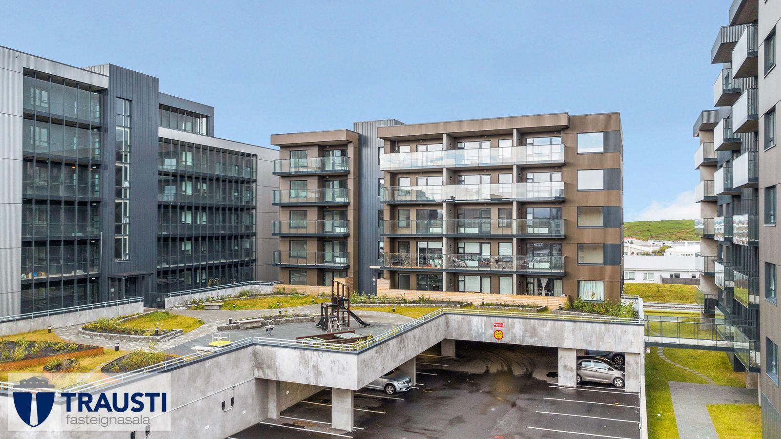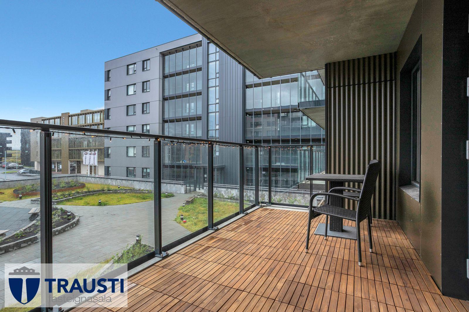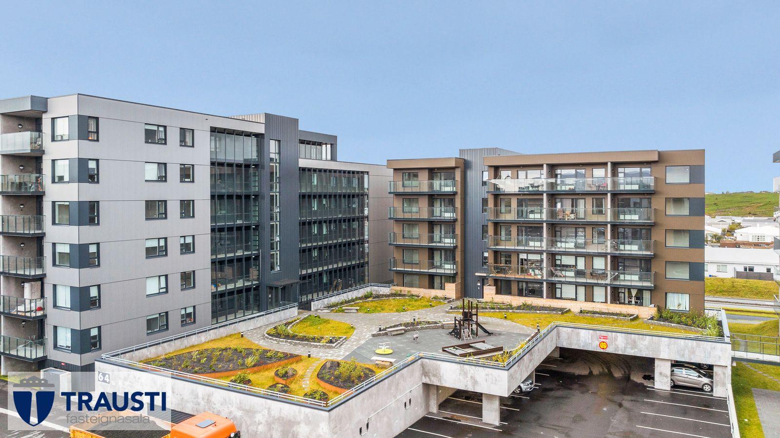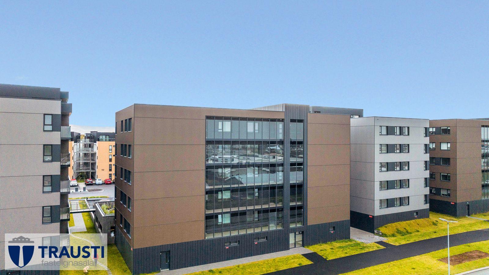 Eignin er alls 72,6 fm að stærð á og er á 2. hæð í góðu lyftuhúsi. Íbúðin sjálf sem er ákaflega björt og falleg, er skráð 65,8fm og skiptist í anddyri, alrými með eldhúsi og stofu með útgengi út á svalir, eitt svefnherbergi, glæsilegt flísalagt baðherbergi með þvottaaðstöðu og sér geymslu í sameign skráð 6,8 fm. Innréttingar eru sérlega vandaðar og eru frá þýska framleiðandanum Nobilia. Bætt hefur verið við innréttingareiningu í eldhúsið til stækkunar og aukins geymslupláss. Búið er að tengja rafmagn fyrir hleðslustöð. Íbúðin getur verið laus strax.