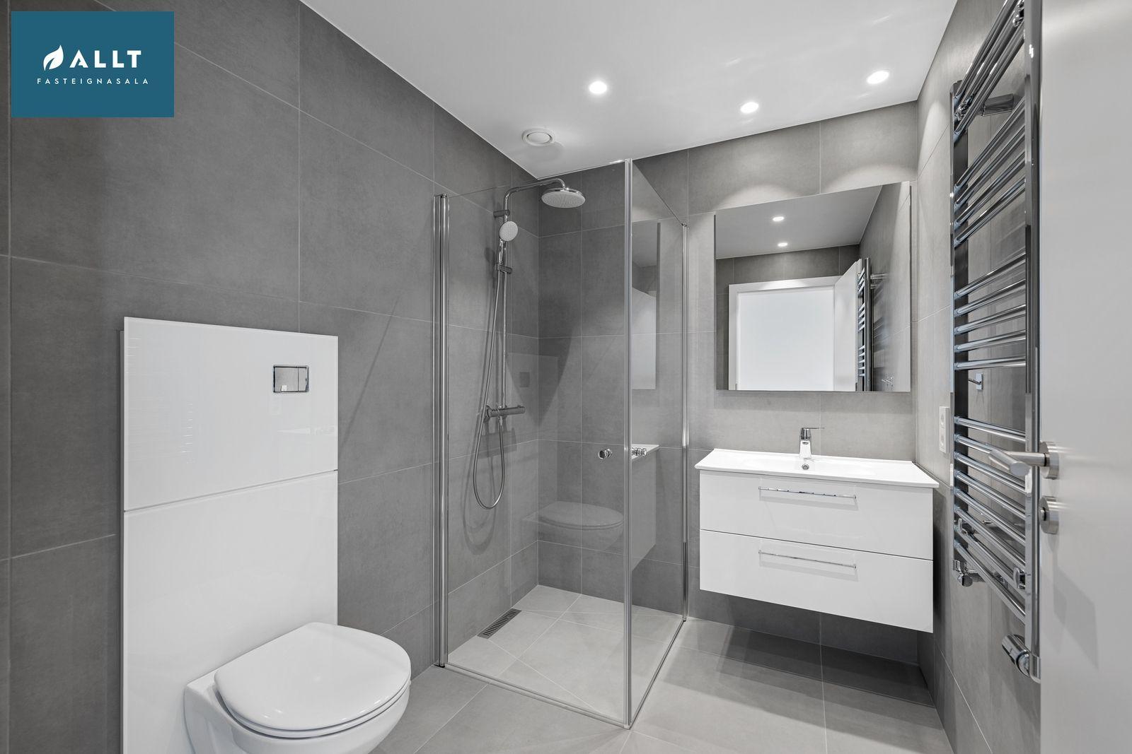 Baðherbergið er flísalagt. Sturta með sturtugleri, upphengt salerni, vaskur með hvítri innréttingu ásamt handklæðaofni.