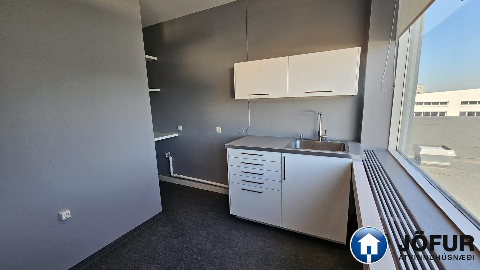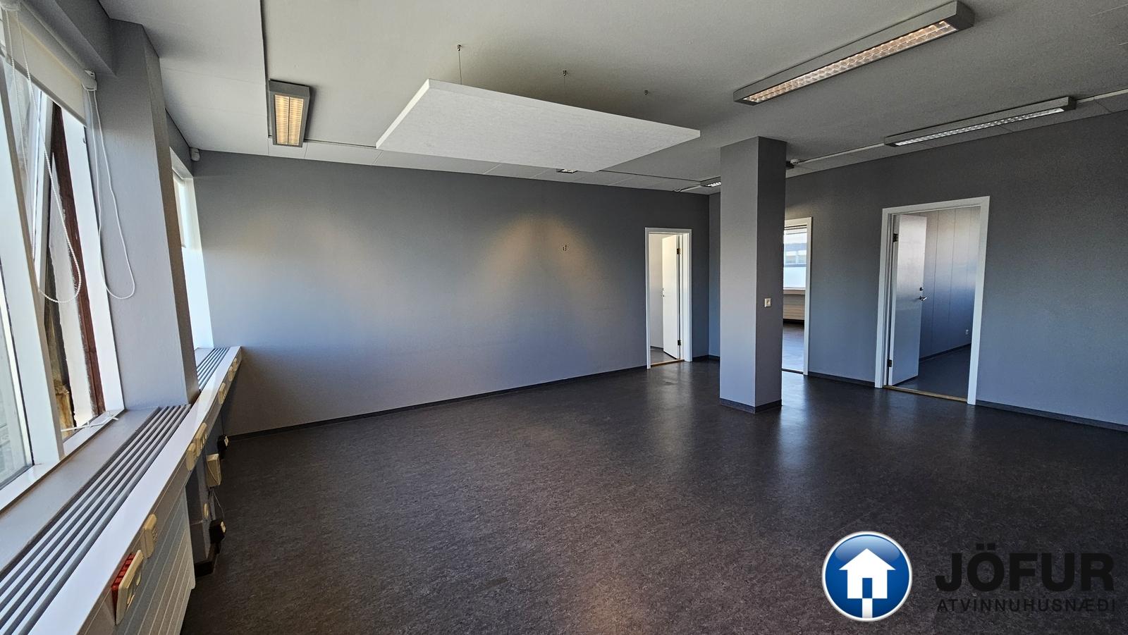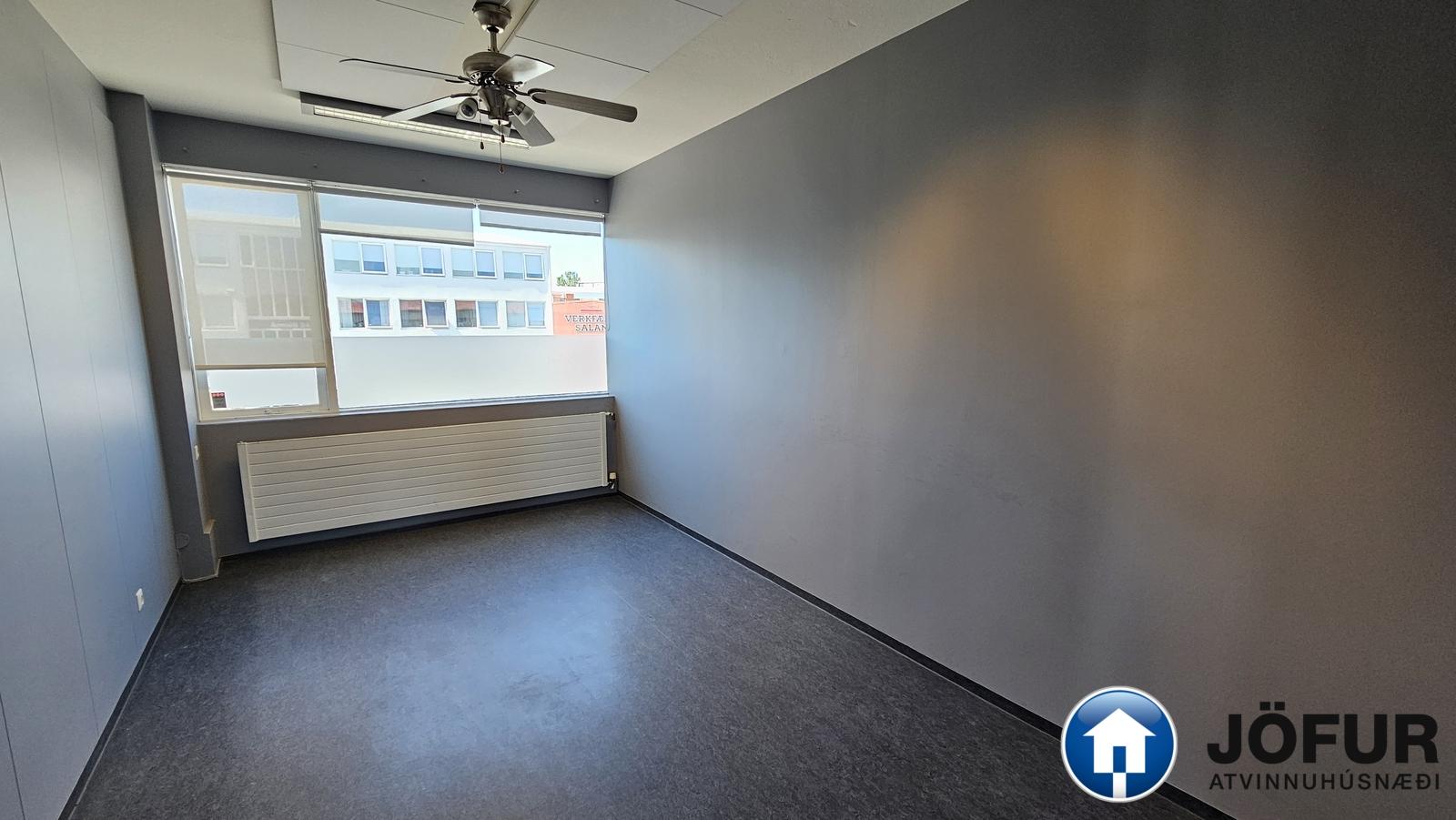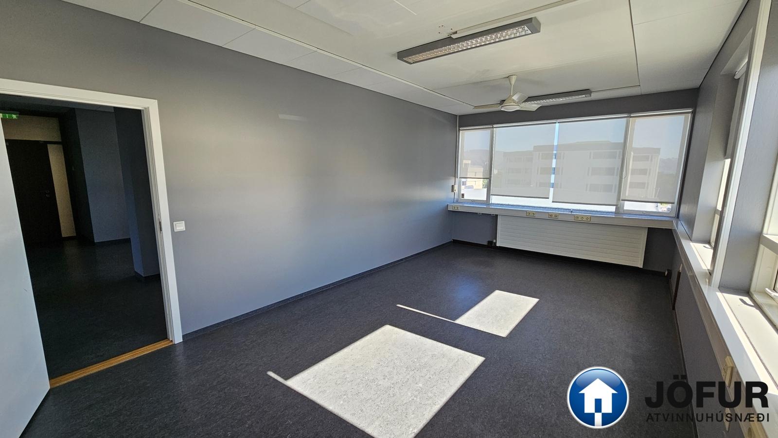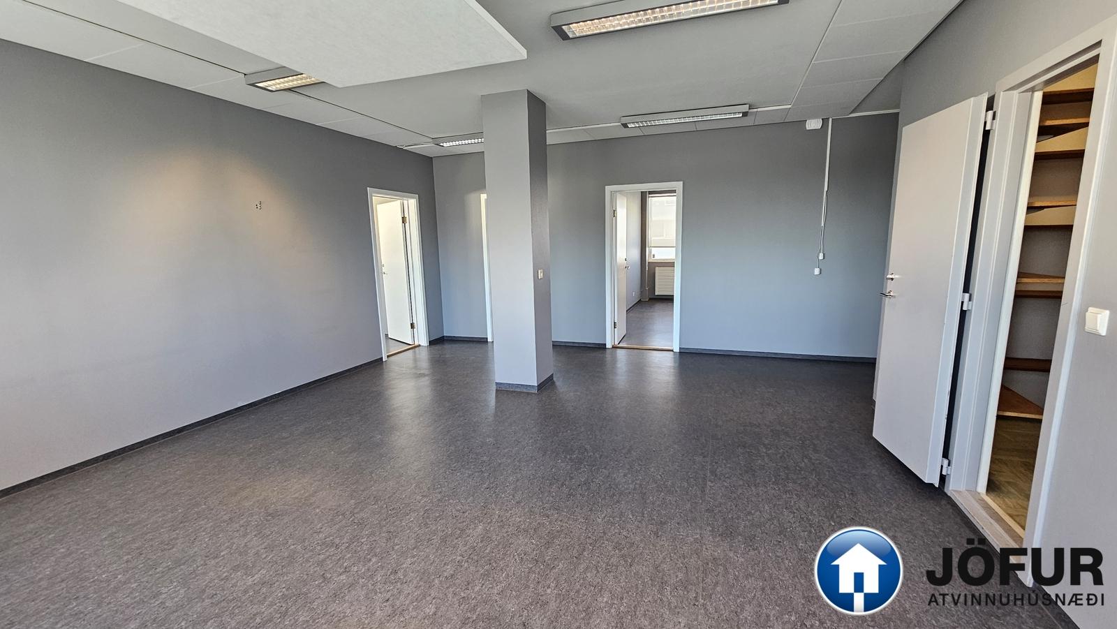 Þrjú lokuð herbergi og opinn salur með kaffikrók. Salerni eru í sameign. Ekki vsk húsnæði.