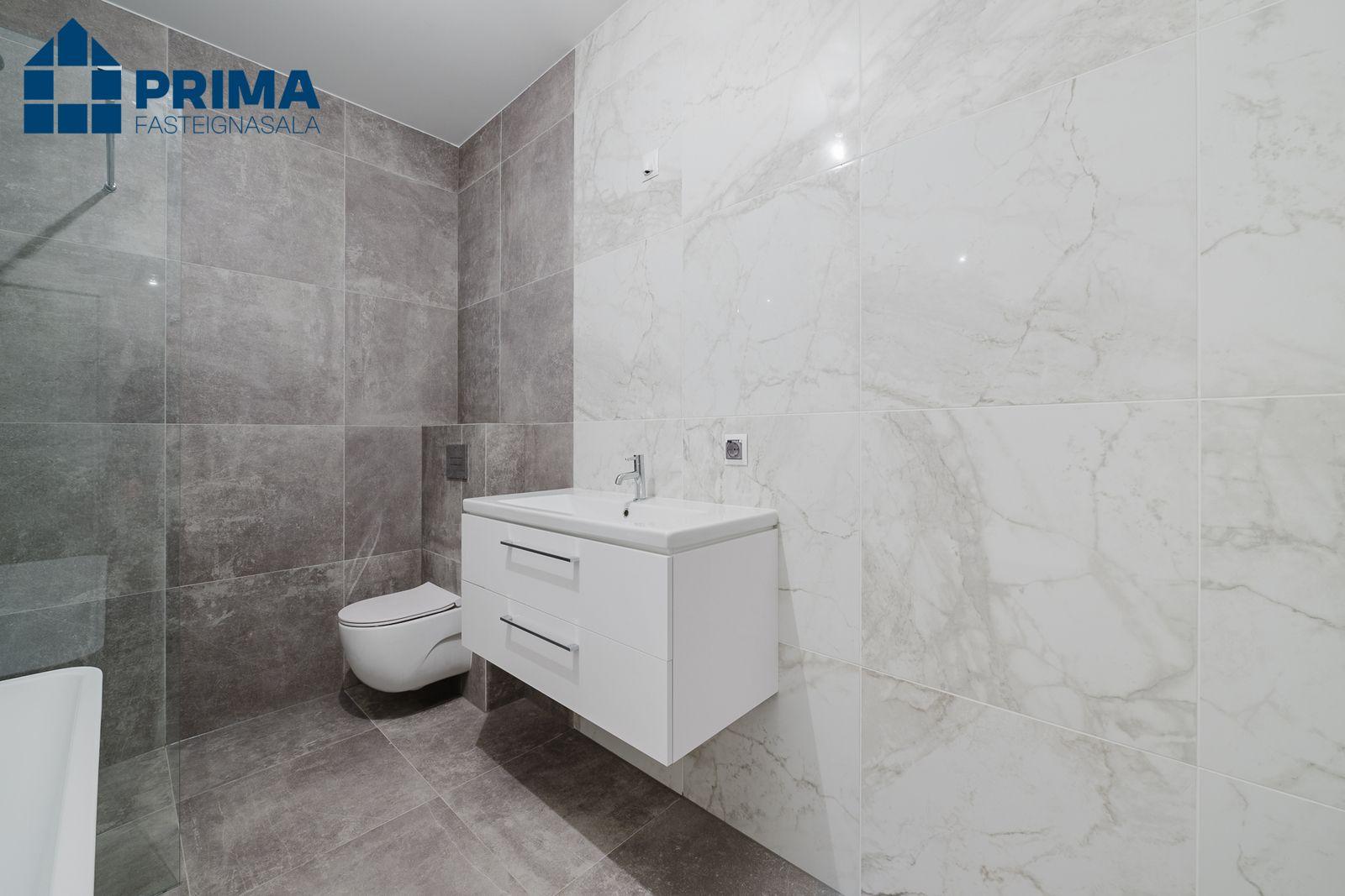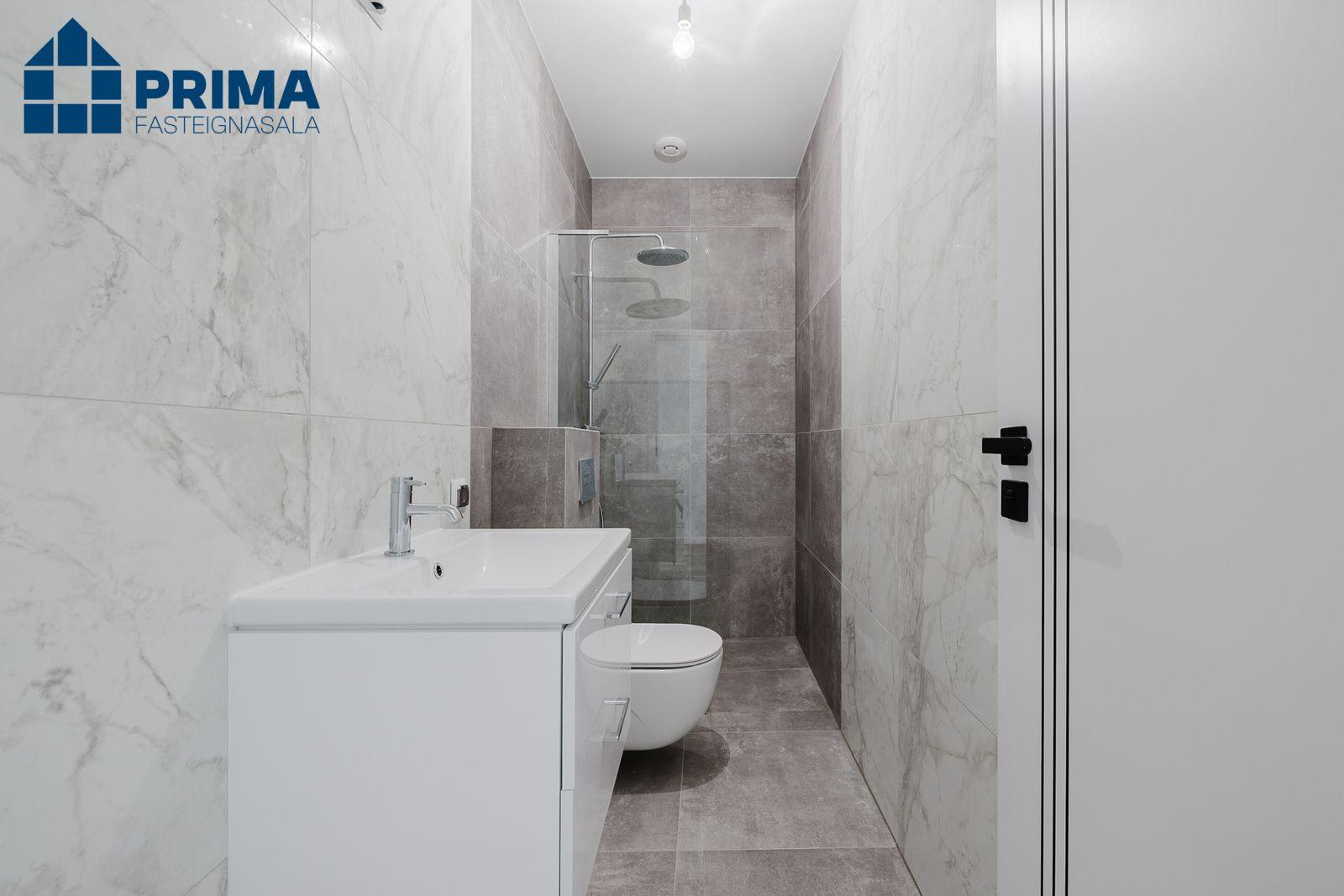 Flísar á baðherbergjum og geymslu eru 60x60 flísar.