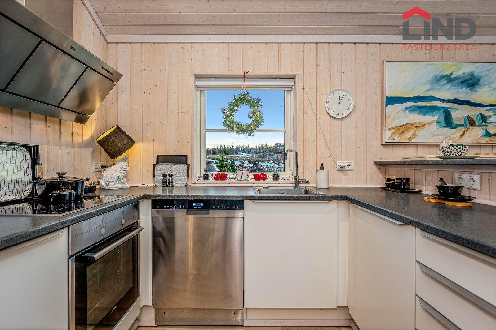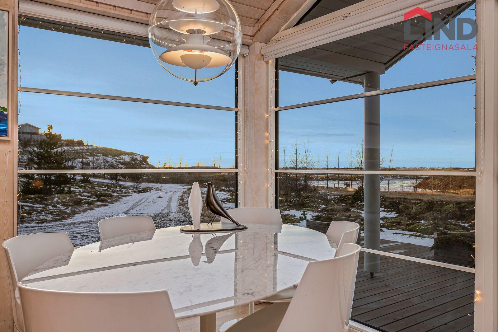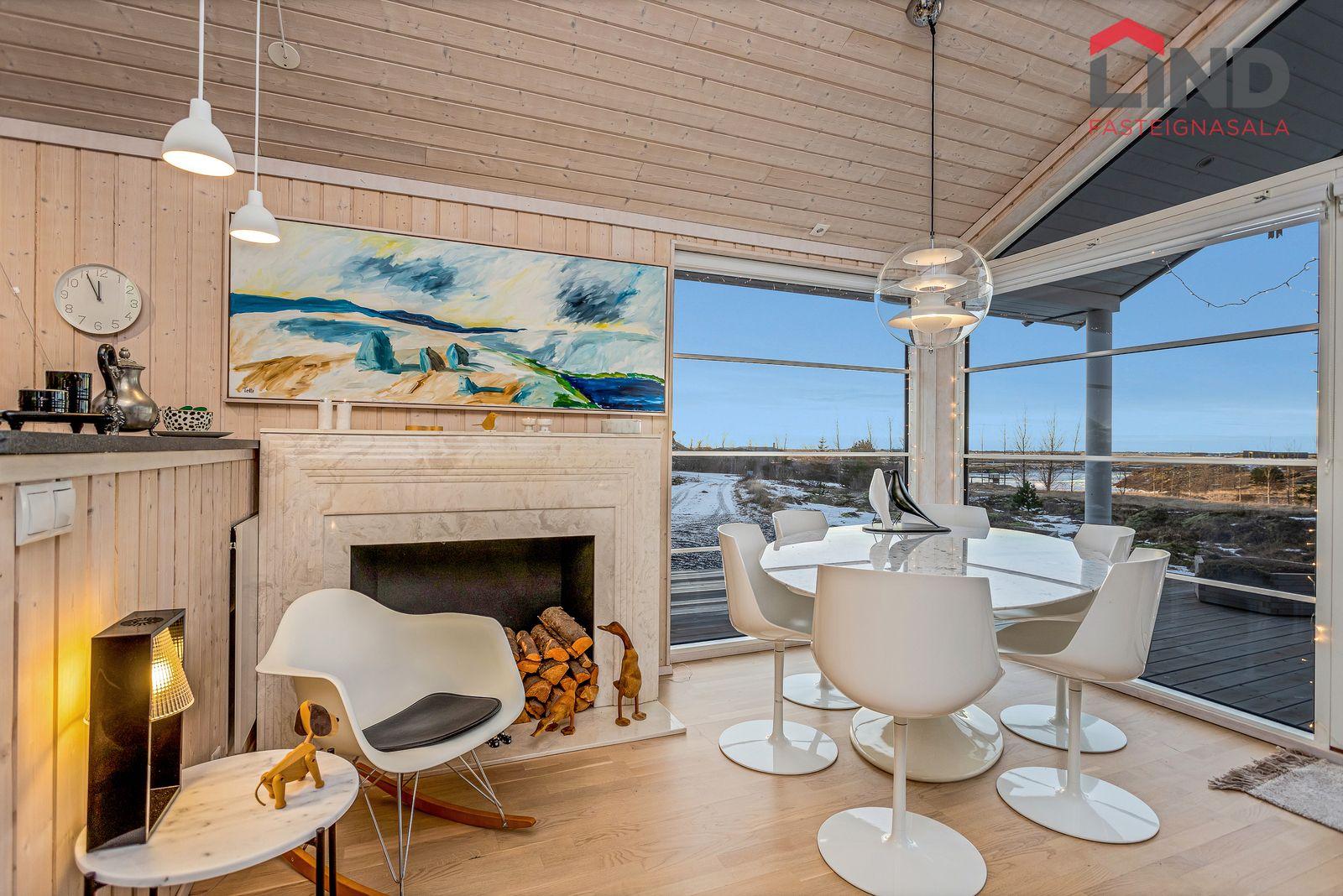 Stofa og borðstofa er í björtu og opnu rými með frábæru útsýni, kamínu og (cosý horni) sem kemur út frá stofu.