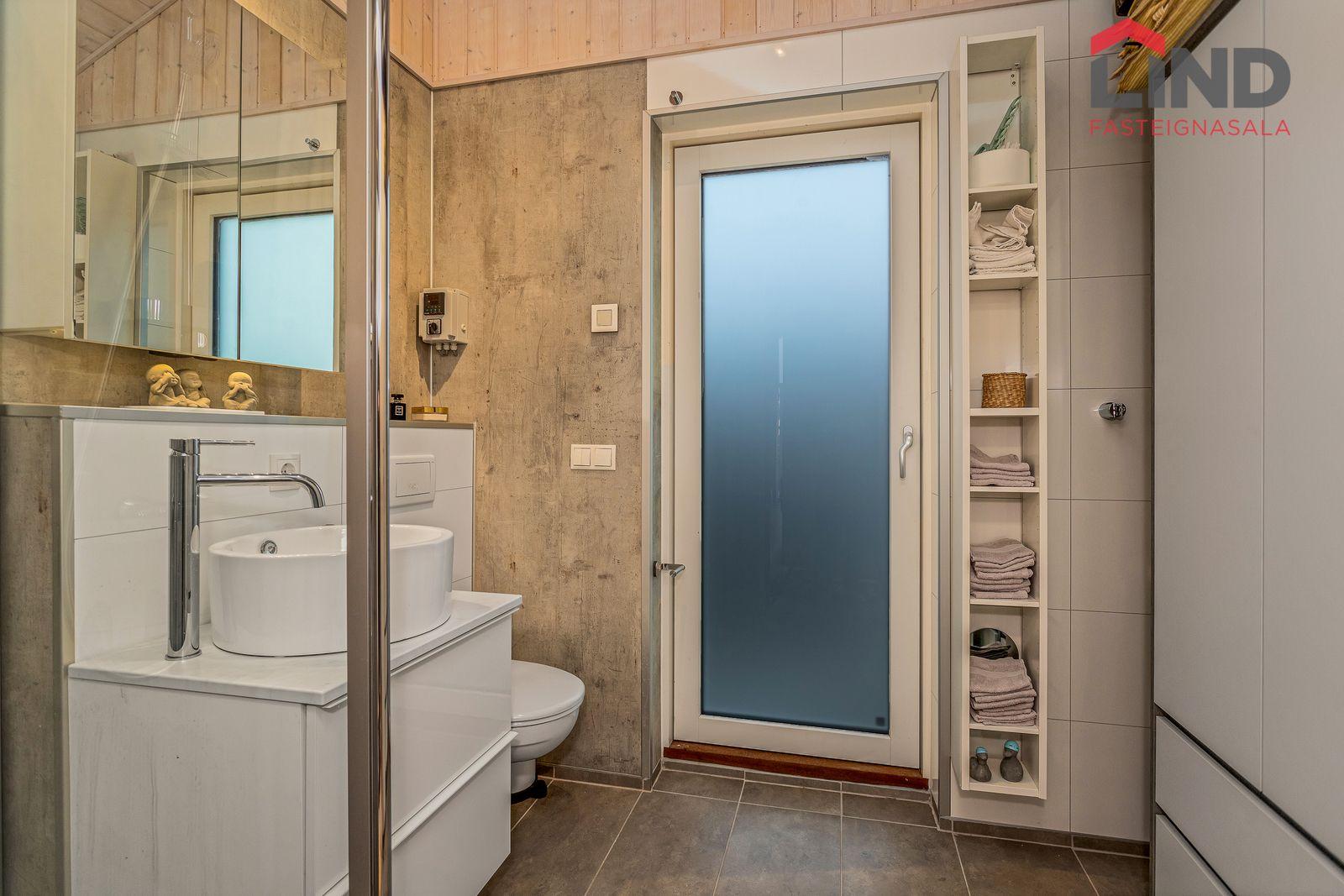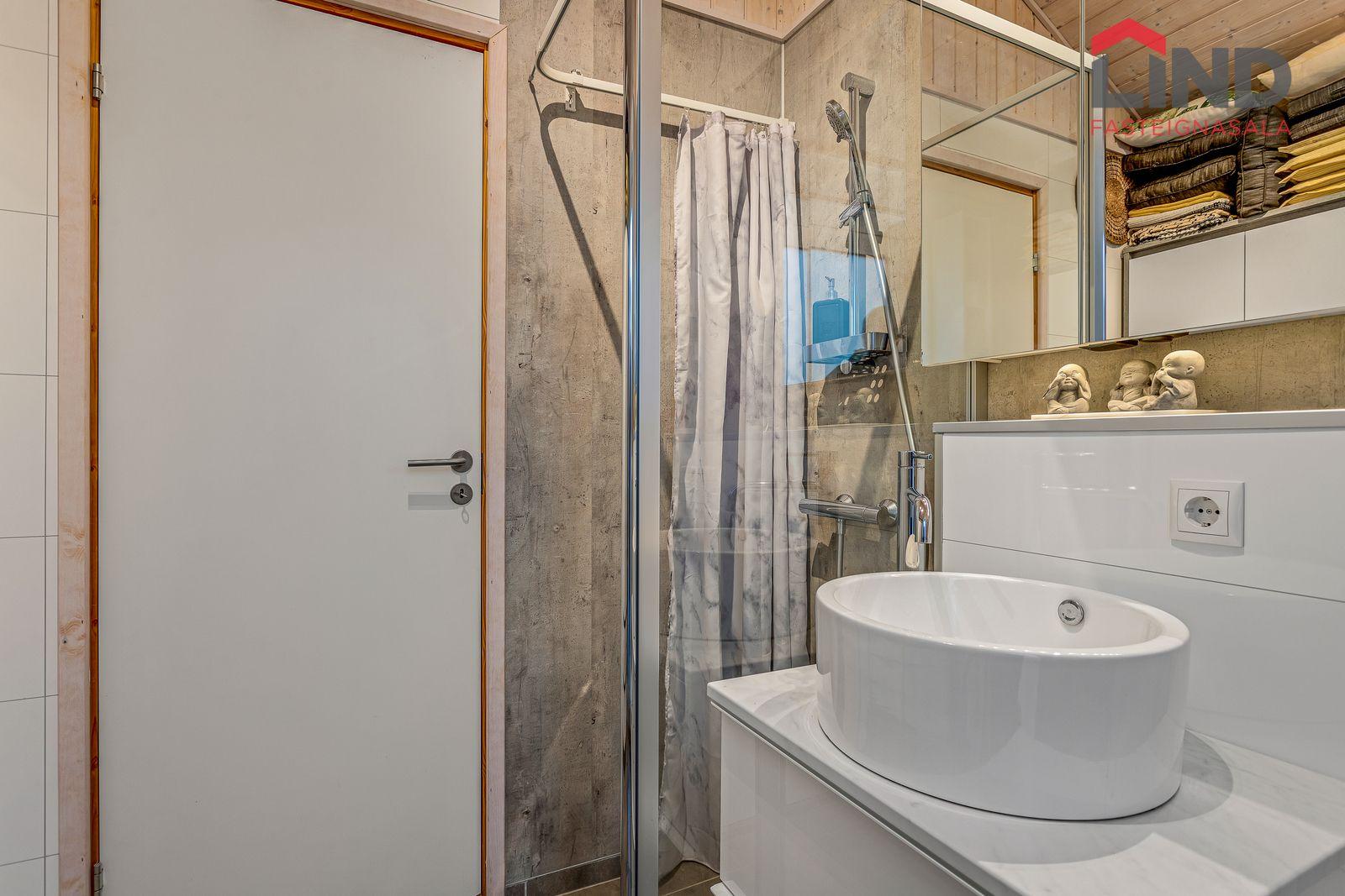 Baðherbergið er flísalagt með walk-in sturta, og snyrtilegri innréttingu og upphengdu salerni. Baðkar var áður þar sem að skápur er í dag og eru blöndunartæki til staðar sem koma út úr veggnum ef að kaupandi myndi vilja setja baðkar aftur í framtíðinni er allt klárt fyrir það.
