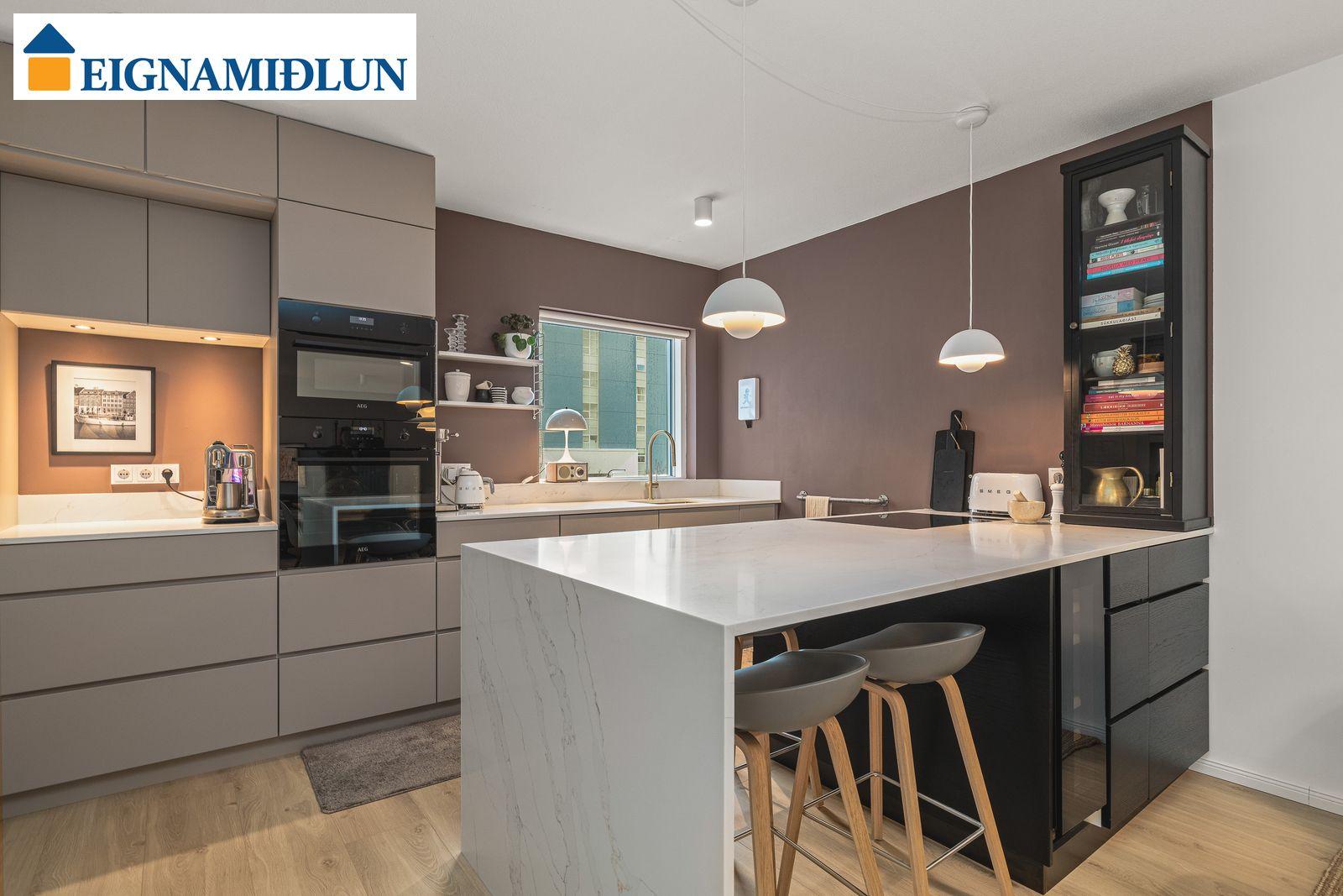Nánari lýsing eignarinnar: SÉRINNGANGUR AF SVALAGANGI. FORSTOFA: Forstofa er með stórum skápum, flísalögð. GANGUR: Parketlagður gangur me nýlegu harðparketi. HERBERGI I: Rúmgott herbergi með nýjum skápum, nýlega teppalagt. HERBERGI II: Rúmgott herbergi með nýjum skápum, nýlega teppalagt HERBERGI III: Hjónaherbergi með stórum skápum, nýlega teppalagt. GESTASNYRTING/ÞVOTTAHÚS: Gestasnyrting er með nýrri innréttingu fyrir þvottavél og þurrkara, efri skápar og útdraganlegar skúffur. Útdraganleg vinnuborð eru í innréttingu. BAÐHERBERGI: Baðherbergi er flísalagt, ný innrétting, nýtt sturtubaðkar með gleri, handklæðaofn, vegghengt salerni. ALRÝMI: Rúmgott parketlagt alrými þar sem er STOFA, gengið út á svalir sem eru yfirbyggðar. ELDHÚS: Nýleg vönduð innrétting með nýjum vönduðum tækjum, steinn á borðum, eldaeyja sem hægt er að sitja við, innfelldur ísskápur, sérfrystir og vínkælir . Opið yfir í stofuna. SAMEIGN: Í sameign er rúmgóð sérgeymsla fyrir íbúðina og sameiginleg hjóla og vagnageymsla, innaf er dekkja og húsgagnageymsla ásamt því að innangengt er í bílageymslu þar sem íbúðin á sérmerkt stæði.