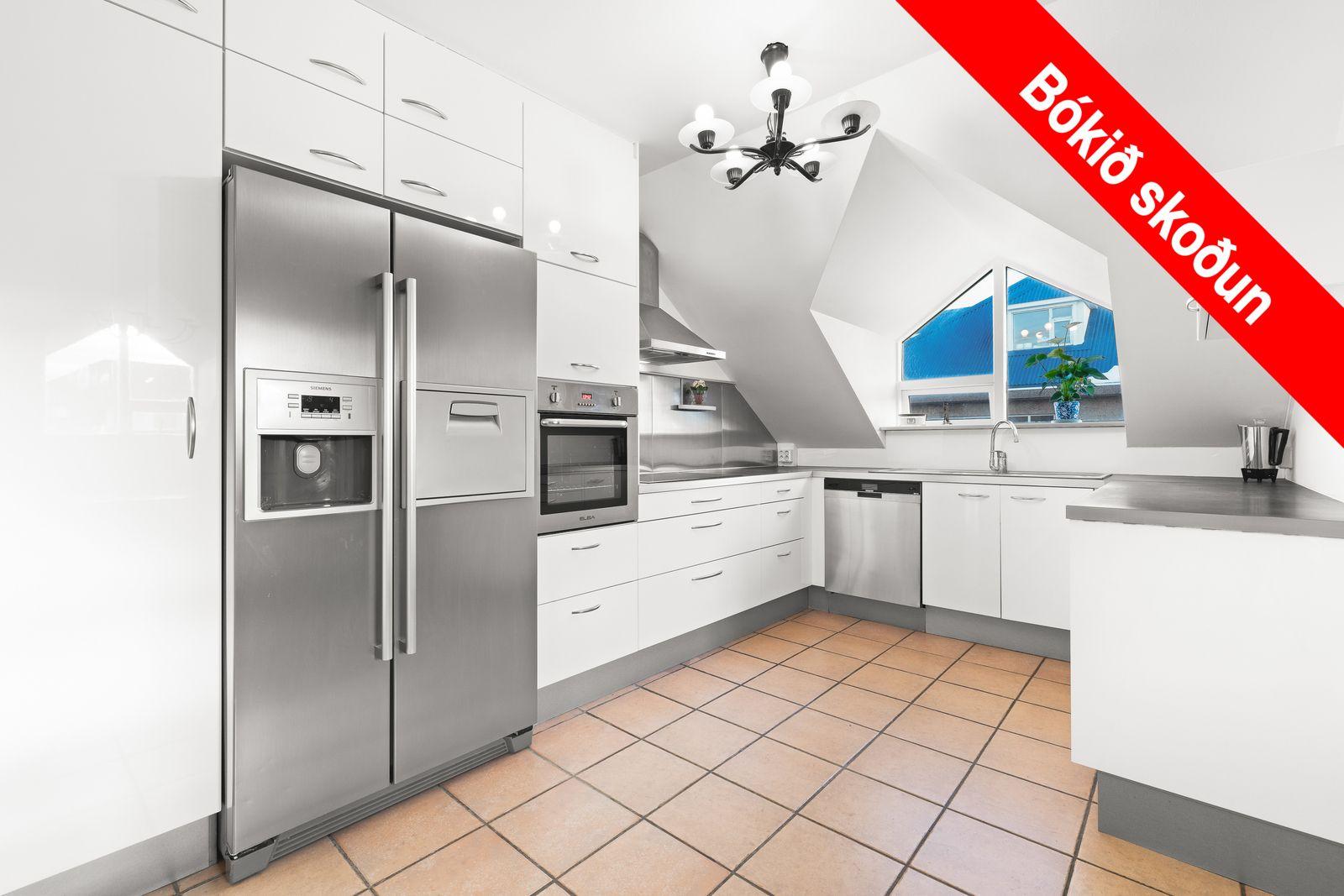 Eldhúsið er fallegt með hvítri rúmgóðri innréttingu, mjög vel skipulagt með stórum vaski og tvöföldum ísskáp sem fylgir með ásamt nýlegri Siemens uppþvottavél. Flísar á gólfi.
