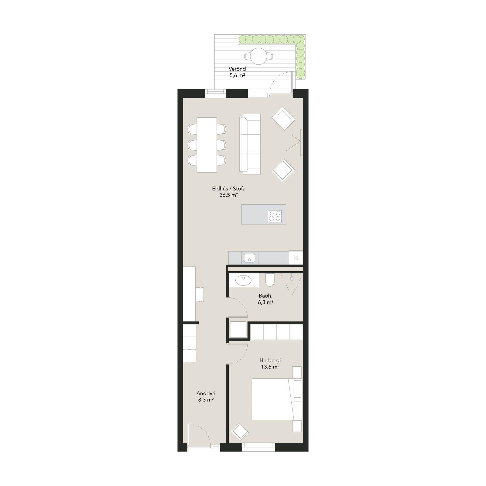 Nánari lýsing: Forstofa er með flísum á gólfi og góðum fataskáp. Svefnherbergi I: Gott svefnherbergi með fataskáp. Svefnherbergi II: Gott svefnherbergi með fataskáp. Baðherbergi með Walk-in sturtu, flísum á gólfi og á hluta af veggjum. Handklæðaofn, upphengt salerni, baðinnrétting með handlaug og spegil. Tengi fyrir þvottavél og þurrkara. Stofa, borðstofa og eldhús er opnu og björtu alrými með góðum glugga, útgengi út á svalir sem snúa í suður. Eldhús er með vandaða innréttingu, gott skápa- og skúffu pláss, bökunarofn í vinnuhæð, helluborð, innbyggð uppþvottavél og innbyggður ísskápur með frystir. Geymsla í sameign.