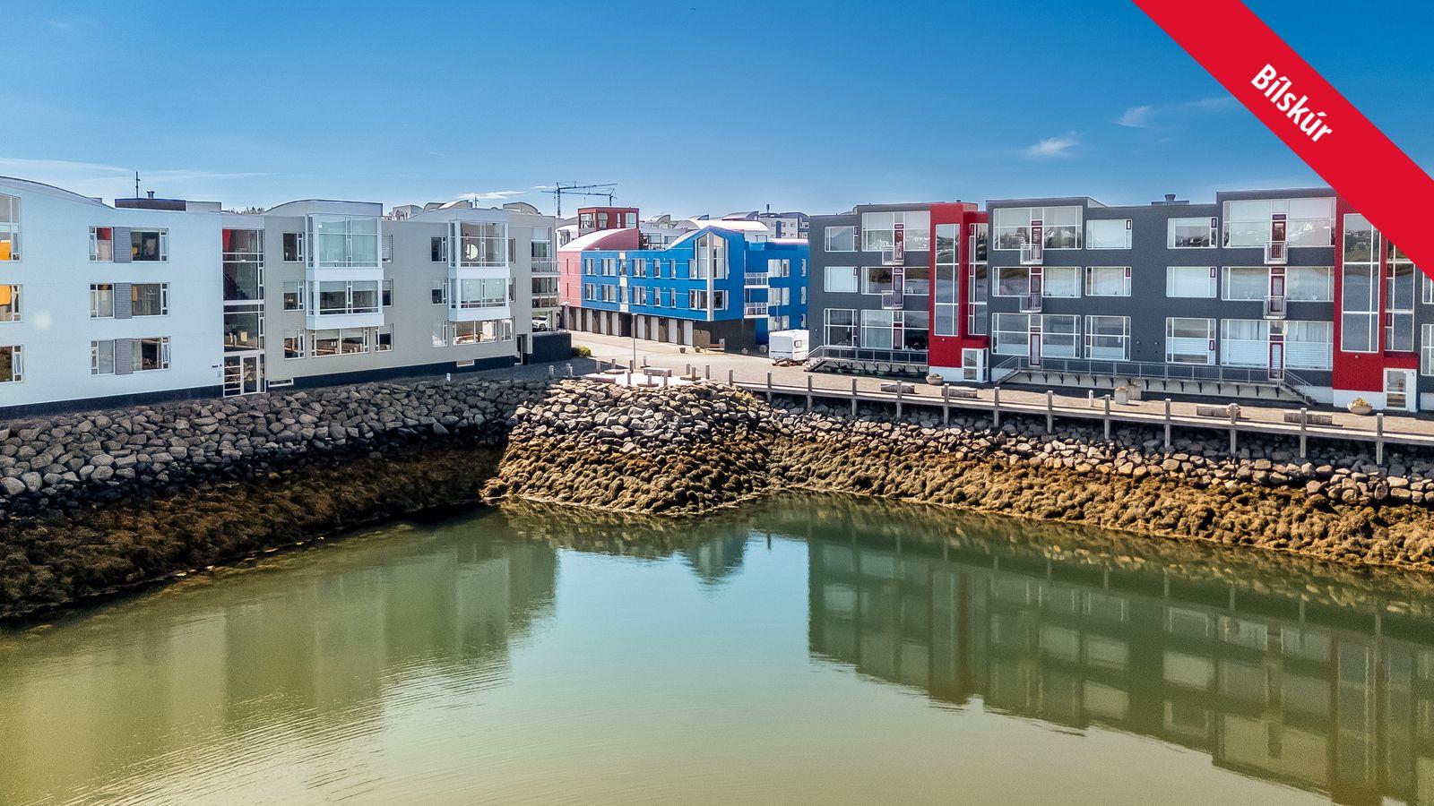 Komið er inn í rúmgóða sameign. Gengið er inn í forstofu með fataskáp. Stofa, borðstofa og eldhús eru í samtengdu rými með stórum gluggum. Stór björt stofa með útgang út á sólríkar svalir með góðu útsýni. Eldhús hálf opið með borðkrók. Eldhúsinnrétting með góðu skápaplássi, stein í borðplötu, nýlegum vaski, nýl. blöndunartækjum, nýl vaski og span helluborði. Steinn milli efri og neðri skápa í eldhúsinu. Stofan er björt. Fjórir stórir gluggar eru í rýminu ásamt svaladyrum. Gengið úr stofu út á svalir. Tvö svefnherbergi með fataskápum. Baðherbergi flísalagt með baðkari og sturtu. Nýr vaskur og blöndunartæki. Þvottahús innan íbúðar. Parket er á öllum gólfum, bæði á stofum, gangi og herbergjum. Flísar á baði. Á jarðhæð hússins geymslan. Upphitað plan er fyrir framan bílskúrinn. Vönduð eign á eftirsóttum stað.