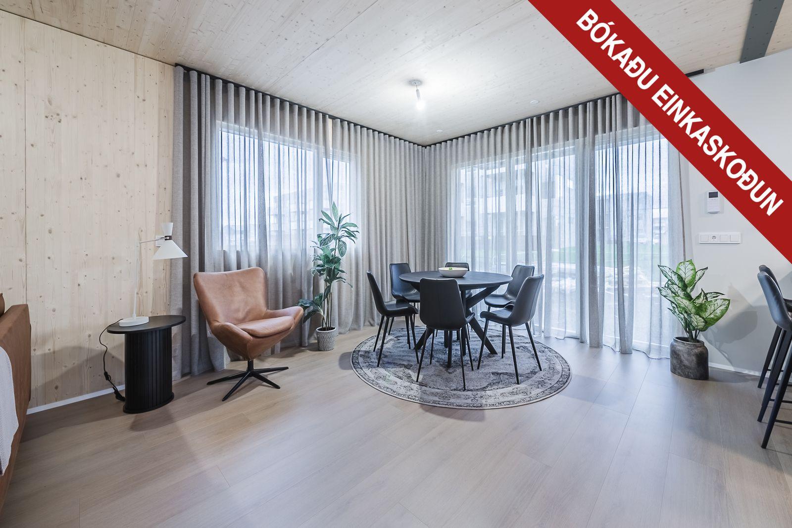 Íbúðum er skilað fullbúnum með innréttingum samkvæmt skilalýsingu en án gólfefna að undanskildu anddyri, baðherbergjum, þvottahúsi og geymslu innan íbúðar sem eru flísalögð. Allar innréttingar eru sérsmíðaðar frá VOKE-3. Gólfhiti er á neðri hæð, á efri hæð er hefðbundið ofnakerfi en gólfhiti á baðherbergi. Útveggir og hluti innveggja innan íbúða eru úr krosslímdum timbureiningum (CLT) , yfirborð þeirra verður annarsvegar sýnilegt CLT (langveggur í stofu og aðliggjandi veggur móts við stofu ásamt gluggavegg í samliggjandi svefnherbergjum á efri hæð) og hins vegar gifsklætt, spartlað og málað. Allt sýnilegt CLT er ómeðhöndlað. Aðrir innveggir eru úr blikkstoðum, klæddir með gifsi og eru spartlaðir og málaðir. Veggir eru málaðir í ljósum lit. Veggir á böðum sem verða flísalagðir eru klæddir baðplötum. Timbur límtréssúlur við inngarð eru sýnilegar og ómeðhöndlaðar. Loft eru sýnileg úr ómeðhöndluðum krosslímdum timbureiningum nema í anddyri, geymslum, baðherbergjum og þvottahúsi þar sem verður niðurtekið loft máluð í ljósum lit. Stálbitar í loftum eru sýnilegir í hvítum lit, ral 9016. Hurðir eru hefðbundnar yfirfelldar hurðir. Innihurðir eru sprautulakkaðar hvítar, frá Ebson eða sambærilegt. Gólf á baðherbergjum, þvottahúsi, anddyri og geymslu innan íbúðar eru flísalögð með gæðaflísum í ljósgráum lit stærðinni 60x60cm. Öðrum rýmum íbúðar er skilað án gólfefna.