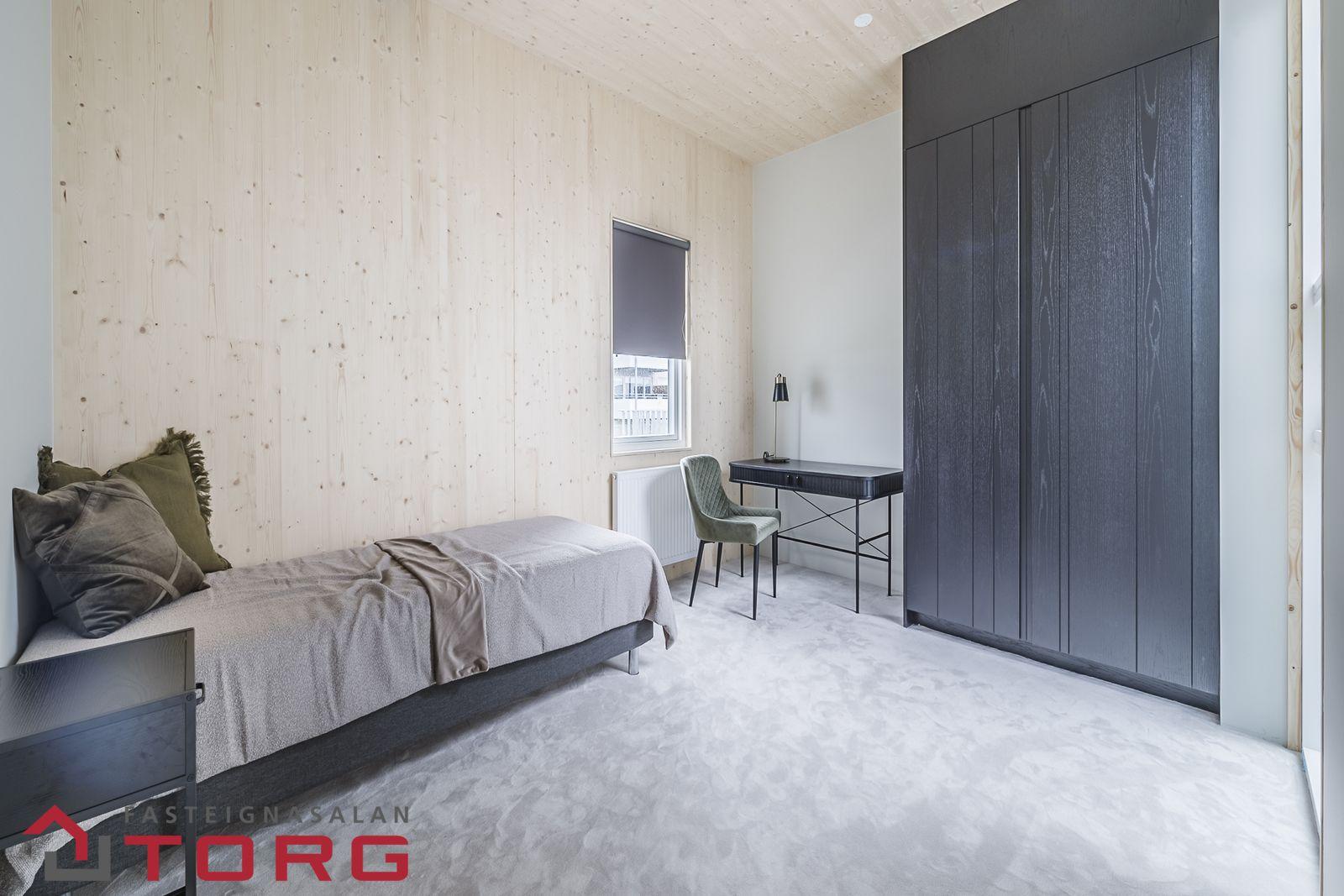 Búið er að innrétta húsið og setja upp fimmta svefnherbergið, þar sem sjónvarpsstofa er sýnd á teikningu. Dökk : Perfect Matte Laminated MDF (Egger U999 PM)