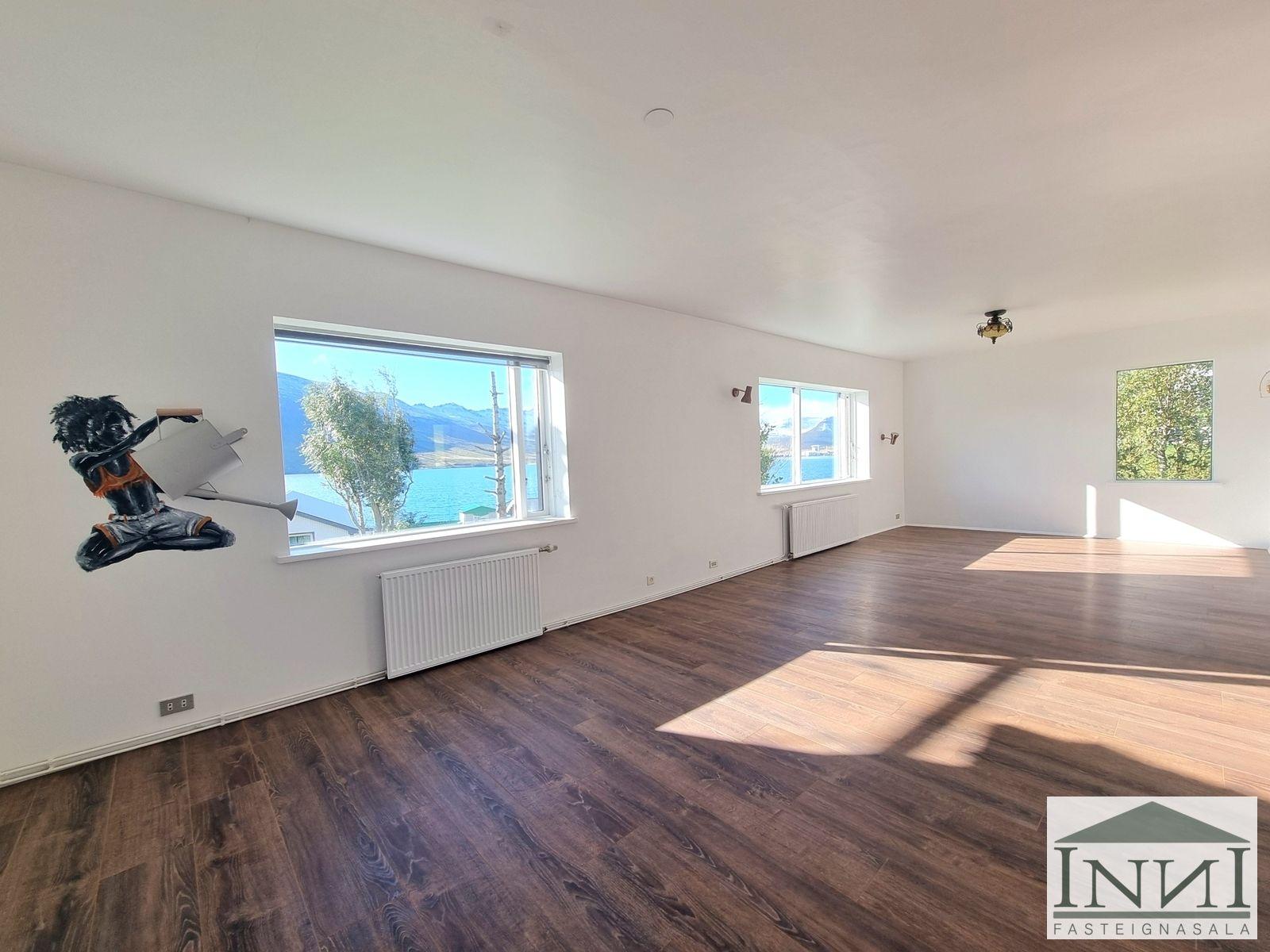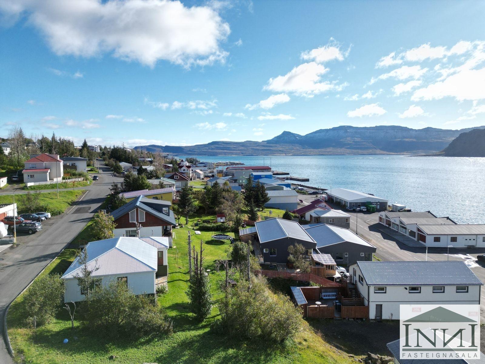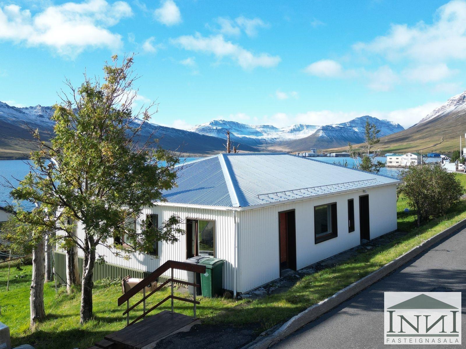 Fjögurra herbergja einbýlishús ásamt bílskúr á fallegum útsýnisstað í Neskaupstað. Íbúðarhús er 123,3 m² og bílskúr 34,4 m². Samtals 157,7 m². Stofa er rúmgóð og björt með parket á gólfi og mjög góðu útsýni. Flísar eru í eldhúsi, þar er eldri innrétting. Búr er inn af eldhúsi. Þrjú herbergi eru í húsinu, öll með parket á gólfi. Tvö herbergi eru rúmgóð en eitt fremur lítið sem nýtist líklega best sem vinnuherbergi/skrifstofa. Baðherbergi er flísalagt og með sturtu, innangengt er af baðherbergi í þvottahús. Bílskúr er nokkuð hefðbundinn en hann er óupphitaður. Bílskúrinn er einn af þremur í frístandandi bílskúrslengju við götuna.
