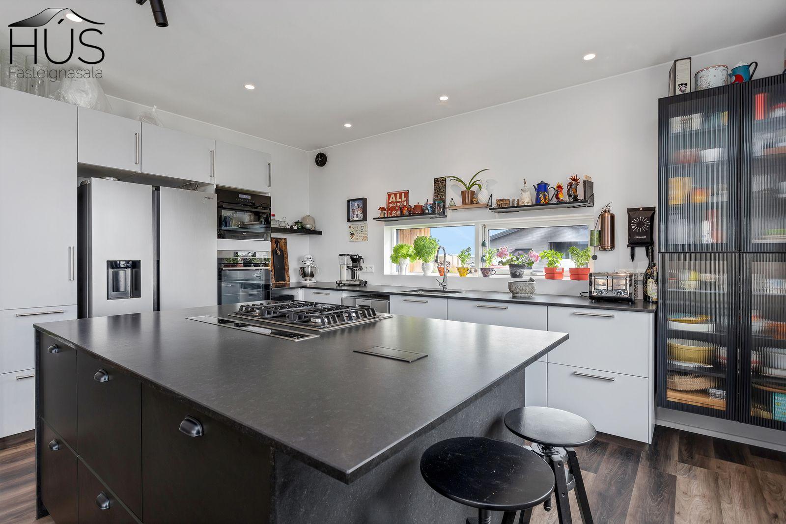 Innra skipulag. Flísalögð forstofa með fataskáp. Stór stofa,borðstofa og eldhús í opnu rými. Hurð úr stofu á sólpall til suðurs. Stór eldhúsinnrétting með granít borðplötu. 5 hellu gaseldavél í eyju og borðháfur með rafmagni. Vönduð tæki og vínskápur. Sjónvarpshol er framan við herbergin. Þrjú góð svefnherbergi, baðherbergi flísalagt með sturtu og innréttingu. Stórt hjónaherbergi/hjónasvíta með fataherbergi og stóru flísalögðu baðherbergi með baðkari og sturtu. Hurð út á sólpall. Flísalagt þvottahús með stórri innréttingu og hurð út í garð. Innangengt í bílskúr. Bílskúr er með breiðri aksturshurð og gönguhurð.